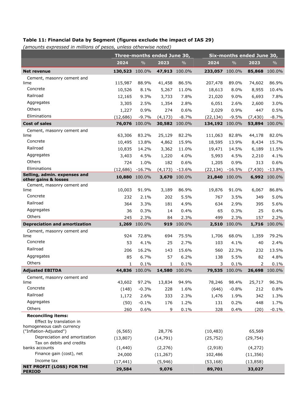 Table 11: Financial Data by Segment (figures exclude the impact of IAS 29) (amounts expressed in millions of pesos, unless otherwise noted) Three-months ended June 30, Six-months ended June 30, 2024 % 2023 % 2024 % 2023 % Net revenue 130,523 100.0% 47,913 100.0% 233,057 100.0% 85,868 100.0% Cement, masonry cement and lime 115,987 88.9% 41,458 86.5% 207,478 89.0% 74,602 86.9% Concrete 10,526 8.1% 5,267 11.0% 18,613 8.0% 8,955 10.4% Railroad 12,165 9.3% 3,733 7.8% 21,020 9.0% 6,693 7.8% Aggregates 3,305 2.5% 1,354 2.8% 6,051 2.6% 2,600 3.0% Others 1,227 0.9% 274 0.6% 2,029 0.9% 447 0.5% Eliminations (12,686) -9.7% (4,173) -8.7% (22,134) -9.5% (7,430) -8.7% Cost of sales 76,076 100.0% 30,582 100.0% 134,192 100.0% 53,894 100.0% Cement, masonry cement and lime 63,306 83.2% 25,129 82.2% 111,063 82.8% 44,178 82.0% Concrete 10,495 13.8% 4,862 15.9% 18,595 13.9% 8,434 15.7% Railroad 10,835 14.2% 3,362 11.0% 19,471 14.5% 6,189 11.5% Aggregates 3,403 4.5% 1,220 4.0% 5,993 4.5% 2,210 4.1% Others 724 1.0% 182 0.6% 1,205 0.9% 313 0.6% Eliminations (12,686) -16.7% (4,173) -13.6% (22,134) -16.5% (7,430) -13.8% Selling, admin. expenses and other gains & losses 10,880 100.0% 3,670 100.0% 21,840 100.0% 6,992 100.0% Cement, masonry cement and lime 10,003 91.9% 3,189 86.9% 19,876 91.0% 6,067 86.8% Concrete 232 2.1% 202 5.5% 767 3.5% 349 5.0% Railroad 364 3.3% 181 4.9% 634 2.9% 395 5.6% Aggregates 36 0.3% 14 0.4% 65 0.3% 25 0.4% Others 245 2.3% 84 2.3% 499 2.3% 157 2.2% Depreciation and amortization 1,269 100.0% 919 100.0% 2,510 100.0% 1,716 100.0% Cement, masonry cement and lime 924 72.8% 694 75.5% 1,706 68.0% 1,359 79.2% Concrete 53 4.1% 25 2.7% 103 4.1% 40 2.4% Railroad 206 16.2% 143 15.6% 560 22.3% 232 13.5% Aggregates 85 6.7% 57 6.2% 138 5.5% 82 4.8% Others 1 0.1% 1 0.1% 3 0.1% 2 0.1% Adjusted EBITDA 44,836 100.0% 14,580 100.0% 79,535 100.0% 26,698 100.0% Cement, masonry cement and lime 43,602 97.2% 13,834 94.9% 78,246 98.4% 25,717 96.3% Concrete (148) -0.3% 228 1.6% (646) -0.8% 212 0.8% Railroad 1,172 2.6% 333 2.3% 1,476 1.9% 342 1.3% Aggregates (50) -0.1% 176 1.2% 131 0.2% 448 1.7% Others 260 0.6% 9 0.1% 328 0.4% (20) -0.1% Reconciling items: Effect by translation in homogeneous cash currency ("Inflation-Adjusted") (6,565) 28,776 (10,483) 65,569 Depreciation and amortization (13,807) (14,791) (25,752) (29,754) Tax on debits and credits banks accounts (1,440) (2,276) (2,918) (4,272) Finance gain (cost), net 24,000 (11,267) 102,486 (11,356) Income tax (17,441) (5,946) (53,168) (13,858) NET PROFIT (LOSS) FOR THE PERIOD 29,584 9,076 89,701 33,027