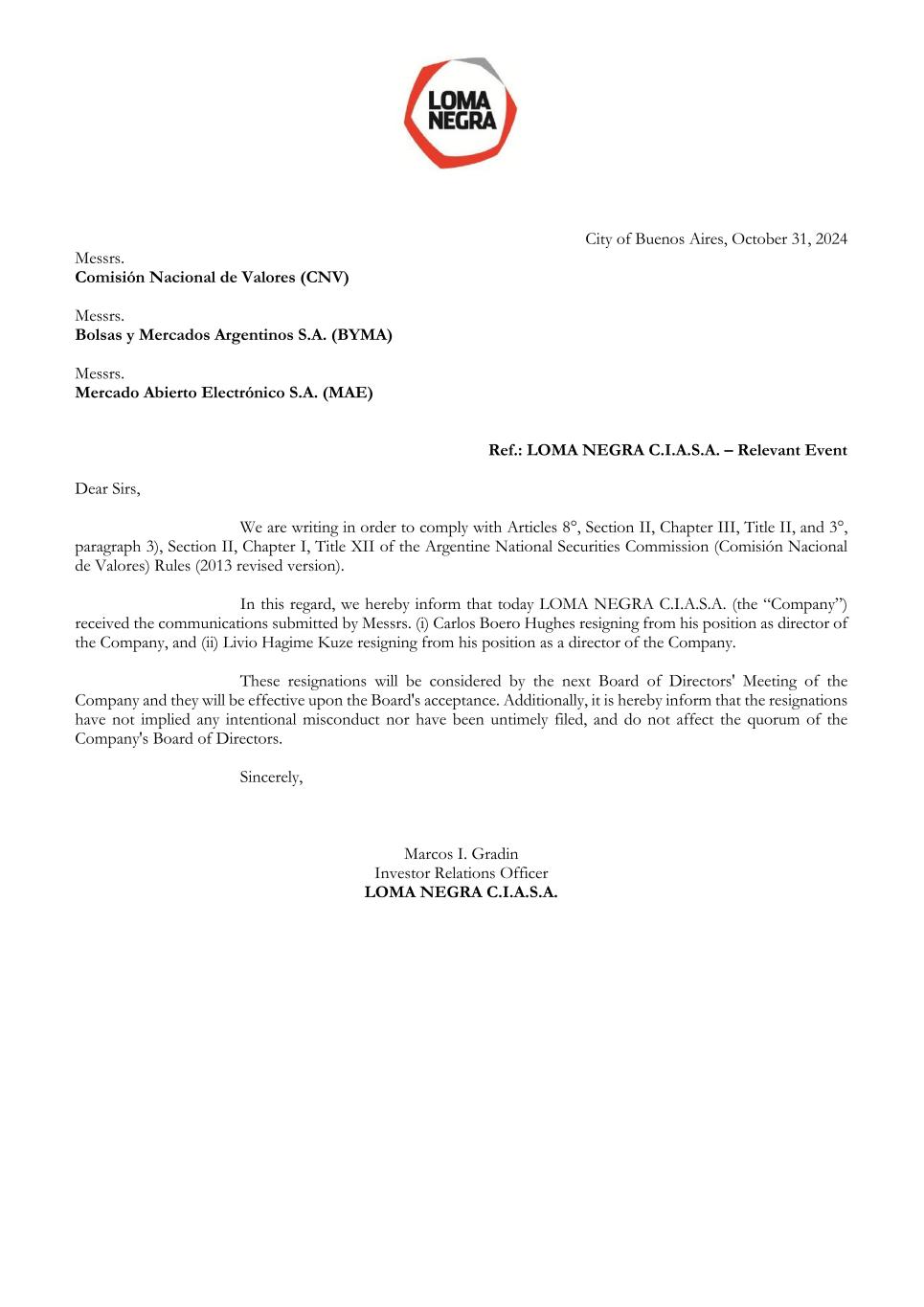City of Buenos Aires, October 31, 2024 Messrs. Comisión Nacional de Valores (CNV) Messrs. Bolsas y Mercados Argentinos S.A. (BYMA) Messrs. Mercado Abierto Electrónico S.A. (MAE) Ref.: LOMA NEGRA C.I.A.S.A. – Relevant Event Dear Sirs, We are writing in order to comply with Articles 8°, Section II, Chapter III, Title II, and 3°, paragraph 3), Section II, Chapter I, Title XII of the Argentine National Securities Commission (Comisión Nacional de Valores) Rules (2013 revised version). In this regard, we hereby inform that today LOMA NEGRA C.I.A.S.A. (the “Company”) received the communications submitted by Messrs. (i) Carlos Boero Hughes resigning from his position as director of the Company, and (ii) Livio Hagime Kuze resigning from his position as a director of the Company. These resignations will be considered by the next Board of Directors' Meeting of the Company and they will be effective upon the Board's acceptance. Additionally, it is hereby inform that the resignations have not implied any intentional misconduct nor have been untimely filed, and do not affect the quorum of the Company's Board of Directors. Sincerely, Marcos I. Gradin Investor Relations Officer LOMA NEGRA C.I.A.S.A.
