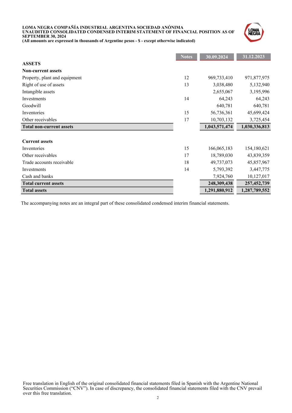 Notes 30.09.2024 31.12.2023 ASSETS Non-current assets Property, plant and equipment 12 969,733,410 971,877,975 Right of use of assets 13 3,038,480 5,132,940 Intangible assets 2,655,067 3,195,996 Investments 14 64,243 64,243 Goodwill 640,781 640,781 Inventories 15 56,736,361 45,699,424 Other receivables 17 10,703,132 3,725,454 Total non-current assets 1,043,571,474 1,030,336,813 Current assets Inventories 15 166,065,183 154,180,621 Other receivables 17 18,789,030 43,839,359 Trade accounts receivable 18 49,737,073 45,857,967 Investments 14 5,793,392 3,447,775 Cash and banks 7,924,760 10,127,017 Total current assets 248,309,438 257,452,739 Total assets 1,291,880,912 1,287,789,552 The accompanying notes are an integral part of these consolidated condensed interim financial statements. LOMA NEGRA COMPAÑÍA INDUSTRIAL ARGENTINA SOCIEDAD ANÓNIMA UNAUDITED CONSOLIDATED CONDENSED INTERIM STATEMENT OF FINANCIAL POSITION AS OF SEPTEMBER 30, 2024 (All amounts are expressed in thousands of Argentine pesos - $ - except otherwise indicated) Free translation in English of the original consolidated financial statements filed in Spanish with the Argentine National Securities Commission (“CNV”). In case of discrepancy, the consolidated financial statements filed with the CNV prevail over this free translation. 2