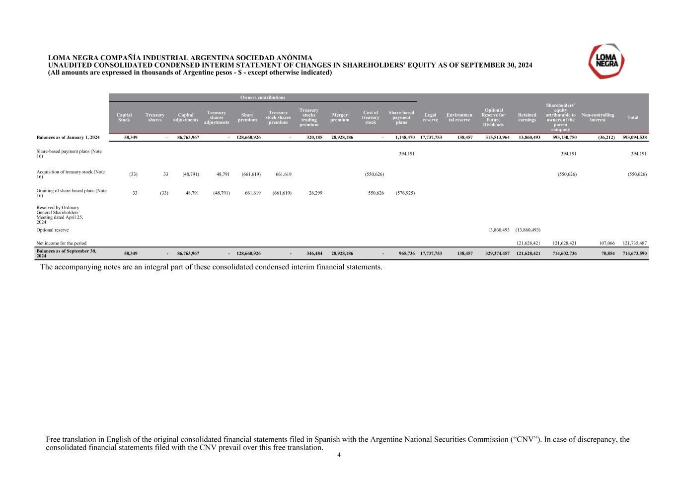 Owners contributions Capital Stock Treasury shares Capital adjustments Treasury shares adjustments Share premium Treasury stock shares premium Treasury stocks trading premium Merger premium Cost of treasury stock Share-based payment plans Legal reserve Environmen tal reserve Optional Reserve for Future Dividends Retained earnings Shareholders’ equity attributable to owners of the parent company Non-controlling interest Total Balances as of January 1, 2024 58,349 – 86,763,967 – 128,660,926 – 320,185 28,928,186 – 1,148,470 17,737,753 138,457 315,513,964 13,860,493 593,130,750 (36,212) 593,094,538 Share-based payment plans (Note 16) 394,191 394,191 394,191 Acquisition of treasury stock (Note 16) (33) 33 (48,791) 48,791 (661,619) 661,619 (550,626) (550,626) (550,626) Granting of share-based plans (Note 16) 33 (33) 48,791 (48,791) 661,619 (661,619) 26,299 550,626 (576,925) Resolved by Ordinary General Shareholders’ Meeting dated April 25, 2024: Optional reserve 13,860,493 (13,860,493) Net income for the period 121,628,421 121,628,421 107,066 121,735,487 Balances as of September 30, 2024 58,349 - 86,763,967 - 128,660,926 - 346,484 28,928,186 - 965,736 17,737,753 138,457 329,374,457 121,628,421 714,602,736 70,854 714,673,590 The accompanying notes are an integral part of these consolidated condensed interim financial statements. LOMA NEGRA COMPAÑÍA INDUSTRIAL ARGENTINA SOCIEDAD ANÓNIMA UNAUDITED CONSOLIDATED CONDENSED INTERIM STATEMENT OF CHANGES IN SHAREHOLDERS’ EQUITY AS OF SEPTEMBER 30, 2024 (All amounts are expressed in thousands of Argentine pesos - $ - except otherwise indicated) Free translation in English of the original consolidated financial statements filed in Spanish with the Argentine National Securities Commission (“CNV”). In case of discrepancy, the consolidated financial statements filed with the CNV prevail over this free translation. 4