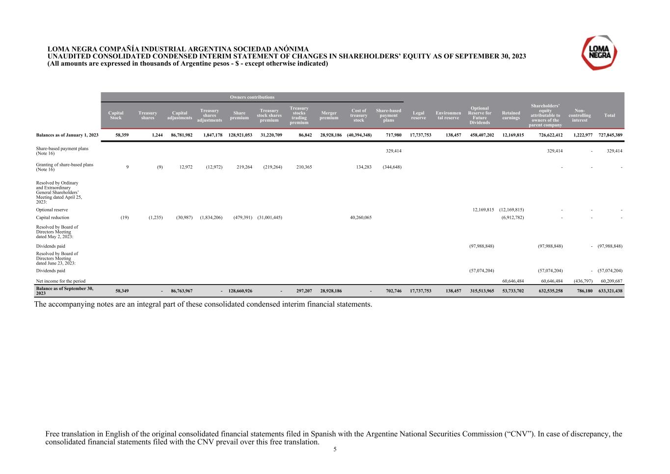 Owners contributions Capital Stock Treasury shares Capital adjustments Treasury shares adjustments Share premium Treasury stock shares premium Treasury stocks trading premium Merger premium Cost of treasury stock Share-based payment plans Legal reserve Environmen tal reserve Optional Reserve for Future Dividends Retained earnings Shareholders’ equity attributable to owners of the parent company Non- controlling interest Total Balances as of January 1, 2023 58,359 1,244 86,781,982 1,847,178 128,921,053 31,220,709 86,842 28,928,186 (40,394,348) 717,980 17,737,753 138,457 458,407,202 12,169,815 726,622,412 1,222,977 727,845,389 Share-based payment plans (Note 16) 329,414 329,414 - 329,414 Granting of share-based plans (Note 16) 9 (9) 12,972 (12,972) 219,264 (219,264) 210,365 134,283 (344,648) - - - Resolved by Ordinary and Extraordinary General Shareholders’ Meeting dated April 25, 2023: Optional reserve 12,169,815 (12,169,815) - - - Capital reduction (19) (1,235) (30,987) (1,834,206) (479,391) (31,001,445) 40,260,065 (6,912,782) - - - Resolved by Board of Directors Meeting dated May 2, 2023: Dividends paid (97,988,848) (97,988,848) - (97,988,848) Resolved by Board of Directors Meeting dated June 23, 2023: Dividends paid (57,074,204) (57,074,204) - (57,074,204) Net income for the period 60,646,484 60,646,484 (436,797) 60,209,687 Balance as of September 30, 2023 58,349 - 86,763,967 - 128,660,926 - 297,207 28,928,186 - 702,746 17,737,753 138,457 315,513,965 53,733,702 632,535,258 786,180 633,321,438 The accompanying notes are an integral part of these consolidated condensed interim financial statements. LOMA NEGRA COMPAÑÍA INDUSTRIAL ARGENTINA SOCIEDAD ANÓNIMA UNAUDITED CONSOLIDATED CONDENSED INTERIM STATEMENT OF CHANGES IN SHAREHOLDERS’ EQUITY AS OF SEPTEMBER 30, 2023 (All amounts are expressed in thousands of Argentine pesos - $ - except otherwise indicated) Free translation in English of the original consolidated financial statements filed in Spanish with the Argentine National Securities Commission (“CNV”). In case of discrepancy, the consolidated financial statements filed with the CNV prevail over this free translation. 5