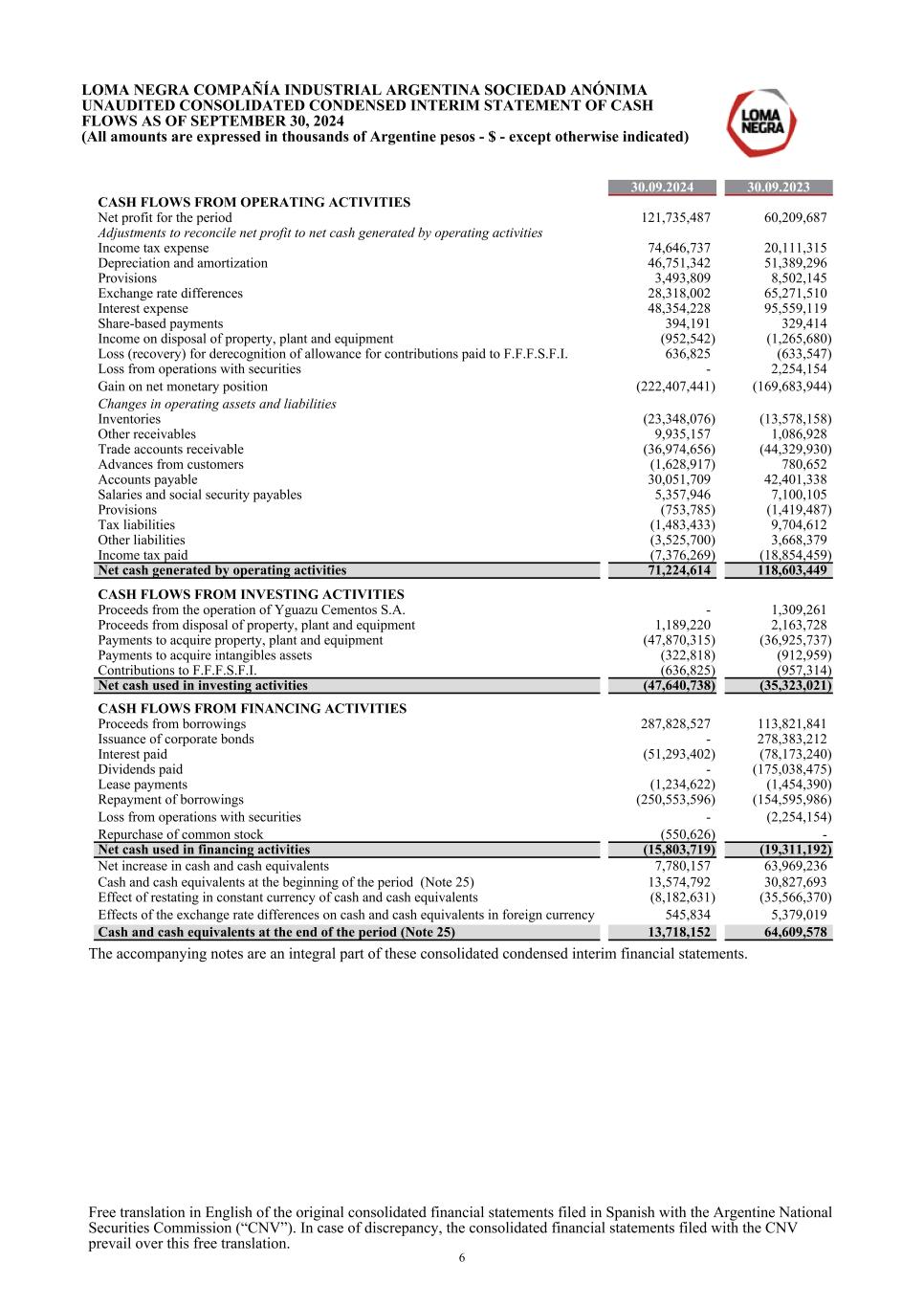 30.09.2024 30.09.2023 CASH FLOWS FROM OPERATING ACTIVITIES Net profit for the period 121,735,487 60,209,687 Adjustments to reconcile net profit to net cash generated by operating activities Income tax expense 74,646,737 20,111,315 Depreciation and amortization 46,751,342 51,389,296 Provisions 3,493,809 8,502,145 Exchange rate differences 28,318,002 65,271,510 Interest expense 48,354,228 95,559,119 Share-based payments 394,191 329,414 Income on disposal of property, plant and equipment (952,542) (1,265,680) Loss (recovery) for derecognition of allowance for contributions paid to F.F.F.S.F.I. 636,825 (633,547) Loss from operations with securities - 2,254,154 Gain on net monetary position (222,407,441) (169,683,944) Changes in operating assets and liabilities Inventories (23,348,076) (13,578,158) Other receivables 9,935,157 1,086,928 Trade accounts receivable (36,974,656) (44,329,930) Advances from customers (1,628,917) 780,652 Accounts payable 30,051,709 42,401,338 Salaries and social security payables 5,357,946 7,100,105 Provisions (753,785) (1,419,487) Tax liabilities (1,483,433) 9,704,612 Other liabilities (3,525,700) 3,668,379 Income tax paid (7,376,269) (18,854,459) Net cash generated by operating activities 71,224,614 118,603,449 CASH FLOWS FROM INVESTING ACTIVITIES Proceeds from the operation of Yguazu Cementos S.A. - 1,309,261 Proceeds from disposal of property, plant and equipment 1,189,220 2,163,728 Payments to acquire property, plant and equipment (47,870,315) (36,925,737) Payments to acquire intangibles assets (322,818) (912,959) Contributions to F.F.F.S.F.I. (636,825) (957,314) Net cash used in investing activities (47,640,738) (35,323,021) CASH FLOWS FROM FINANCING ACTIVITIES Proceeds from borrowings 287,828,527 113,821,841 Issuance of corporate bonds - 278,383,212 Interest paid (51,293,402) (78,173,240) Dividends paid - (175,038,475) Lease payments (1,234,622) (1,454,390) Repayment of borrowings (250,553,596) (154,595,986) Loss from operations with securities - (2,254,154) Repurchase of common stock (550,626) - Net cash used in financing activities (15,803,719) (19,311,192) Net increase in cash and cash equivalents 7,780,157 63,969,236 Cash and cash equivalents at the beginning of the period (Note 25) 13,574,792 30,827,693 Effect of restating in constant currency of cash and cash equivalents (8,182,631) (35,566,370) Effects of the exchange rate differences on cash and cash equivalents in foreign currency 545,834 5,379,019 Cash and cash equivalents at the end of the period (Note 25) 13,718,152 64,609,578 The accompanying notes are an integral part of these consolidated condensed interim financial statements. LOMA NEGRA COMPAÑÍA INDUSTRIAL ARGENTINA SOCIEDAD ANÓNIMA UNAUDITED CONSOLIDATED CONDENSED INTERIM STATEMENT OF CASH FLOWS AS OF SEPTEMBER 30, 2024 (All amounts are expressed in thousands of Argentine pesos - $ - except otherwise indicated) Free translation in English of the original consolidated financial statements filed in Spanish with the Argentine National Securities Commission (“CNV”). In case of discrepancy, the consolidated financial statements filed with the CNV prevail over this free translation. 6