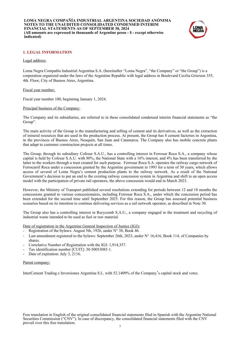 1. LEGAL INFORMATION Legal address: Loma Negra Compañía Industrial Argentina S.A. (hereinafter “Loma Negra”, “the Company” or “the Group”) is a corporation organized under the laws of the Argentine Republic with legal address in Boulevard Cecilia Grierson 355, 4th. Floor, City of Buenos Aires, Argentina. Fiscal year number: Fiscal year number 100, beginning January 1, 2024. Principal business of the Company: The Company and its subsidiaries, are referred to in these consolidated condensed interim financial statements as “the Group”. The main activity of the Group is the manufacturing and selling of cement and its derivatives, as well as the extraction of mineral resources that are used in the production process. At present, the Group has 8 cement factories in Argentina, in the provinces of Buenos Aires, Neuquén, San Juan and Catamarca. The Company also has mobile concrete plants that adapt to customer construction projects at all times. The Group, through its subsidiary Cofesur S.A.U., has a controlling interest in Ferrosur Roca S.A., a company whose capital is held by Cofesur S.A.U. with 80%, the National State with a 16% interest, and 4% has been transferred by the latter to the workers through a trust created for such purpose. Ferrosur Roca S.A. operates the railway cargo network of Ferrocarril Roca under a concession granted by the Argentine government in 1993 for a term of 30 years, which allows access of several of Loma Negra’s cement production plants to the railway network. As a result of the National Government’s decision to put an end to the existing railway concession system in Argentina and shift to an open access model with the participation of private rail operators, the above concession would end in March 2023. However, the Ministry of Transport published several resolutions extending for periods between 12 and 18 months the concessions granted to various concessionaires, including Ferrosur Roca S.A., under which the concession period has been extended for the second time until September 2025. For this reason, the Group has assessed potential business scenarios based on its intention to continue delivering services as a rail network operator, as described in Note 30. The Group also has a controlling interest in Recycomb S.A.U., a company engaged in the treatment and recycling of industrial waste intended to be used as fuel or raw material. Date of registration in the Argentine General Inspection of Justice (IGJ): - Registration of the bylaws: August 5th, 1926, under N° 38, Book 46. - Last amendment registered to the bylaws: September 26th, 2023, under N° 16,416, Book 114, of Companies by shares. - Correlative Number of Registration with the IGJ: 1,914,357. - Tax identification number [CUIT]: 30-50053085-1. - Date of expiration: July 3, 2116. Parent company: InterCement Trading e Inversiones Argentina S.L. with 52.1409% of the Company’s capital stock and votes. LOMA NEGRA COMPAÑÍA INDUSTRIAL ARGENTINA SOCIEDAD ANÓNIMA NOTES TO THE UNAUDITED CONSOLIDATED CONDENSED INTERIM FINANCIAL STATEMENTS AS OF SEPTEMBER 30, 2024 (All amounts are expressed in thousands of Argentine pesos - $ - except otherwise indicated) Free translation in English of the original consolidated financial statements filed in Spanish with the Argentine National Securities Commission (“CNV”). In case of discrepancy, the consolidated financial statements filed with the CNV prevail over this free translation. 7
