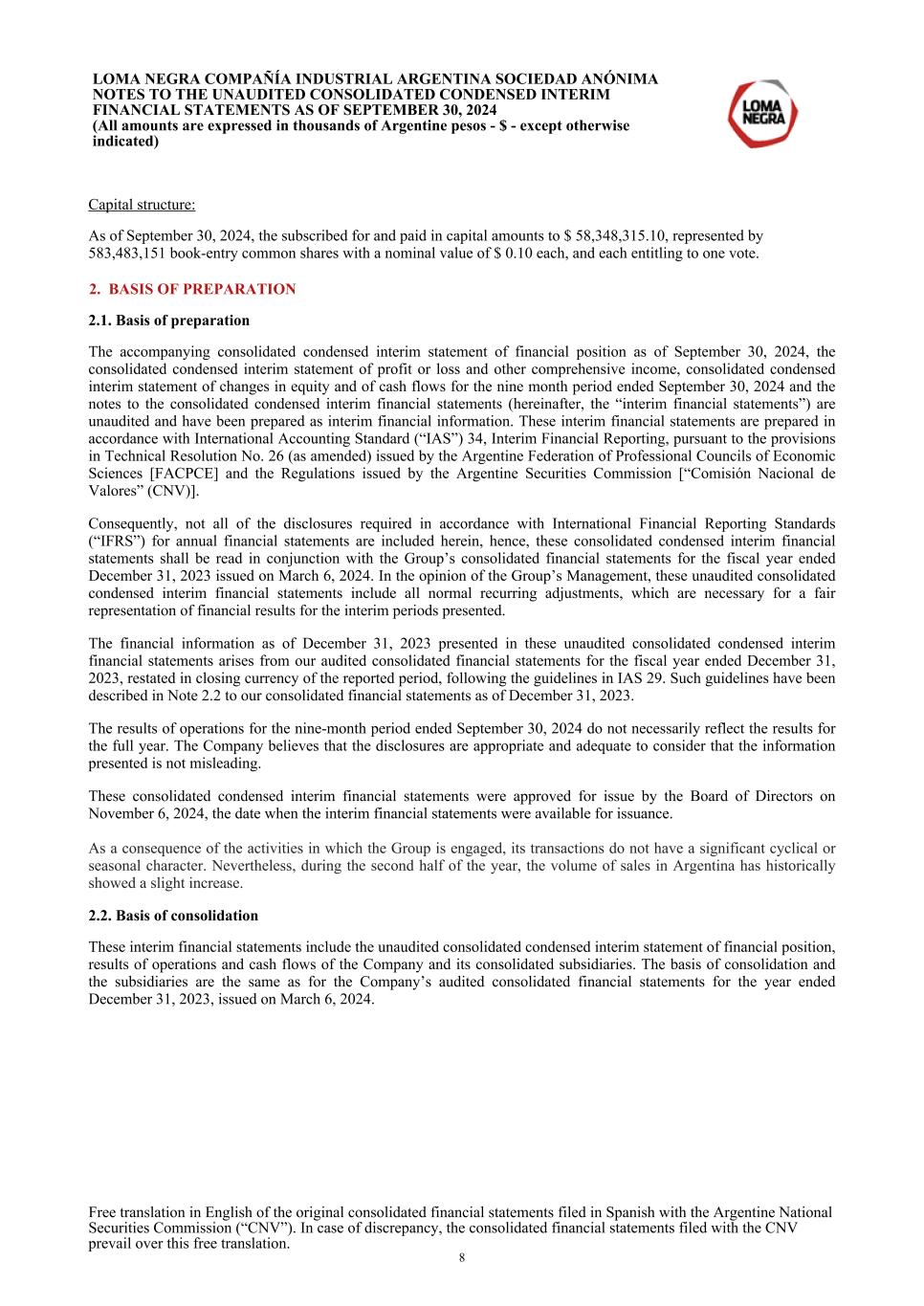 Capital structure: As of September 30, 2024, the subscribed for and paid in capital amounts to $ 58,348,315.10, represented by 583,483,151 book-entry common shares with a nominal value of $ 0.10 each, and each entitling to one vote. 2. BASIS OF PREPARATION 2.1. Basis of preparation The accompanying consolidated condensed interim statement of financial position as of September 30, 2024, the consolidated condensed interim statement of profit or loss and other comprehensive income, consolidated condensed interim statement of changes in equity and of cash flows for the nine month period ended September 30, 2024 and the notes to the consolidated condensed interim financial statements (hereinafter, the “interim financial statements”) are unaudited and have been prepared as interim financial information. These interim financial statements are prepared in accordance with International Accounting Standard (“IAS”) 34, Interim Financial Reporting, pursuant to the provisions in Technical Resolution No. 26 (as amended) issued by the Argentine Federation of Professional Councils of Economic Sciences [FACPCE] and the Regulations issued by the Argentine Securities Commission [“Comisión Nacional de Valores” (CNV)]. Consequently, not all of the disclosures required in accordance with International Financial Reporting Standards (“IFRS”) for annual financial statements are included herein, hence, these consolidated condensed interim financial statements shall be read in conjunction with the Group’s consolidated financial statements for the fiscal year ended December 31, 2023 issued on March 6, 2024. In the opinion of the Group’s Management, these unaudited consolidated condensed interim financial statements include all normal recurring adjustments, which are necessary for a fair representation of financial results for the interim periods presented. The financial information as of December 31, 2023 presented in these unaudited consolidated condensed interim financial statements arises from our audited consolidated financial statements for the fiscal year ended December 31, 2023, restated in closing currency of the reported period, following the guidelines in IAS 29. Such guidelines have been described in Note 2.2 to our consolidated financial statements as of December 31, 2023. The results of operations for the nine-month period ended September 30, 2024 do not necessarily reflect the results for the full year. The Company believes that the disclosures are appropriate and adequate to consider that the information presented is not misleading. These consolidated condensed interim financial statements were approved for issue by the Board of Directors on November 6, 2024, the date when the interim financial statements were available for issuance. As a consequence of the activities in which the Group is engaged, its transactions do not have a significant cyclical or seasonal character. Nevertheless, during the second half of the year, the volume of sales in Argentina has historically showed a slight increase. 2.2. Basis of consolidation These interim financial statements include the unaudited consolidated condensed interim statement of financial position, results of operations and cash flows of the Company and its consolidated subsidiaries. The basis of consolidation and the subsidiaries are the same as for the Company’s audited consolidated financial statements for the year ended December 31, 2023, issued on March 6, 2024. LOMA NEGRA COMPAÑÍA INDUSTRIAL ARGENTINA SOCIEDAD ANÓNIMA NOTES TO THE UNAUDITED CONSOLIDATED CONDENSED INTERIM FINANCIAL STATEMENTS AS OF SEPTEMBER 30, 2024 (All amounts are expressed in thousands of Argentine pesos - $ - except otherwise indicated) Free translation in English of the original consolidated financial statements filed in Spanish with the Argentine National Securities Commission (“CNV”). In case of discrepancy, the consolidated financial statements filed with the CNV prevail over this free translation. 8