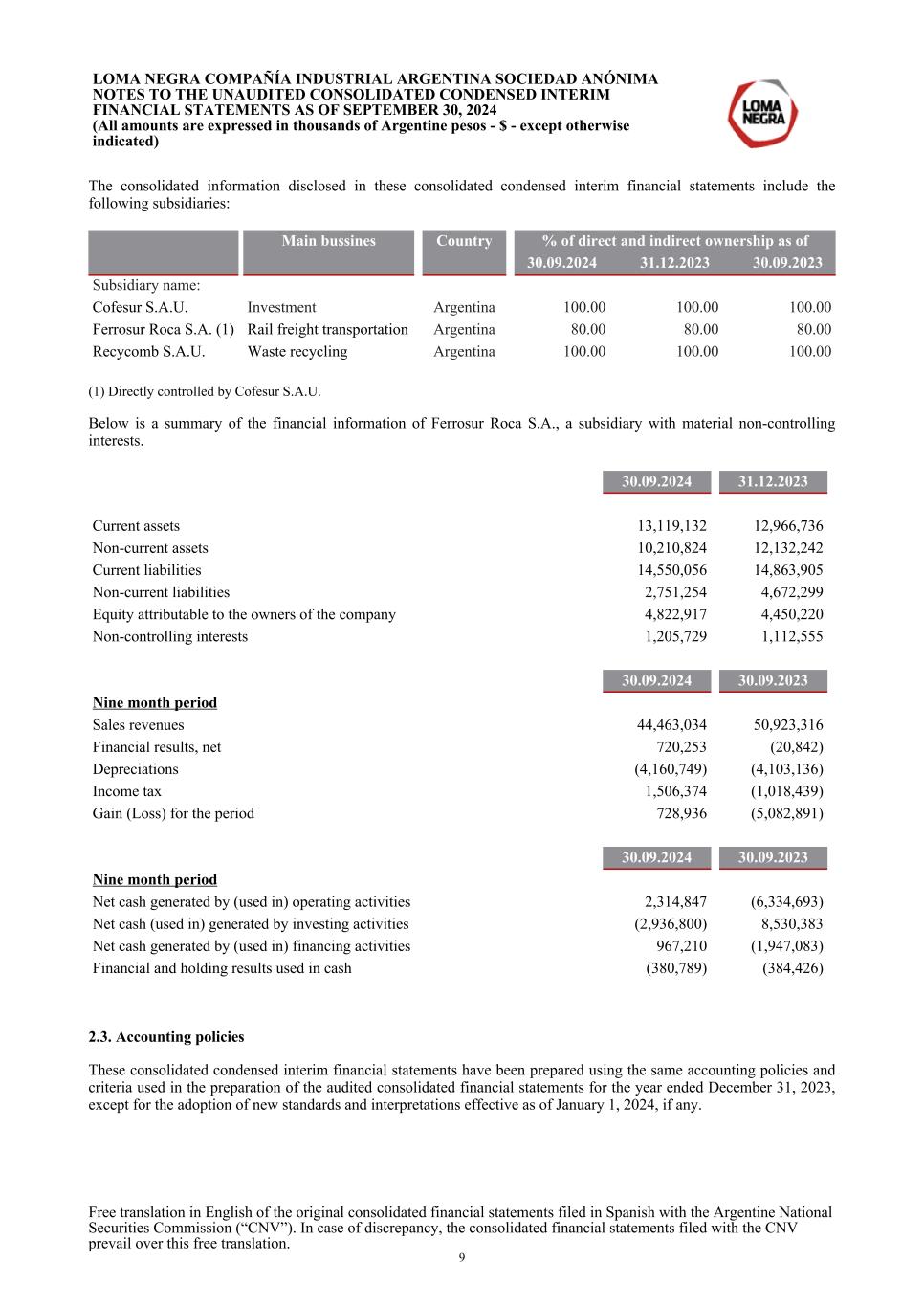 The consolidated information disclosed in these consolidated condensed interim financial statements include the following subsidiaries: Main bussines Country % of direct and indirect ownership as of 30.09.2024 31.12.2023 30.09.2023 Subsidiary name: Cofesur S.A.U. Investment Argentina 100.00 100.00 100.00 Ferrosur Roca S.A. (1) Rail freight transportation Argentina 80.00 80.00 80.00 Recycomb S.A.U. Waste recycling Argentina 100.00 100.00 100.00 (1) Directly controlled by Cofesur S.A.U. Below is a summary of the financial information of Ferrosur Roca S.A., a subsidiary with material non-controlling interests. 30.09.2024 31.12.2023 Current assets 13,119,132 12,966,736 Non-current assets 10,210,824 12,132,242 Current liabilities 14,550,056 14,863,905 Non-current liabilities 2,751,254 4,672,299 Equity attributable to the owners of the company 4,822,917 4,450,220 Non-controlling interests 1,205,729 1,112,555 30.09.2024 30.09.2023 Nine month period Sales revenues 44,463,034 50,923,316 Financial results, net 720,253 (20,842) Depreciations (4,160,749) (4,103,136) Income tax 1,506,374 (1,018,439) Gain (Loss) for the period 728,936 (5,082,891) 30.09.2024 30.09.2023 Nine month period Net cash generated by (used in) operating activities 2,314,847 (6,334,693) Net cash (used in) generated by investing activities (2,936,800) 8,530,383 Net cash generated by (used in) financing activities 967,210 (1,947,083) Financial and holding results used in cash (380,789) (384,426) 2.3. Accounting policies These consolidated condensed interim financial statements have been prepared using the same accounting policies and criteria used in the preparation of the audited consolidated financial statements for the year ended December 31, 2023, except for the adoption of new standards and interpretations effective as of January 1, 2024, if any. LOMA NEGRA COMPAÑÍA INDUSTRIAL ARGENTINA SOCIEDAD ANÓNIMA NOTES TO THE UNAUDITED CONSOLIDATED CONDENSED INTERIM FINANCIAL STATEMENTS AS OF SEPTEMBER 30, 2024 (All amounts are expressed in thousands of Argentine pesos - $ - except otherwise indicated) Free translation in English of the original consolidated financial statements filed in Spanish with the Argentine National Securities Commission (“CNV”). In case of discrepancy, the consolidated financial statements filed with the CNV prevail over this free translation. 9