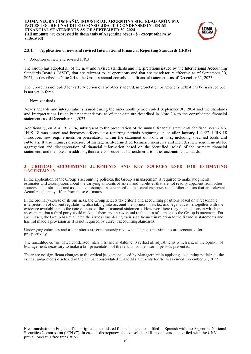 2.3.1. Application of new and revised International Financial Reporting Standards (IFRS) - Adoption of new and revised IFRS The Group has adopted all of the new and revised standards and interpretations issued by the International Accounting Standards Board (“IASB”) that are relevant to its operations and that are mandatorily effective as of September 30, 2024, as described in Note 2.4 to the Group's annual consolidated financial statements as of December 31, 2023. The Group has not opted for early adoption of any other standard, interpretation or amendment that has been issued but is not yet in force. - New standards New standards and interpretations issued during the nine-month period ended September 30, 2024 and the standards and interpretations issued but not mandatory as of that date are described in Note 2.4 to the consolidated financial statements as of December 31, 2023. Additionally, on April 9, 2024, subsequent to the presentation of the annual financial statements for fiscal year 2023, IFRS 18 was issued and becomes effective for reporting periods beginning on or after January 1 2027. IFRS 18 introduces new requirements on presentation within the statement of profit or loss, including specified totals and subtotals. It also requires disclosure of management-defined performance measures and includes new requirements for aggregation and disaggregation of financial information based on the identified ‘roles’ of the primary financial statements and the notes. In addition, there are consequential amendments to other accounting standards. 3. CRITICAL ACCOUNTING JUDGMENTS AND KEY SOURCES USED FOR ESTIMATING UNCERTAINTY In the application of the Group´s accounting policies, the Group´s management is required to make judgments, estimates and assumptions about the carrying amounts of assets and liabilities that are not readily apparent from other sources. The estimates and associated assumptions are based on historical experience and other factors that are relevant. Actual results may differ from these estimates. In the ordinary course of its business, the Group selects tax criteria and accounting positions based on a reasonable interpretation of current regulations, also taking into account the opinion of its tax and legal advisors together with the evidence available up to the date of issue of these financial statements. However, there may be situations in which the assessment that a third party could make of them and the eventual realization of damage to the Group is uncertain. For such cases, the Group has evaluated the issues considering their significance in relation to the financial statements and has not made a provision as it is not required by current accounting standards. Underlying estimates and assumptions are continuously reviewed. Changes in estimates are accounted for prospectively. The unaudited consolidated condensed interim financial statements reflect all adjustments which are, in the opinion of Management, necessary to make a fair presentation of the results for the interim periods presented. There are no significant changes to the critical judgements used by Management in applying accounting policies to the critical judgements disclosed in the annual consolidated financial statements for the year ended December 31, 2023. LOMA NEGRA COMPAÑÍA INDUSTRIAL ARGENTINA SOCIEDAD ANÓNIMA NOTES TO THE UNAUDITED CONSOLIDATED CONDENSED INTERIM FINANCIAL STATEMENTS AS OF SEPTEMBER 30, 2024 (All amounts are expressed in thousands of Argentine pesos - $ - except otherwise indicated) Free translation in English of the original consolidated financial statements filed in Spanish with the Argentine National Securities Commission (“CNV”). In case of discrepancy, the consolidated financial statements filed with the CNV prevail over this free translation. 10