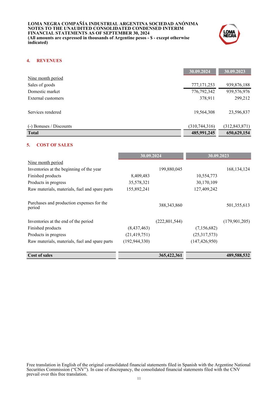 4. REVENUES 30.09.2024 30.09.2023 Nine month period Sales of goods 777,171,253 939,876,188 Domestic market 776,792,342 939,576,976 External customers 378,911 299,212 Services rendered 19,564,308 23,596,837 (-) Bonuses / Discounts (310,744,316) (312,843,871) Total 485,991,245 650,629,154 5. COST OF SALES 30.09.2024 30.09.2023 Nine month period Inventories at the beginning of the year 199,880,045 168,134,124 Finished products 8,409,483 10,554,773 Products in progress 35,578,321 30,170,109 Raw materials, materials, fuel and spare parts 155,892,241 127,409,242 Purchases and production expenses for the period 388,343,860 501,355,613 Inventories at the end of the period (222,801,544) (179,901,205) Finished products (8,437,463) (7,156,682) Products in progress (21,419,751) (25,317,573) Raw materials, materials, fuel and spare parts (192,944,330) (147,426,950) Cost of sales 365,422,361 489,588,532 LOMA NEGRA COMPAÑÍA INDUSTRIAL ARGENTINA SOCIEDAD ANÓNIMA NOTES TO THE UNAUDITED CONSOLIDATED CONDENSED INTERIM FINANCIAL STATEMENTS AS OF SEPTEMBER 30, 2024 (All amounts are expressed in thousands of Argentine pesos - $ - except otherwise indicated) Free translation in English of the original consolidated financial statements filed in Spanish with the Argentine National Securities Commission (“CNV”). In case of discrepancy, the consolidated financial statements filed with the CNV prevail over this free translation. 11