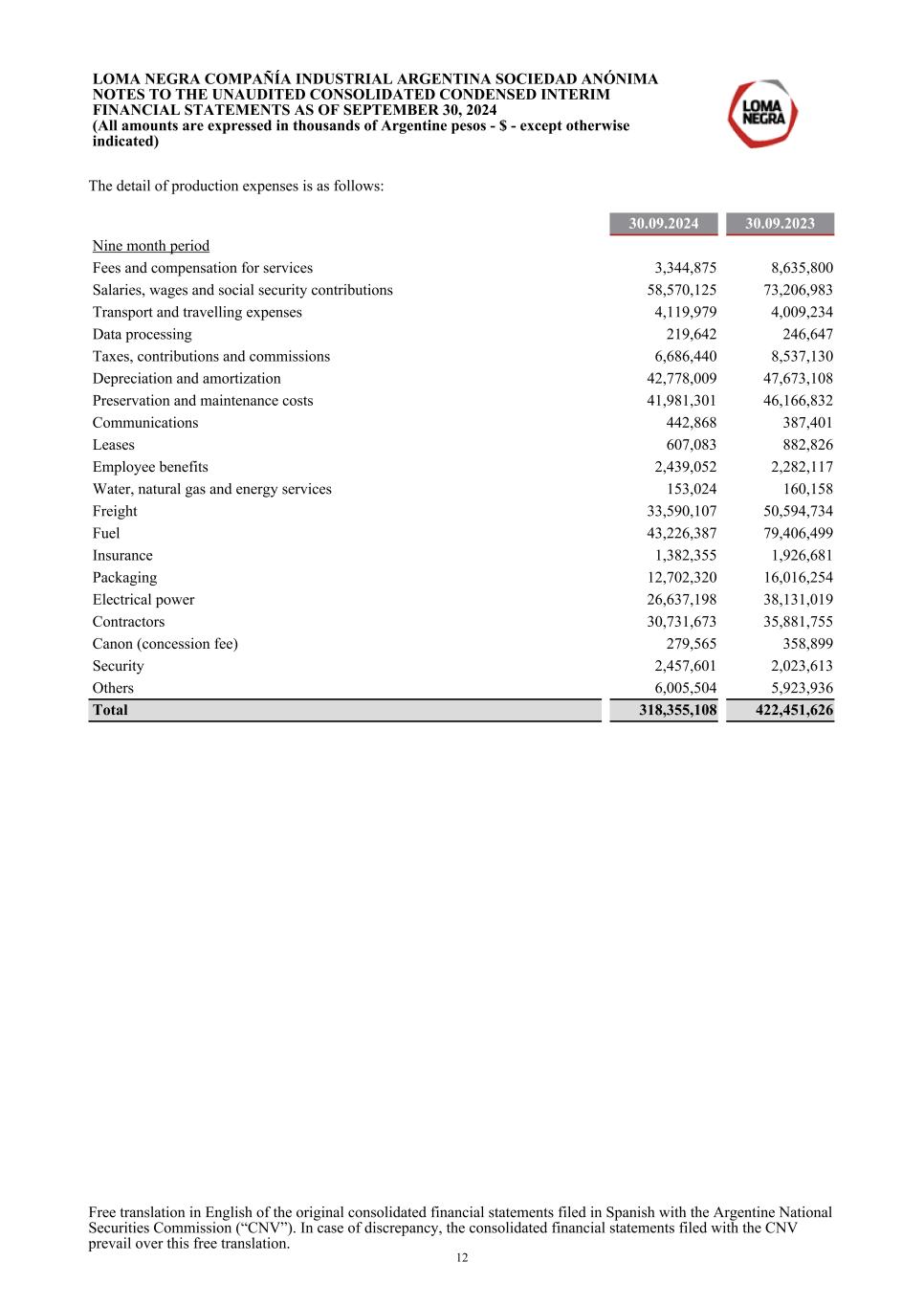 The detail of production expenses is as follows: 30.09.2024 30.09.2023 Nine month period Fees and compensation for services 3,344,875 8,635,800 Salaries, wages and social security contributions 58,570,125 73,206,983 Transport and travelling expenses 4,119,979 4,009,234 Data processing 219,642 246,647 Taxes, contributions and commissions 6,686,440 8,537,130 Depreciation and amortization 42,778,009 47,673,108 Preservation and maintenance costs 41,981,301 46,166,832 Communications 442,868 387,401 Leases 607,083 882,826 Employee benefits 2,439,052 2,282,117 Water, natural gas and energy services 153,024 160,158 Freight 33,590,107 50,594,734 Fuel 43,226,387 79,406,499 Insurance 1,382,355 1,926,681 Packaging 12,702,320 16,016,254 Electrical power 26,637,198 38,131,019 Contractors 30,731,673 35,881,755 Canon (concession fee) 279,565 358,899 Security 2,457,601 2,023,613 Others 6,005,504 5,923,936 Total 318,355,108 422,451,626 LOMA NEGRA COMPAÑÍA INDUSTRIAL ARGENTINA SOCIEDAD ANÓNIMA NOTES TO THE UNAUDITED CONSOLIDATED CONDENSED INTERIM FINANCIAL STATEMENTS AS OF SEPTEMBER 30, 2024 (All amounts are expressed in thousands of Argentine pesos - $ - except otherwise indicated) Free translation in English of the original consolidated financial statements filed in Spanish with the Argentine National Securities Commission (“CNV”). In case of discrepancy, the consolidated financial statements filed with the CNV prevail over this free translation. 12