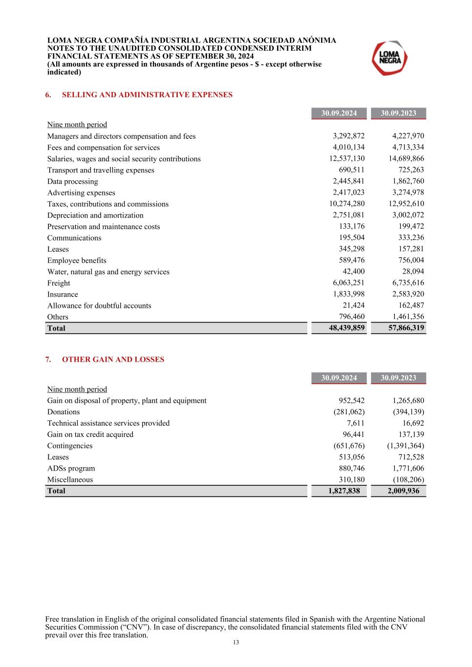 6. SELLING AND ADMINISTRATIVE EXPENSES 30.09.2024 30.09.2023 Nine month period Managers and directors compensation and fees 3,292,872 4,227,970 Fees and compensation for services 4,010,134 4,713,334 Salaries, wages and social security contributions 12,537,130 14,689,866 Transport and travelling expenses 690,511 725,263 Data processing 2,445,841 1,862,760 Advertising expenses 2,417,023 3,274,978 Taxes, contributions and commissions 10,274,280 12,952,610 Depreciation and amortization 2,751,081 3,002,072 Preservation and maintenance costs 133,176 199,472 Communications 195,504 333,236 Leases 345,298 157,281 Employee benefits 589,476 756,004 Water, natural gas and energy services 42,400 28,094 Freight 6,063,251 6,735,616 Insurance 1,833,998 2,583,920 Allowance for doubtful accounts 21,424 162,487 Others 796,460 1,461,356 Total 48,439,859 57,866,319 7. OTHER GAIN AND LOSSES 30.09.2024 30.09.2023 Nine month period Gain on disposal of property, plant and equipment 952,542 1,265,680 Donations (281,062) (394,139) Technical assistance services provided 7,611 16,692 Gain on tax credit acquired 96,441 137,139 Contingencies (651,676) (1,391,364) Leases 513,056 712,528 ADSs program 880,746 1,771,606 Miscellaneous 310,180 (108,206) Total 1,827,838 2,009,936 LOMA NEGRA COMPAÑÍA INDUSTRIAL ARGENTINA SOCIEDAD ANÓNIMA NOTES TO THE UNAUDITED CONSOLIDATED CONDENSED INTERIM FINANCIAL STATEMENTS AS OF SEPTEMBER 30, 2024 (All amounts are expressed in thousands of Argentine pesos - $ - except otherwise indicated) Free translation in English of the original consolidated financial statements filed in Spanish with the Argentine National Securities Commission (“CNV”). In case of discrepancy, the consolidated financial statements filed with the CNV prevail over this free translation. 13