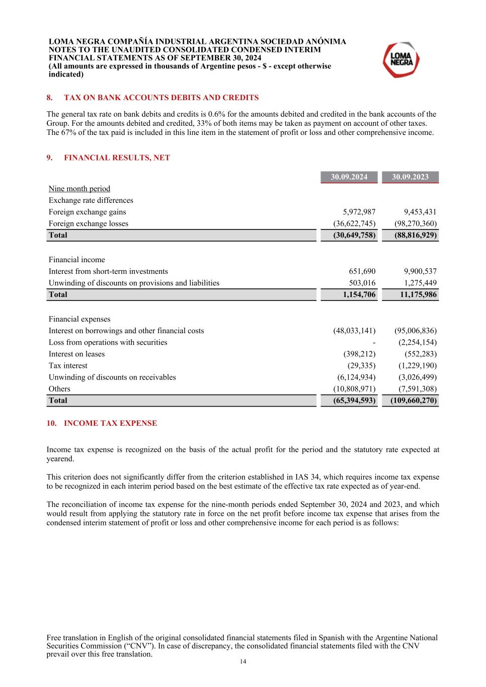 8. TAX ON BANK ACCOUNTS DEBITS AND CREDITS The general tax rate on bank debits and credits is 0.6% for the amounts debited and credited in the bank accounts of the Group. For the amounts debited and credited, 33% of both items may be taken as payment on account of other taxes. The 67% of the tax paid is included in this line item in the statement of profit or loss and other comprehensive income. 9. FINANCIAL RESULTS, NET 30.09.2024 30.09.2023 Nine month period Exchange rate differences Foreign exchange gains 5,972,987 9,453,431 Foreign exchange losses (36,622,745) (98,270,360) Total (30,649,758) (88,816,929) Financial income Interest from short-term investments 651,690 9,900,537 Unwinding of discounts on provisions and liabilities 503,016 1,275,449 Total 1,154,706 11,175,986 Financial expenses Interest on borrowings and other financial costs (48,033,141) (95,006,836) Loss from operations with securities - (2,254,154) Interest on leases (398,212) (552,283) Tax interest (29,335) (1,229,190) Unwinding of discounts on receivables (6,124,934) (3,026,499) Others (10,808,971) (7,591,308) Total (65,394,593) (109,660,270) 10. INCOME TAX EXPENSE Income tax expense is recognized on the basis of the actual profit for the period and the statutory rate expected at yearend. This criterion does not significantly differ from the criterion established in IAS 34, which requires income tax expense to be recognized in each interim period based on the best estimate of the effective tax rate expected as of year-end. The reconciliation of income tax expense for the nine-month periods ended September 30, 2024 and 2023, and which would result from applying the statutory rate in force on the net profit before income tax expense that arises from the condensed interim statement of profit or loss and other comprehensive income for each period is as follows: LOMA NEGRA COMPAÑÍA INDUSTRIAL ARGENTINA SOCIEDAD ANÓNIMA NOTES TO THE UNAUDITED CONSOLIDATED CONDENSED INTERIM FINANCIAL STATEMENTS AS OF SEPTEMBER 30, 2024 (All amounts are expressed in thousands of Argentine pesos - $ - except otherwise indicated) Free translation in English of the original consolidated financial statements filed in Spanish with the Argentine National Securities Commission (“CNV”). In case of discrepancy, the consolidated financial statements filed with the CNV prevail over this free translation. 14
