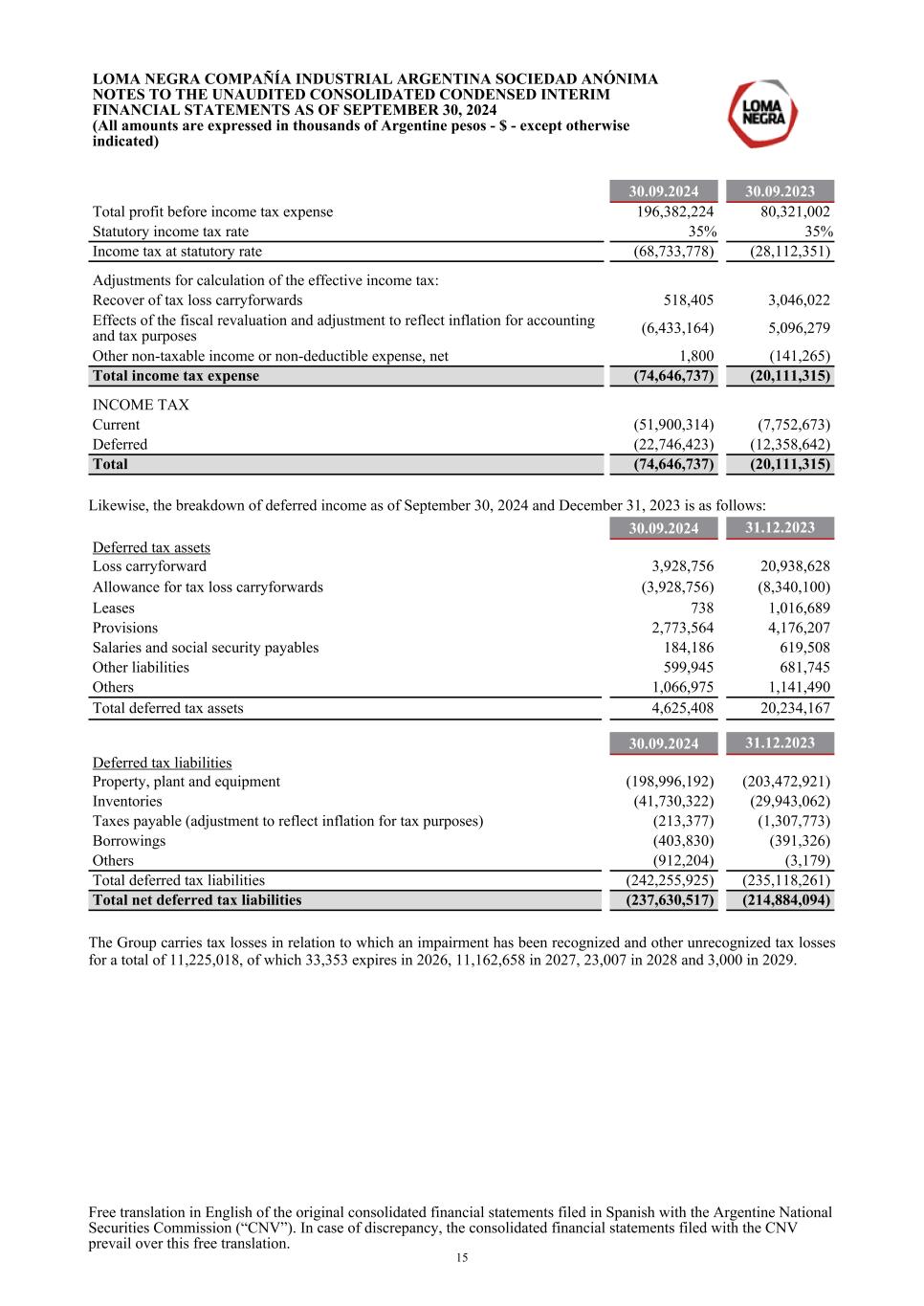 30.09.2024 30.09.2023 Total profit before income tax expense 196,382,224 80,321,002 Statutory income tax rate 35 % 35 % Income tax at statutory rate (68,733,778) (28,112,351) Adjustments for calculation of the effective income tax: Recover of tax loss carryforwards 518,405 3,046,022 Effects of the fiscal revaluation and adjustment to reflect inflation for accounting and tax purposes (6,433,164) 5,096,279 Other non-taxable income or non-deductible expense, net 1,800 (141,265) Total income tax expense (74,646,737) (20,111,315) INCOME TAX Current (51,900,314) (7,752,673) Deferred (22,746,423) (12,358,642) Total (74,646,737) (20,111,315) Likewise, the breakdown of deferred income as of September 30, 2024 and December 31, 2023 is as follows: 30.09.2024 31.12.2023 Deferred tax assets Loss carryforward 3,928,756 20,938,628 Allowance for tax loss carryforwards (3,928,756) (8,340,100) Leases 738 1,016,689 Provisions 2,773,564 4,176,207 Salaries and social security payables 184,186 619,508 Other liabilities 599,945 681,745 Others 1,066,975 1,141,490 Total deferred tax assets 4,625,408 20,234,167 30.09.2024 31.12.2023 Deferred tax liabilities Property, plant and equipment (198,996,192) (203,472,921) Inventories (41,730,322) (29,943,062) Taxes payable (adjustment to reflect inflation for tax purposes) (213,377) (1,307,773) Borrowings (403,830) (391,326) Others (912,204) (3,179) Total deferred tax liabilities (242,255,925) (235,118,261) Total net deferred tax liabilities (237,630,517) (214,884,094) The Group carries tax losses in relation to which an impairment has been recognized and other unrecognized tax losses for a total of 11,225,018, of which 33,353 expires in 2026, 11,162,658 in 2027, 23,007 in 2028 and 3,000 in 2029. LOMA NEGRA COMPAÑÍA INDUSTRIAL ARGENTINA SOCIEDAD ANÓNIMA NOTES TO THE UNAUDITED CONSOLIDATED CONDENSED INTERIM FINANCIAL STATEMENTS AS OF SEPTEMBER 30, 2024 (All amounts are expressed in thousands of Argentine pesos - $ - except otherwise indicated) Free translation in English of the original consolidated financial statements filed in Spanish with the Argentine National Securities Commission (“CNV”). In case of discrepancy, the consolidated financial statements filed with the CNV prevail over this free translation. 15