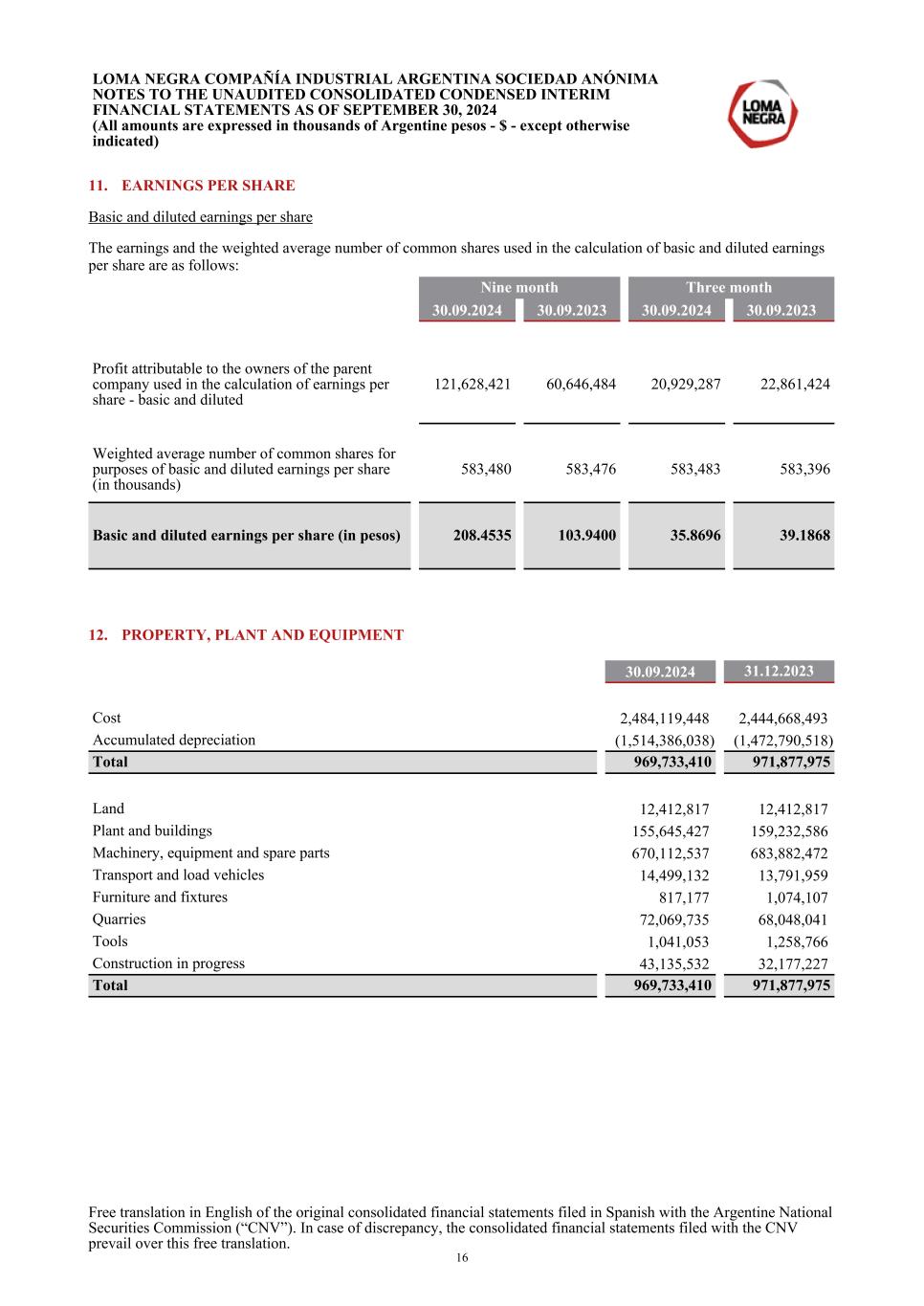 11. EARNINGS PER SHARE Basic and diluted earnings per share The earnings and the weighted average number of common shares used in the calculation of basic and diluted earnings per share are as follows: Nine month Three month 30.09.2024 30.09.2023 30.09.2024 30.09.2023 Profit attributable to the owners of the parent company used in the calculation of earnings per share - basic and diluted 121,628,421 60,646,484 20,929,287 22,861,424 Weighted average number of common shares for purposes of basic and diluted earnings per share (in thousands) 583,480 583,476 583,483 583,396 Basic and diluted earnings per share (in pesos) 208.4535 103.9400 35.8696 39.1868 12. PROPERTY, PLANT AND EQUIPMENT 30.09.2024 31.12.2023 Cost 2,484,119,448 2,444,668,493 Accumulated depreciation (1,514,386,038) (1,472,790,518) Total 969,733,410 971,877,975 Land 12,412,817 12,412,817 Plant and buildings 155,645,427 159,232,586 Machinery, equipment and spare parts 670,112,537 683,882,472 Transport and load vehicles 14,499,132 13,791,959 Furniture and fixtures 817,177 1,074,107 Quarries 72,069,735 68,048,041 Tools 1,041,053 1,258,766 Construction in progress 43,135,532 32,177,227 Total 969,733,410 971,877,975 LOMA NEGRA COMPAÑÍA INDUSTRIAL ARGENTINA SOCIEDAD ANÓNIMA NOTES TO THE UNAUDITED CONSOLIDATED CONDENSED INTERIM FINANCIAL STATEMENTS AS OF SEPTEMBER 30, 2024 (All amounts are expressed in thousands of Argentine pesos - $ - except otherwise indicated) Free translation in English of the original consolidated financial statements filed in Spanish with the Argentine National Securities Commission (“CNV”). In case of discrepancy, the consolidated financial statements filed with the CNV prevail over this free translation. 16
