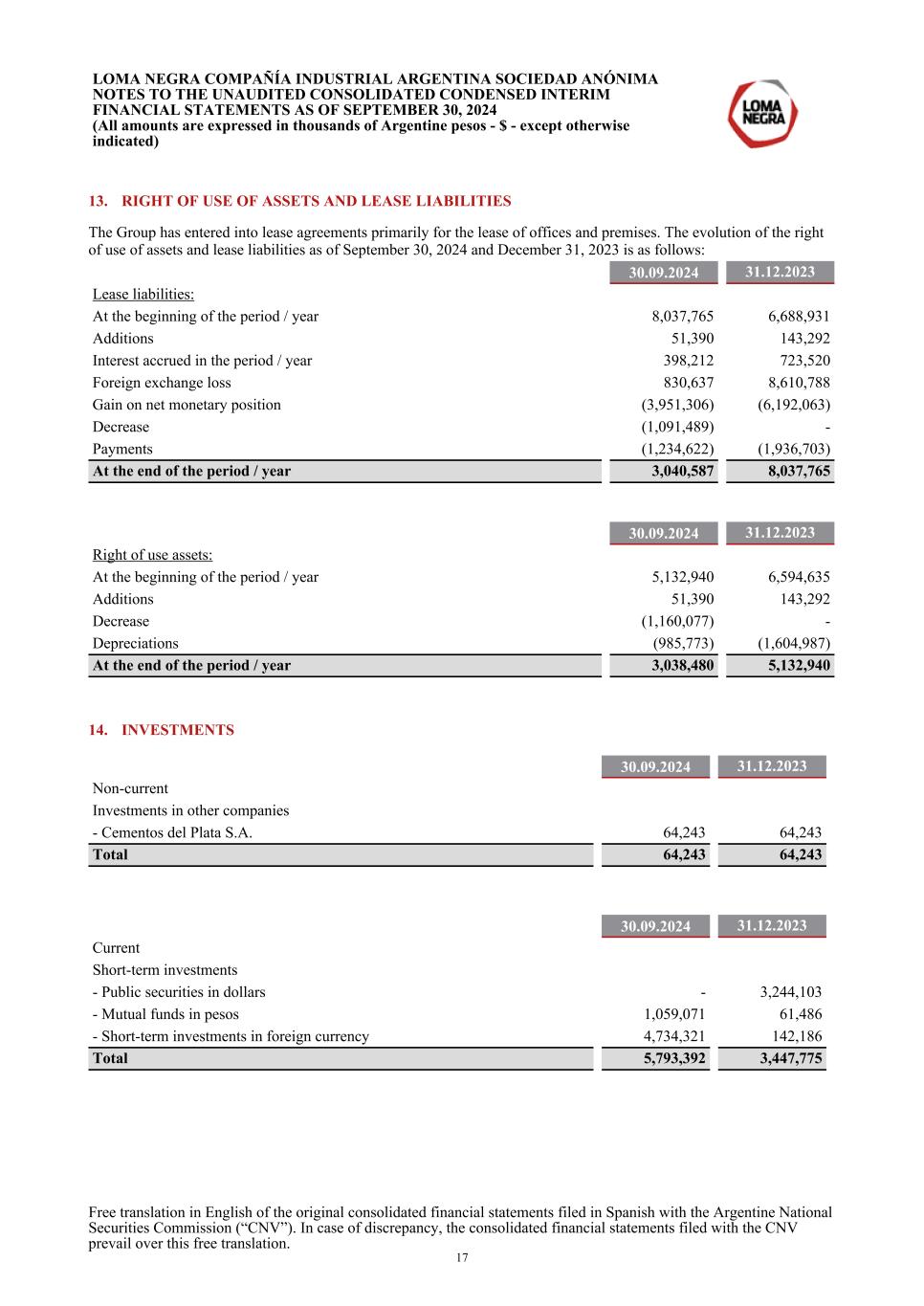 13. RIGHT OF USE OF ASSETS AND LEASE LIABILITIES The Group has entered into lease agreements primarily for the lease of offices and premises. The evolution of the right of use of assets and lease liabilities as of September 30, 2024 and December 31, 2023 is as follows: 30.09.2024 31.12.2023 Lease liabilities: At the beginning of the period / year 8,037,765 6,688,931 Additions 51,390 143,292 Interest accrued in the period / year 398,212 723,520 Foreign exchange loss 830,637 8,610,788 Gain on net monetary position (3,951,306) (6,192,063) Decrease (1,091,489) - Payments (1,234,622) (1,936,703) At the end of the period / year 3,040,587 8,037,765 30.09.2024 31.12.2023 Right of use assets: At the beginning of the period / year 5,132,940 6,594,635 Additions 51,390 143,292 Decrease (1,160,077) - Depreciations (985,773) (1,604,987) At the end of the period / year 3,038,480 5,132,940 14. INVESTMENTS 30.09.2024 31.12.2023 Non-current Investments in other companies - Cementos del Plata S.A. 64,243 64,243 Total 64,243 64,243 30.09.2024 31.12.2023 Current Short-term investments - Public securities in dollars - 3,244,103 - Mutual funds in pesos 1,059,071 61,486 - Short-term investments in foreign currency 4,734,321 142,186 Total 5,793,392 3,447,775 LOMA NEGRA COMPAÑÍA INDUSTRIAL ARGENTINA SOCIEDAD ANÓNIMA NOTES TO THE UNAUDITED CONSOLIDATED CONDENSED INTERIM FINANCIAL STATEMENTS AS OF SEPTEMBER 30, 2024 (All amounts are expressed in thousands of Argentine pesos - $ - except otherwise indicated) Free translation in English of the original consolidated financial statements filed in Spanish with the Argentine National Securities Commission (“CNV”). In case of discrepancy, the consolidated financial statements filed with the CNV prevail over this free translation. 17