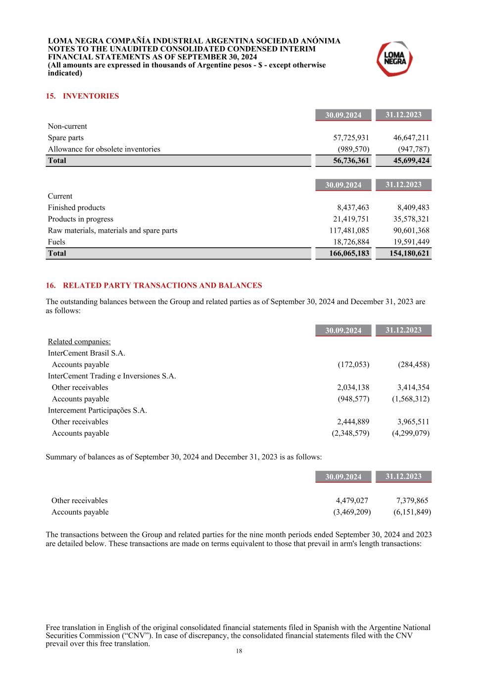 15. INVENTORIES 30.09.2024 31.12.2023 Non-current Spare parts 57,725,931 46,647,211 Allowance for obsolete inventories (989,570) (947,787) Total 56,736,361 45,699,424 30.09.2024 31.12.2023 Current Finished products 8,437,463 8,409,483 Products in progress 21,419,751 35,578,321 Raw materials, materials and spare parts 117,481,085 90,601,368 Fuels 18,726,884 19,591,449 Total 166,065,183 154,180,621 16. RELATED PARTY TRANSACTIONS AND BALANCES The outstanding balances between the Group and related parties as of September 30, 2024 and December 31, 2023 are as follows: 30.09.2024 31.12.2023 Related companies: InterCement Brasil S.A. Accounts payable (172,053) (284,458) InterCement Trading e Inversiones S.A. Other receivables 2,034,138 3,414,354 Accounts payable (948,577) (1,568,312) Intercement Participações S.A. Other receivables 2,444,889 3,965,511 Accounts payable (2,348,579) (4,299,079) Summary of balances as of September 30, 2024 and December 31, 2023 is as follows: 30.09.2024 31.12.2023 Other receivables 4,479,027 7,379,865 Accounts payable (3,469,209) (6,151,849) The transactions between the Group and related parties for the nine month periods ended September 30, 2024 and 2023 are detailed below. These transactions are made on terms equivalent to those that prevail in arm's length transactions: LOMA NEGRA COMPAÑÍA INDUSTRIAL ARGENTINA SOCIEDAD ANÓNIMA NOTES TO THE UNAUDITED CONSOLIDATED CONDENSED INTERIM FINANCIAL STATEMENTS AS OF SEPTEMBER 30, 2024 (All amounts are expressed in thousands of Argentine pesos - $ - except otherwise indicated) Free translation in English of the original consolidated financial statements filed in Spanish with the Argentine National Securities Commission (“CNV”). In case of discrepancy, the consolidated financial statements filed with the CNV prevail over this free translation. 18