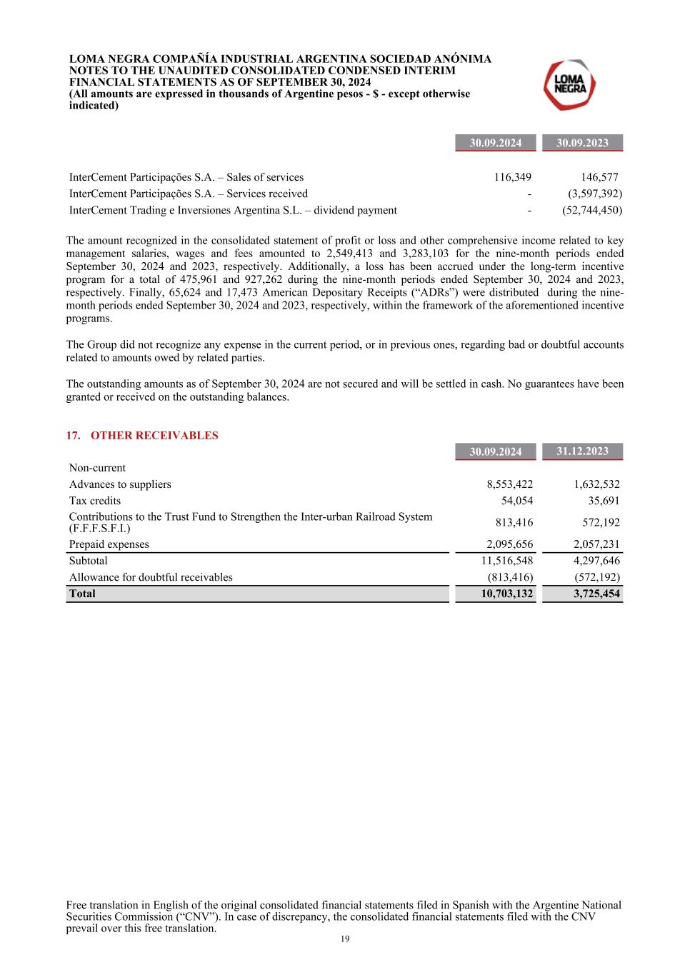 30.09.2024 30.09.2023 InterCement Participações S.A. – Sales of services 116,349 146,577 InterCement Participações S.A. – Services received - (3,597,392) InterCement Trading e Inversiones Argentina S.L. – dividend payment - (52,744,450) The amount recognized in the consolidated statement of profit or loss and other comprehensive income related to key management salaries, wages and fees amounted to 2,549,413 and 3,283,103 for the nine-month periods ended September 30, 2024 and 2023, respectively. Additionally, a loss has been accrued under the long-term incentive program for a total of 475,961 and 927,262 during the nine-month periods ended September 30, 2024 and 2023, respectively. Finally, 65,624 and 17,473 American Depositary Receipts (“ADRs”) were distributed during the nine- month periods ended September 30, 2024 and 2023, respectively, within the framework of the aforementioned incentive programs. The Group did not recognize any expense in the current period, or in previous ones, regarding bad or doubtful accounts related to amounts owed by related parties. The outstanding amounts as of September 30, 2024 are not secured and will be settled in cash. No guarantees have been granted or received on the outstanding balances. 17. OTHER RECEIVABLES 30.09.2024 31.12.2023 Non-current Advances to suppliers 8,553,422 1,632,532 Tax credits 54,054 35,691 Contributions to the Trust Fund to Strengthen the Inter-urban Railroad System (F.F.F.S.F.I.) 813,416 572,192 Prepaid expenses 2,095,656 2,057,231 Subtotal 11,516,548 4,297,646 Allowance for doubtful receivables (813,416) (572,192) Total 10,703,132 3,725,454 LOMA NEGRA COMPAÑÍA INDUSTRIAL ARGENTINA SOCIEDAD ANÓNIMA NOTES TO THE UNAUDITED CONSOLIDATED CONDENSED INTERIM FINANCIAL STATEMENTS AS OF SEPTEMBER 30, 2024 (All amounts are expressed in thousands of Argentine pesos - $ - except otherwise indicated) Free translation in English of the original consolidated financial statements filed in Spanish with the Argentine National Securities Commission (“CNV”). In case of discrepancy, the consolidated financial statements filed with the CNV prevail over this free translation. 19