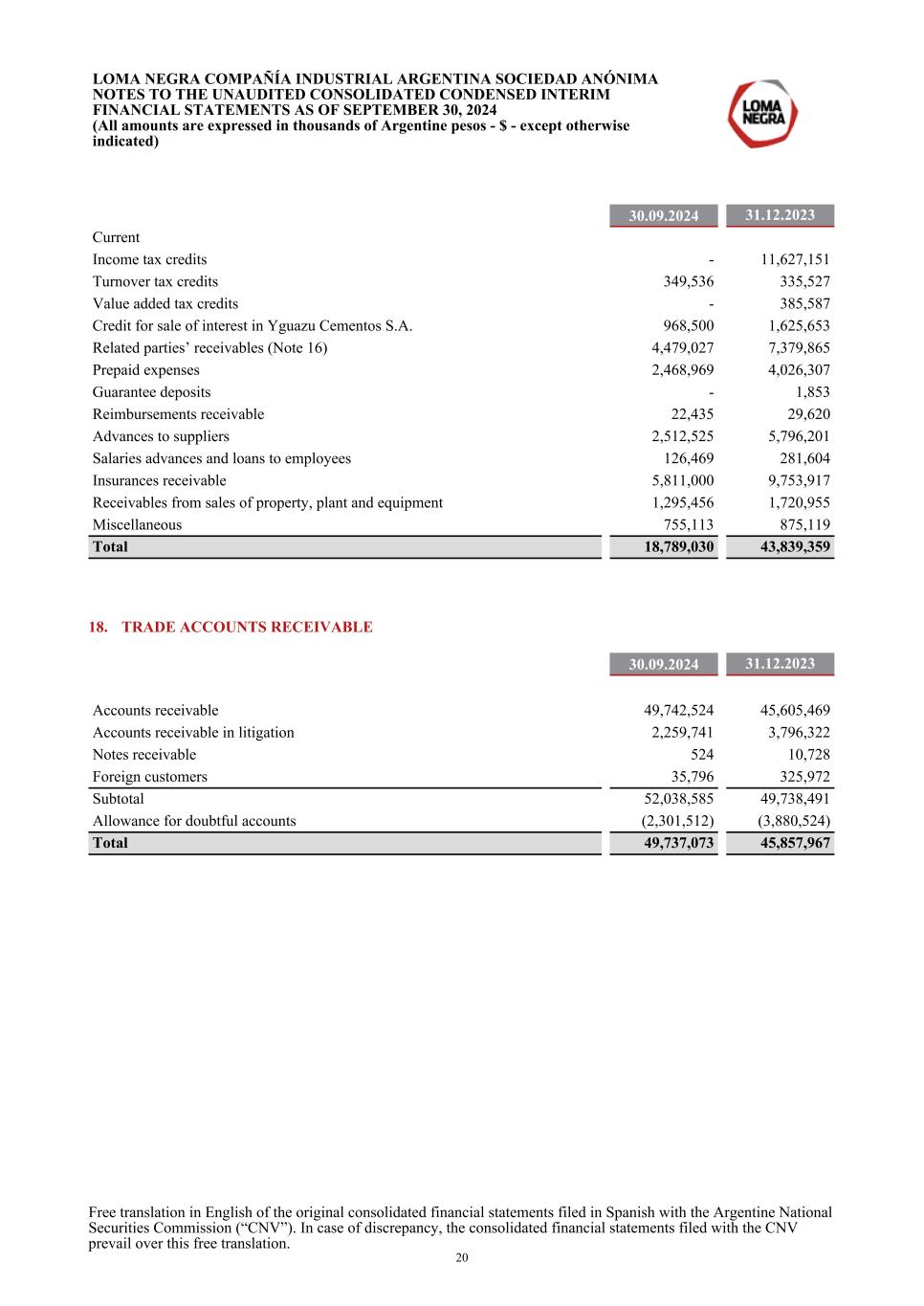 30.09.2024 31.12.2023 Current Income tax credits - 11,627,151 Turnover tax credits 349,536 335,527 Value added tax credits - 385,587 Credit for sale of interest in Yguazu Cementos S.A. 968,500 1,625,653 Related parties’ receivables (Note 16) 4,479,027 7,379,865 Prepaid expenses 2,468,969 4,026,307 Guarantee deposits - 1,853 Reimbursements receivable 22,435 29,620 Advances to suppliers 2,512,525 5,796,201 Salaries advances and loans to employees 126,469 281,604 Insurances receivable 5,811,000 9,753,917 Receivables from sales of property, plant and equipment 1,295,456 1,720,955 Miscellaneous 755,113 875,119 Total 18,789,030 43,839,359 18. TRADE ACCOUNTS RECEIVABLE 30.09.2024 31.12.2023 Accounts receivable 49,742,524 45,605,469 Accounts receivable in litigation 2,259,741 3,796,322 Notes receivable 524 10,728 Foreign customers 35,796 325,972 Subtotal 52,038,585 49,738,491 Allowance for doubtful accounts (2,301,512) (3,880,524) Total 49,737,073 45,857,967 LOMA NEGRA COMPAÑÍA INDUSTRIAL ARGENTINA SOCIEDAD ANÓNIMA NOTES TO THE UNAUDITED CONSOLIDATED CONDENSED INTERIM FINANCIAL STATEMENTS AS OF SEPTEMBER 30, 2024 (All amounts are expressed in thousands of Argentine pesos - $ - except otherwise indicated) Free translation in English of the original consolidated financial statements filed in Spanish with the Argentine National Securities Commission (“CNV”). In case of discrepancy, the consolidated financial statements filed with the CNV prevail over this free translation. 20