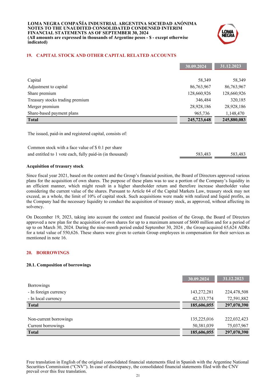 19. CAPITAL STOCK AND OTHER CAPITAL RELATED ACCOUNTS 30.09.2024 31.12.2023 Capital 58,349 58,349 Adjustment to capital 86,763,967 86,763,967 Share premium 128,660,926 128,660,926 Treasury stocks trading premium 346,484 320,185 Merger premium 28,928,186 28,928,186 Share-based payment plans 965,736 1,148,470 Total 245,723,648 245,880,083 The issued, paid-in and registered capital, consists of: Common stock with a face value of $ 0.1 per share and entitled to 1 vote each, fully paid-in (in thousand) 583,483 583,483 Acquisition of treasury stock Since fiscal year 2021, based on the context and the Group’s financial position, the Board of Directors approved various plans for the acquisition of own shares. The purpose of these plans was to use a portion of the Company’s liquidity in an efficient manner, which might result in a higher shareholder return and therefore increase shareholder value considering the current value of the shares. Pursuant to Article 64 of the Capital Markets Law, treasury stock may not exceed, as a whole, the limit of 10% of capital stock. Such acquisitions were made with realized and liquid profits, as the Company had the necessary liquidity to conduct the acquisition of treasury stock, as approved, without affecting its solvency. On December 19, 2023, taking into account the context and financial position of the Group, the Board of Directors approved a new plan for the acquisition of own shares for up to a maximum amount of $600 million and for a period of up to on March 30, 2024. During the nine-month period ended September 30, 2024 , the Group acquired 65,624 ADRs for a total value of 550,626. These shares were given to certain Group employees in compensation for their services as mentioned in note 16. 20. BORROWINGS 20.1. Composition of borrowings 30.09.2024 31.12.2023 Borrowings - In foreign currency 143,272,281 224,478,508 - In local currency 42,333,774 72,591,882 Total 185,606,055 297,070,390 Non-current borrowings 135,225,016 222,032,423 Current borrowings 50,381,039 75,037,967 Total 185,606,055 297,070,390 LOMA NEGRA COMPAÑÍA INDUSTRIAL ARGENTINA SOCIEDAD ANÓNIMA NOTES TO THE UNAUDITED CONSOLIDATED CONDENSED INTERIM FINANCIAL STATEMENTS AS OF SEPTEMBER 30, 2024 (All amounts are expressed in thousands of Argentine pesos - $ - except otherwise indicated) Free translation in English of the original consolidated financial statements filed in Spanish with the Argentine National Securities Commission (“CNV”). In case of discrepancy, the consolidated financial statements filed with the CNV prevail over this free translation. 21