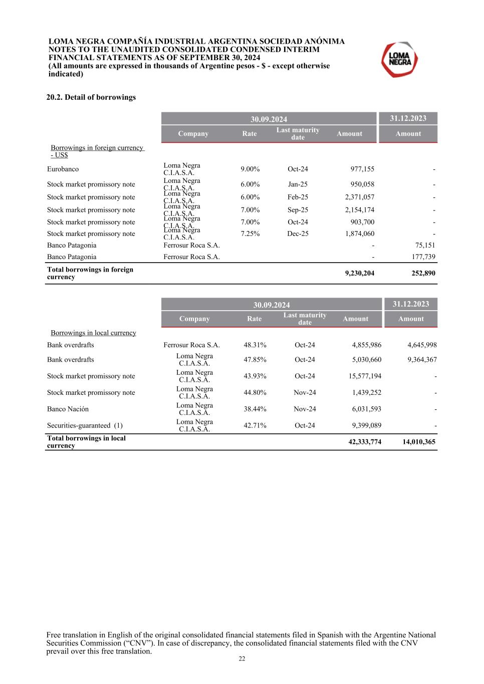 20.2. Detail of borrowings 30.09.2024 31.12.2023 Company Rate Last maturity date Amount Amount Borrowings in foreign currency - US$ Eurobanco Loma Negra C.I.A.S.A. 9.00% Oct-24 977,155 - Stock market promissory note Loma Negra C.I.A.S.A. 6.00% Jan-25 950,058 - Stock market promissory note Loma Negra C.I.A.S.A. 6.00% Feb-25 2,371,057 - Stock market promissory note Loma Negra C.I.A.S.A. 7.00% Sep-25 2,154,174 - Stock market promissory note Loma Negra C.I.A.S.A. 7.00% Oct-24 903,700 - Stock market promissory note Loma Negra C.I.A.S.A. 7.25% Dec-25 1,874,060 - Banco Patagonia Ferrosur Roca S.A. - 75,151 Banco Patagonia Ferrosur Roca S.A. - 177,739 Total borrowings in foreign currency 9,230,204 252,890 30.09.2024 31.12.2023 Company Rate Last maturity date Amount Amount Borrowings in local currency Bank overdrafts Ferrosur Roca S.A. 48.31% Oct-24 4,855,986 4,645,998 Bank overdrafts Loma Negra C.I.A.S.A. 47.85% Oct-24 5,030,660 9,364,367 Stock market promissory note Loma Negra C.I.A.S.A. 43.93% Oct-24 15,577,194 - Stock market promissory note Loma Negra C.I.A.S.A. 44.80% Nov-24 1,439,252 - Banco Nación Loma Negra C.I.A.S.A. 38.44% Nov-24 6,031,593 - Securities-guaranteed (1) Loma Negra C.I.A.S.A. 42.71% Oct-24 9,399,089 - Total borrowings in local currency 42,333,774 14,010,365 LOMA NEGRA COMPAÑÍA INDUSTRIAL ARGENTINA SOCIEDAD ANÓNIMA NOTES TO THE UNAUDITED CONSOLIDATED CONDENSED INTERIM FINANCIAL STATEMENTS AS OF SEPTEMBER 30, 2024 (All amounts are expressed in thousands of Argentine pesos - $ - except otherwise indicated) Free translation in English of the original consolidated financial statements filed in Spanish with the Argentine National Securities Commission (“CNV”). In case of discrepancy, the consolidated financial statements filed with the CNV prevail over this free translation. 22