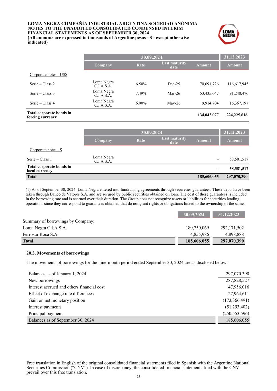 30.09.2024 31.12.2023 Company Rate Last maturity date Amount Amount Corporate notes - US$ Serie – Class 2 Loma Negra C.I.A.S.A. 6.50% Dec-25 70,691,726 116,617,945 Serie – Class 3 Loma Negra C.I.A.S.A. 7.49% Mar-26 53,435,647 91,240,476 Serie – Class 4 Loma Negra C.I.A.S.A. 6.00% May-26 9,914,704 16,367,197 Total corporate bonds in foreing currency 134,042,077 224,225,618 30.09.2024 31.12.2023 Company Rate Last maturity date Amount Amount Corporate notes - $ Serie – Class 1 Loma Negra C.I.A.S.A. - 58,581,517 Total corporate bonds in local currency - 58,581,517 Total 185,606,055 297,070,390 (1) As of September 30, 2024, Loma Negra entered into fundraising agreements through secureties guarantees. These debts have been taken through Banco de Valores S.A. and are secured by public securities obtained on loan. The cost of these guarantees is included in the borrowing rate and is accrued over their duration. The Group does not recognize assets or liabilities for securities lending operations since they correspond to guarantees obtained that do not grant rights or obligations linked to the ownership of the same. 30.09.2024 31.12.2023 Summary of borrowings by Company: Loma Negra C.I.A.S.A. 180,750,069 292,171,502 Ferrosur Roca S.A. 4,855,986 4,898,888 Total 185,606,055 297,070,390 20.3. Movements of borrowings The movements of borrowings for the nine-month period ended September 30, 2024 are as disclosed below: Balances as of January 1, 2024 297,070,390 New borrowings 287,828,527 Interest accrued and others financial cost 47,956,016 Effect of exchange rate differences 27,964,611 Gain on net monetary position (173,366,491) Interest payments (51,293,402) Principal payments (250,553,596) Balances as of September 30, 2024 185,606,055 LOMA NEGRA COMPAÑÍA INDUSTRIAL ARGENTINA SOCIEDAD ANÓNIMA NOTES TO THE UNAUDITED CONSOLIDATED CONDENSED INTERIM FINANCIAL STATEMENTS AS OF SEPTEMBER 30, 2024 (All amounts are expressed in thousands of Argentine pesos - $ - except otherwise indicated) Free translation in English of the original consolidated financial statements filed in Spanish with the Argentine National Securities Commission (“CNV”). In case of discrepancy, the consolidated financial statements filed with the CNV prevail over this free translation. 23