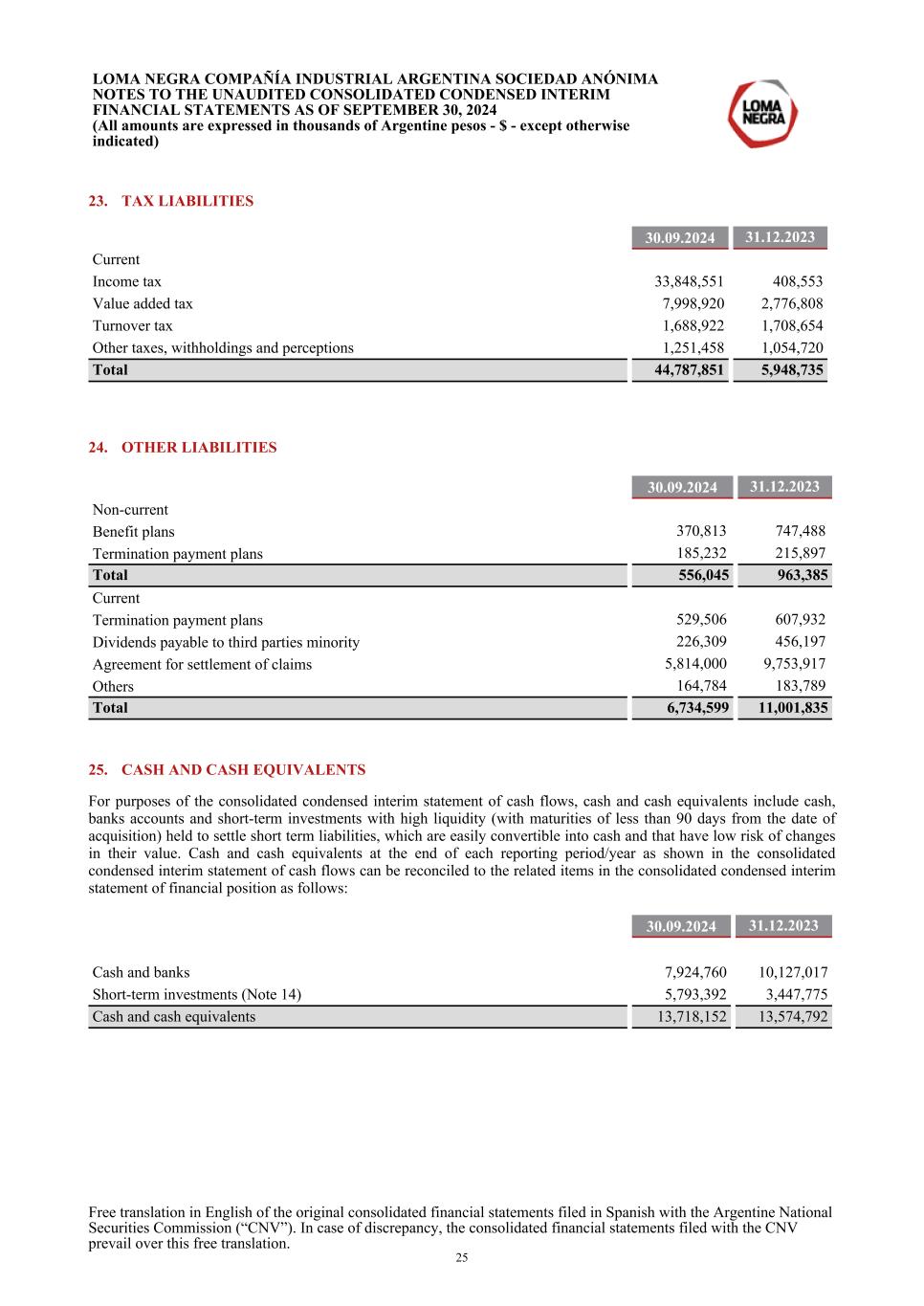 23. TAX LIABILITIES 30.09.2024 31.12.2023 Current Income tax 33,848,551 408,553 Value added tax 7,998,920 2,776,808 Turnover tax 1,688,922 1,708,654 Other taxes, withholdings and perceptions 1,251,458 1,054,720 Total 44,787,851 5,948,735 24. OTHER LIABILITIES 30.09.2024 31.12.2023 Non-current Benefit plans 370,813 747,488 Termination payment plans 185,232 215,897 Total 556,045 963,385 Current Termination payment plans 529,506 607,932 Dividends payable to third parties minority 226,309 456,197 Agreement for settlement of claims 5,814,000 9,753,917 Others 164,784 183,789 Total 6,734,599 11,001,835 25. CASH AND CASH EQUIVALENTS For purposes of the consolidated condensed interim statement of cash flows, cash and cash equivalents include cash, banks accounts and short-term investments with high liquidity (with maturities of less than 90 days from the date of acquisition) held to settle short term liabilities, which are easily convertible into cash and that have low risk of changes in their value. Cash and cash equivalents at the end of each reporting period/year as shown in the consolidated condensed interim statement of cash flows can be reconciled to the related items in the consolidated condensed interim statement of financial position as follows: 30.09.2024 31.12.2023 Cash and banks 7,924,760 10,127,017 Short-term investments (Note 14) 5,793,392 3,447,775 Cash and cash equivalents 13,718,152 13,574,792 LOMA NEGRA COMPAÑÍA INDUSTRIAL ARGENTINA SOCIEDAD ANÓNIMA NOTES TO THE UNAUDITED CONSOLIDATED CONDENSED INTERIM FINANCIAL STATEMENTS AS OF SEPTEMBER 30, 2024 (All amounts are expressed in thousands of Argentine pesos - $ - except otherwise indicated) Free translation in English of the original consolidated financial statements filed in Spanish with the Argentine National Securities Commission (“CNV”). In case of discrepancy, the consolidated financial statements filed with the CNV prevail over this free translation. 25