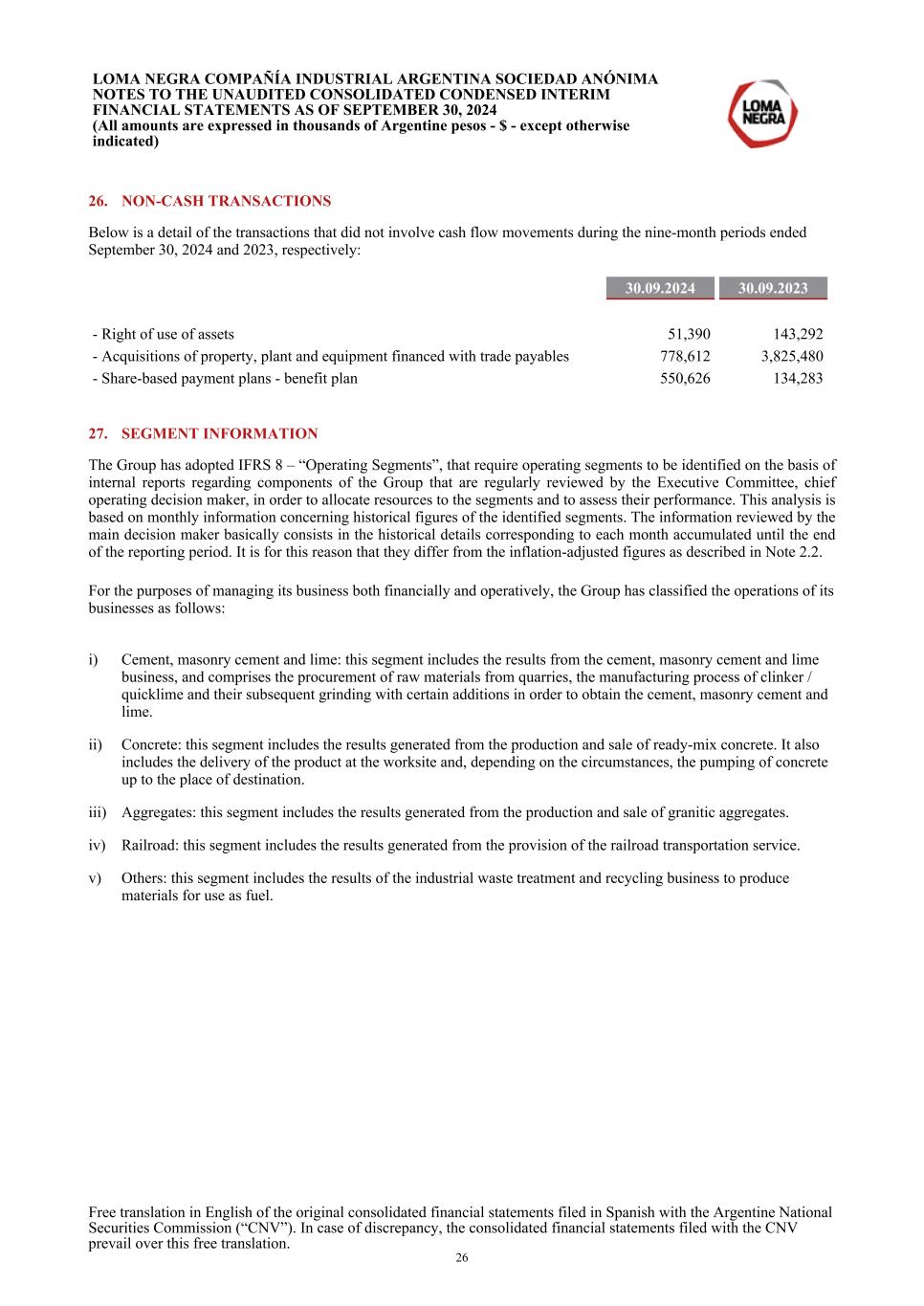 26. NON-CASH TRANSACTIONS Below is a detail of the transactions that did not involve cash flow movements during the nine-month periods ended September 30, 2024 and 2023, respectively: 30.09.2024 30.09.2023 - Right of use of assets 51,390 143,292 - Acquisitions of property, plant and equipment financed with trade payables 778,612 3,825,480 - Share-based payment plans - benefit plan 550,626 134,283 27. SEGMENT INFORMATION The Group has adopted IFRS 8 – “Operating Segments”, that require operating segments to be identified on the basis of internal reports regarding components of the Group that are regularly reviewed by the Executive Committee, chief operating decision maker, in order to allocate resources to the segments and to assess their performance. This analysis is based on monthly information concerning historical figures of the identified segments. The information reviewed by the main decision maker basically consists in the historical details corresponding to each month accumulated until the end of the reporting period. It is for this reason that they differ from the inflation-adjusted figures as described in Note 2.2. For the purposes of managing its business both financially and operatively, the Group has classified the operations of its businesses as follows: i) Cement, masonry cement and lime: this segment includes the results from the cement, masonry cement and lime business, and comprises the procurement of raw materials from quarries, the manufacturing process of clinker / quicklime and their subsequent grinding with certain additions in order to obtain the cement, masonry cement and lime. ii) Concrete: this segment includes the results generated from the production and sale of ready-mix concrete. It also includes the delivery of the product at the worksite and, depending on the circumstances, the pumping of concrete up to the place of destination. iii) Aggregates: this segment includes the results generated from the production and sale of granitic aggregates. iv) Railroad: this segment includes the results generated from the provision of the railroad transportation service. v) Others: this segment includes the results of the industrial waste treatment and recycling business to produce materials for use as fuel. LOMA NEGRA COMPAÑÍA INDUSTRIAL ARGENTINA SOCIEDAD ANÓNIMA NOTES TO THE UNAUDITED CONSOLIDATED CONDENSED INTERIM FINANCIAL STATEMENTS AS OF SEPTEMBER 30, 2024 (All amounts are expressed in thousands of Argentine pesos - $ - except otherwise indicated) Free translation in English of the original consolidated financial statements filed in Spanish with the Argentine National Securities Commission (“CNV”). In case of discrepancy, the consolidated financial statements filed with the CNV prevail over this free translation. 26