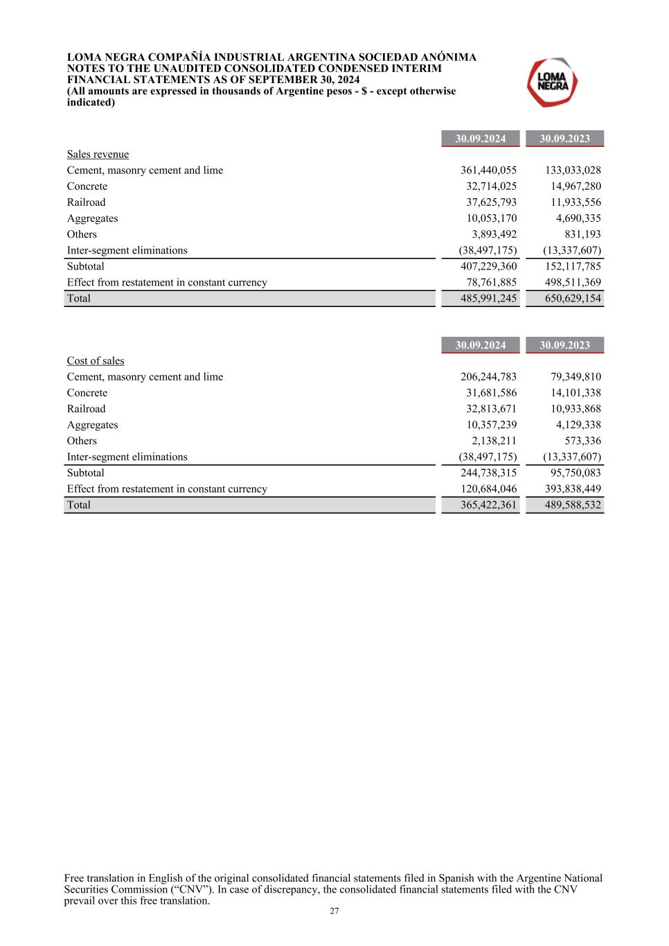 30.09.2024 30.09.2023 Sales revenue Cement, masonry cement and lime 361,440,055 133,033,028 Concrete 32,714,025 14,967,280 Railroad 37,625,793 11,933,556 Aggregates 10,053,170 4,690,335 Others 3,893,492 831,193 Inter-segment eliminations (38,497,175) (13,337,607) Subtotal 407,229,360 152,117,785 Effect from restatement in constant currency 78,761,885 498,511,369 Total 485,991,245 650,629,154 30.09.2024 30.09.2023 Cost of sales Cement, masonry cement and lime 206,244,783 79,349,810 Concrete 31,681,586 14,101,338 Railroad 32,813,671 10,933,868 Aggregates 10,357,239 4,129,338 Others 2,138,211 573,336 Inter-segment eliminations (38,497,175) (13,337,607) Subtotal 244,738,315 95,750,083 Effect from restatement in constant currency 120,684,046 393,838,449 Total 365,422,361 489,588,532 LOMA NEGRA COMPAÑÍA INDUSTRIAL ARGENTINA SOCIEDAD ANÓNIMA NOTES TO THE UNAUDITED CONSOLIDATED CONDENSED INTERIM FINANCIAL STATEMENTS AS OF SEPTEMBER 30, 2024 (All amounts are expressed in thousands of Argentine pesos - $ - except otherwise indicated) Free translation in English of the original consolidated financial statements filed in Spanish with the Argentine National Securities Commission (“CNV”). In case of discrepancy, the consolidated financial statements filed with the CNV prevail over this free translation. 27
