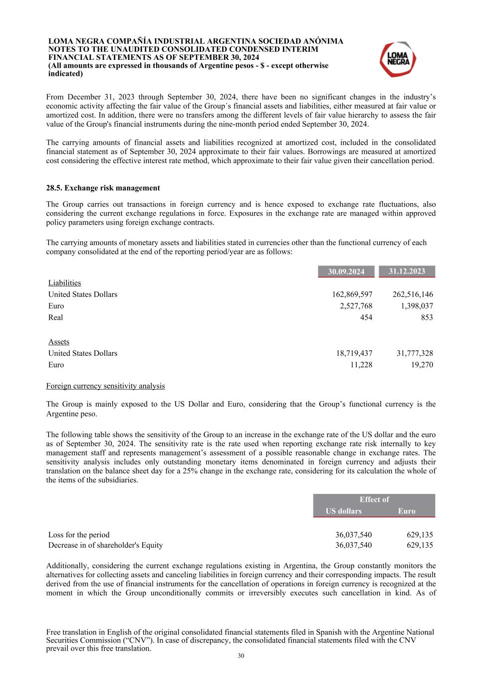 From December 31, 2023 through September 30, 2024, there have been no significant changes in the industry’s economic activity affecting the fair value of the Group´s financial assets and liabilities, either measured at fair value or amortized cost. In addition, there were no transfers among the different levels of fair value hierarchy to assess the fair value of the Group's financial instruments during the nine-month period ended September 30, 2024. The carrying amounts of financial assets and liabilities recognized at amortized cost, included in the consolidated financial statement as of September 30, 2024 approximate to their fair values. Borrowings are measured at amortized cost considering the effective interest rate method, which approximate to their fair value given their cancellation period. 28.5. Exchange risk management The Group carries out transactions in foreign currency and is hence exposed to exchange rate fluctuations, also considering the current exchange regulations in force. Exposures in the exchange rate are managed within approved policy parameters using foreign exchange contracts. The carrying amounts of monetary assets and liabilities stated in currencies other than the functional currency of each company consolidated at the end of the reporting period/year are as follows: 30.09.2024 31.12.2023 Liabilities United States Dollars 162,869,597 262,516,146 Euro 2,527,768 1,398,037 Real 454 853 Assets United States Dollars 18,719,437 31,777,328 Euro 11,228 19,270 Foreign currency sensitivity analysis The Group is mainly exposed to the US Dollar and Euro, considering that the Group’s functional currency is the Argentine peso. The following table shows the sensitivity of the Group to an increase in the exchange rate of the US dollar and the euro as of September 30, 2024. The sensitivity rate is the rate used when reporting exchange rate risk internally to key management staff and represents management’s assessment of a possible reasonable change in exchange rates. The sensitivity analysis includes only outstanding monetary items denominated in foreign currency and adjusts their translation on the balance sheet day for a 25% change in the exchange rate, considering for its calculation the whole of the items of the subsidiaries. Effect of US dollars Euro Loss for the period 36,037,540 629,135 Decrease in of shareholder's Equity 36,037,540 629,135 Additionally, considering the current exchange regulations existing in Argentina, the Group constantly monitors the alternatives for collecting assets and canceling liabilities in foreign currency and their corresponding impacts. The result derived from the use of financial instruments for the cancellation of operations in foreign currency is recognized at the moment in which the Group unconditionally commits or irreversibly executes such cancellation in kind. As of LOMA NEGRA COMPAÑÍA INDUSTRIAL ARGENTINA SOCIEDAD ANÓNIMA NOTES TO THE UNAUDITED CONSOLIDATED CONDENSED INTERIM FINANCIAL STATEMENTS AS OF SEPTEMBER 30, 2024 (All amounts are expressed in thousands of Argentine pesos - $ - except otherwise indicated) Free translation in English of the original consolidated financial statements filed in Spanish with the Argentine National Securities Commission (“CNV”). In case of discrepancy, the consolidated financial statements filed with the CNV prevail over this free translation. 30
