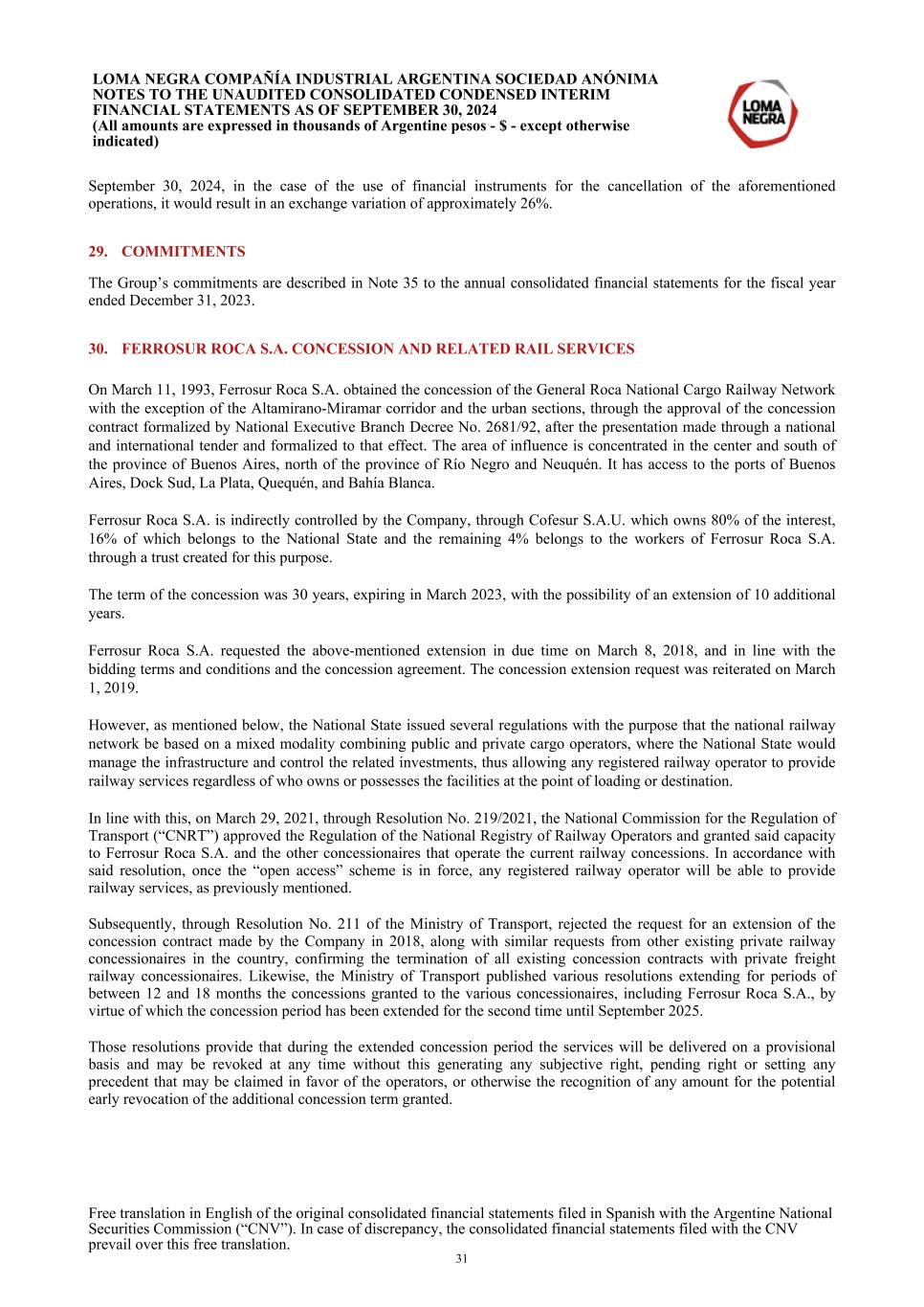 September 30, 2024, in the case of the use of financial instruments for the cancellation of the aforementioned operations, it would result in an exchange variation of approximately 26%. 29. COMMITMENTS The Group’s commitments are described in Note 35 to the annual consolidated financial statements for the fiscal year ended December 31, 2023. 30. FERROSUR ROCA S.A. CONCESSION AND RELATED RAIL SERVICES On March 11, 1993, Ferrosur Roca S.A. obtained the concession of the General Roca National Cargo Railway Network with the exception of the Altamirano-Miramar corridor and the urban sections, through the approval of the concession contract formalized by National Executive Branch Decree No. 2681/92, after the presentation made through a national and international tender and formalized to that effect. The area of influence is concentrated in the center and south of the province of Buenos Aires, north of the province of Río Negro and Neuquén. It has access to the ports of Buenos Aires, Dock Sud, La Plata, Quequén, and Bahía Blanca. Ferrosur Roca S.A. is indirectly controlled by the Company, through Cofesur S.A.U. which owns 80% of the interest, 16% of which belongs to the National State and the remaining 4% belongs to the workers of Ferrosur Roca S.A. through a trust created for this purpose. The term of the concession was 30 years, expiring in March 2023, with the possibility of an extension of 10 additional years. Ferrosur Roca S.A. requested the above-mentioned extension in due time on March 8, 2018, and in line with the bidding terms and conditions and the concession agreement. The concession extension request was reiterated on March 1, 2019. However, as mentioned below, the National State issued several regulations with the purpose that the national railway network be based on a mixed modality combining public and private cargo operators, where the National State would manage the infrastructure and control the related investments, thus allowing any registered railway operator to provide railway services regardless of who owns or possesses the facilities at the point of loading or destination. In line with this, on March 29, 2021, through Resolution No. 219/2021, the National Commission for the Regulation of Transport (“CNRT”) approved the Regulation of the National Registry of Railway Operators and granted said capacity to Ferrosur Roca S.A. and the other concessionaires that operate the current railway concessions. In accordance with said resolution, once the “open access” scheme is in force, any registered railway operator will be able to provide railway services, as previously mentioned. Subsequently, through Resolution No. 211 of the Ministry of Transport, rejected the request for an extension of the concession contract made by the Company in 2018, along with similar requests from other existing private railway concessionaires in the country, confirming the termination of all existing concession contracts with private freight railway concessionaires. Likewise, the Ministry of Transport published various resolutions extending for periods of between 12 and 18 months the concessions granted to the various concessionaires, including Ferrosur Roca S.A., by virtue of which the concession period has been extended for the second time until September 2025. Those resolutions provide that during the extended concession period the services will be delivered on a provisional basis and may be revoked at any time without this generating any subjective right, pending right or setting any precedent that may be claimed in favor of the operators, or otherwise the recognition of any amount for the potential early revocation of the additional concession term granted. LOMA NEGRA COMPAÑÍA INDUSTRIAL ARGENTINA SOCIEDAD ANÓNIMA NOTES TO THE UNAUDITED CONSOLIDATED CONDENSED INTERIM FINANCIAL STATEMENTS AS OF SEPTEMBER 30, 2024 (All amounts are expressed in thousands of Argentine pesos - $ - except otherwise indicated) Free translation in English of the original consolidated financial statements filed in Spanish with the Argentine National Securities Commission (“CNV”). In case of discrepancy, the consolidated financial statements filed with the CNV prevail over this free translation. 31
