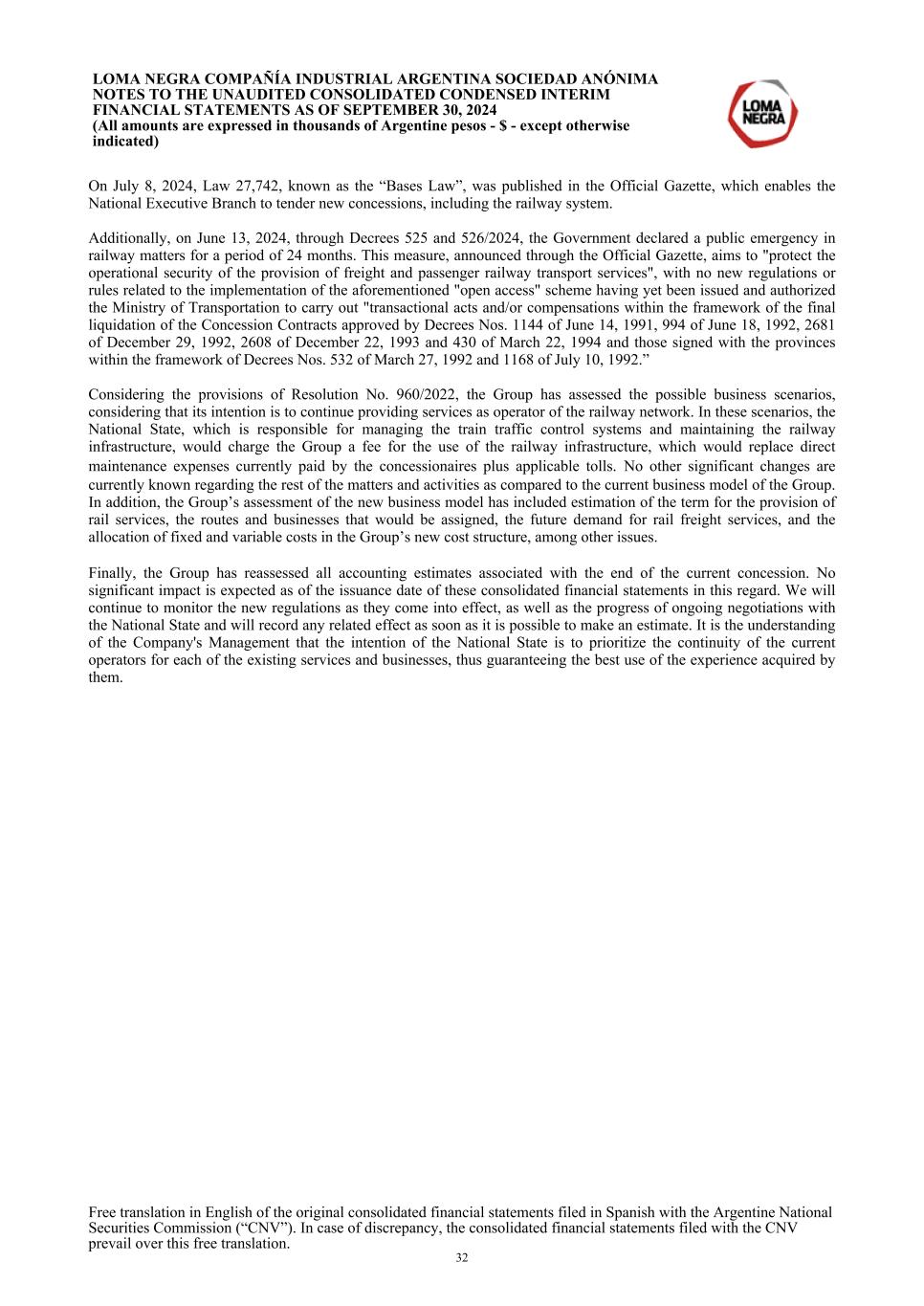 On July 8, 2024, Law 27,742, known as the “Bases Law”, was published in the Official Gazette, which enables the National Executive Branch to tender new concessions, including the railway system. Additionally, on June 13, 2024, through Decrees 525 and 526/2024, the Government declared a public emergency in railway matters for a period of 24 months. This measure, announced through the Official Gazette, aims to "protect the operational security of the provision of freight and passenger railway transport services", with no new regulations or rules related to the implementation of the aforementioned "open access" scheme having yet been issued and authorized the Ministry of Transportation to carry out "transactional acts and/or compensations within the framework of the final liquidation of the Concession Contracts approved by Decrees Nos. 1144 of June 14, 1991, 994 of June 18, 1992, 2681 of December 29, 1992, 2608 of December 22, 1993 and 430 of March 22, 1994 and those signed with the provinces within the framework of Decrees Nos. 532 of March 27, 1992 and 1168 of July 10, 1992.” Considering the provisions of Resolution No. 960/2022, the Group has assessed the possible business scenarios, considering that its intention is to continue providing services as operator of the railway network. In these scenarios, the National State, which is responsible for managing the train traffic control systems and maintaining the railway infrastructure, would charge the Group a fee for the use of the railway infrastructure, which would replace direct maintenance expenses currently paid by the concessionaires plus applicable tolls. No other significant changes are currently known regarding the rest of the matters and activities as compared to the current business model of the Group. In addition, the Group’s assessment of the new business model has included estimation of the term for the provision of rail services, the routes and businesses that would be assigned, the future demand for rail freight services, and the allocation of fixed and variable costs in the Group’s new cost structure, among other issues. Finally, the Group has reassessed all accounting estimates associated with the end of the current concession. No significant impact is expected as of the issuance date of these consolidated financial statements in this regard. We will continue to monitor the new regulations as they come into effect, as well as the progress of ongoing negotiations with the National State and will record any related effect as soon as it is possible to make an estimate. It is the understanding of the Company's Management that the intention of the National State is to prioritize the continuity of the current operators for each of the existing services and businesses, thus guaranteeing the best use of the experience acquired by them. LOMA NEGRA COMPAÑÍA INDUSTRIAL ARGENTINA SOCIEDAD ANÓNIMA NOTES TO THE UNAUDITED CONSOLIDATED CONDENSED INTERIM FINANCIAL STATEMENTS AS OF SEPTEMBER 30, 2024 (All amounts are expressed in thousands of Argentine pesos - $ - except otherwise indicated) Free translation in English of the original consolidated financial statements filed in Spanish with the Argentine National Securities Commission (“CNV”). In case of discrepancy, the consolidated financial statements filed with the CNV prevail over this free translation. 32