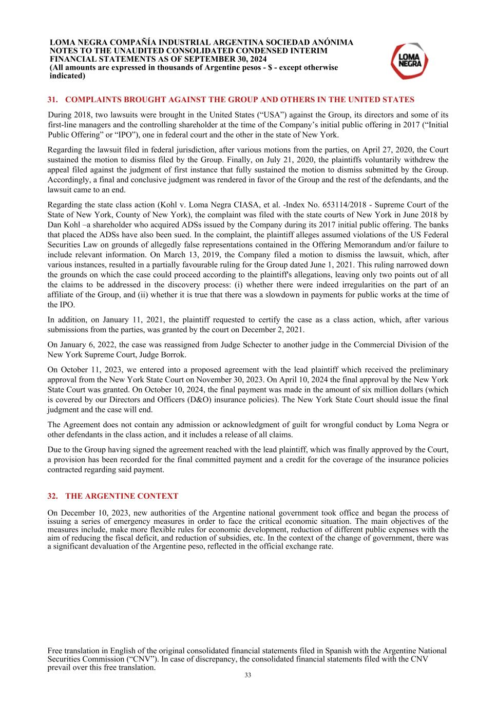 31. COMPLAINTS BROUGHT AGAINST THE GROUP AND OTHERS IN THE UNITED STATES During 2018, two lawsuits were brought in the United States (“USA”) against the Group, its directors and some of its first-line managers and the controlling shareholder at the time of the Company’s initial public offering in 2017 (“Initial Public Offering” or “IPO”), one in federal court and the other in the state of New York. Regarding the lawsuit filed in federal jurisdiction, after various motions from the parties, on April 27, 2020, the Court sustained the motion to dismiss filed by the Group. Finally, on July 21, 2020, the plaintiffs voluntarily withdrew the appeal filed against the judgment of first instance that fully sustained the motion to dismiss submitted by the Group. Accordingly, a final and conclusive judgment was rendered in favor of the Group and the rest of the defendants, and the lawsuit came to an end. Regarding the state class action (Kohl v. Loma Negra CIASA, et al. -Index No. 653114/2018 - Supreme Court of the State of New York, County of New York), the complaint was filed with the state courts of New York in June 2018 by Dan Kohl –a shareholder who acquired ADSs issued by the Company during its 2017 initial public offering. The banks that placed the ADSs have also been sued. In the complaint, the plaintiff alleges assumed violations of the US Federal Securities Law on grounds of allegedly false representations contained in the Offering Memorandum and/or failure to include relevant information. On March 13, 2019, the Company filed a motion to dismiss the lawsuit, which, after various instances, resulted in a partially favourable ruling for the Group dated June 1, 2021. This ruling narrowed down the grounds on which the case could proceed according to the plaintiff's allegations, leaving only two points out of all the claims to be addressed in the discovery process: (i) whether there were indeed irregularities on the part of an affiliate of the Group, and (ii) whether it is true that there was a slowdown in payments for public works at the time of the IPO. In addition, on January 11, 2021, the plaintiff requested to certify the case as a class action, which, after various submissions from the parties, was granted by the court on December 2, 2021. On January 6, 2022, the case was reassigned from Judge Schecter to another judge in the Commercial Division of the New York Supreme Court, Judge Borrok. On October 11, 2023, we entered into a proposed agreement with the lead plaintiff which received the preliminary approval from the New York State Court on November 30, 2023. On April 10, 2024 the final approval by the New York State Court was granted. On October 10, 2024, the final payment was made in the amount of six million dollars (which is covered by our Directors and Officers (D&O) insurance policies). The New York State Court should issue the final judgment and the case will end. The Agreement does not contain any admission or acknowledgment of guilt for wrongful conduct by Loma Negra or other defendants in the class action, and it includes a release of all claims. Due to the Group having signed the agreement reached with the lead plaintiff, which was finally approved by the Court, a provision has been recorded for the final committed payment and a credit for the coverage of the insurance policies contracted regarding said payment. 32. THE ARGENTINE CONTEXT On December 10, 2023, new authorities of the Argentine national government took office and began the process of issuing a series of emergency measures in order to face the critical economic situation. The main objectives of the measures include, make more flexible rules for economic development, reduction of different public expenses with the aim of reducing the fiscal deficit, and reduction of subsidies, etc. In the context of the change of government, there was a significant devaluation of the Argentine peso, reflected in the official exchange rate. LOMA NEGRA COMPAÑÍA INDUSTRIAL ARGENTINA SOCIEDAD ANÓNIMA NOTES TO THE UNAUDITED CONSOLIDATED CONDENSED INTERIM FINANCIAL STATEMENTS AS OF SEPTEMBER 30, 2024 (All amounts are expressed in thousands of Argentine pesos - $ - except otherwise indicated) Free translation in English of the original consolidated financial statements filed in Spanish with the Argentine National Securities Commission (“CNV”). In case of discrepancy, the consolidated financial statements filed with the CNV prevail over this free translation. 33