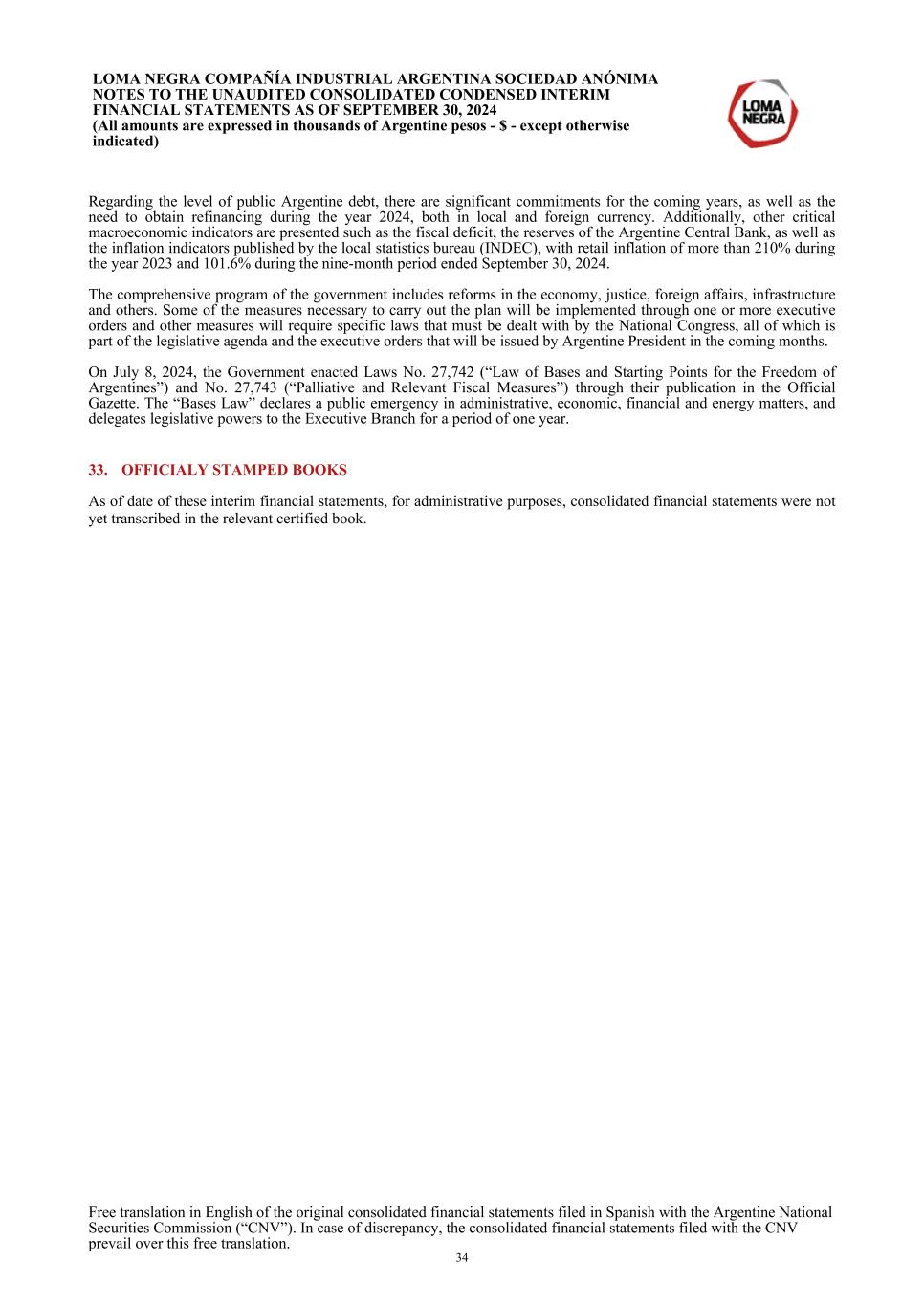 Regarding the level of public Argentine debt, there are significant commitments for the coming years, as well as the need to obtain refinancing during the year 2024, both in local and foreign currency. Additionally, other critical macroeconomic indicators are presented such as the fiscal deficit, the reserves of the Argentine Central Bank, as well as the inflation indicators published by the local statistics bureau (INDEC), with retail inflation of more than 210% during the year 2023 and 101.6% during the nine-month period ended September 30, 2024. The comprehensive program of the government includes reforms in the economy, justice, foreign affairs, infrastructure and others. Some of the measures necessary to carry out the plan will be implemented through one or more executive orders and other measures will require specific laws that must be dealt with by the National Congress, all of which is part of the legislative agenda and the executive orders that will be issued by Argentine President in the coming months. On July 8, 2024, the Government enacted Laws No. 27,742 (“Law of Bases and Starting Points for the Freedom of Argentines”) and No. 27,743 (“Palliative and Relevant Fiscal Measures”) through their publication in the Official Gazette. The “Bases Law” declares a public emergency in administrative, economic, financial and energy matters, and delegates legislative powers to the Executive Branch for a period of one year. 33. OFFICIALY STAMPED BOOKS As of date of these interim financial statements, for administrative purposes, consolidated financial statements were not yet transcribed in the relevant certified book. LOMA NEGRA COMPAÑÍA INDUSTRIAL ARGENTINA SOCIEDAD ANÓNIMA NOTES TO THE UNAUDITED CONSOLIDATED CONDENSED INTERIM FINANCIAL STATEMENTS AS OF SEPTEMBER 30, 2024 (All amounts are expressed in thousands of Argentine pesos - $ - except otherwise indicated) Free translation in English of the original consolidated financial statements filed in Spanish with the Argentine National Securities Commission (“CNV”). In case of discrepancy, the consolidated financial statements filed with the CNV prevail over this free translation. 34