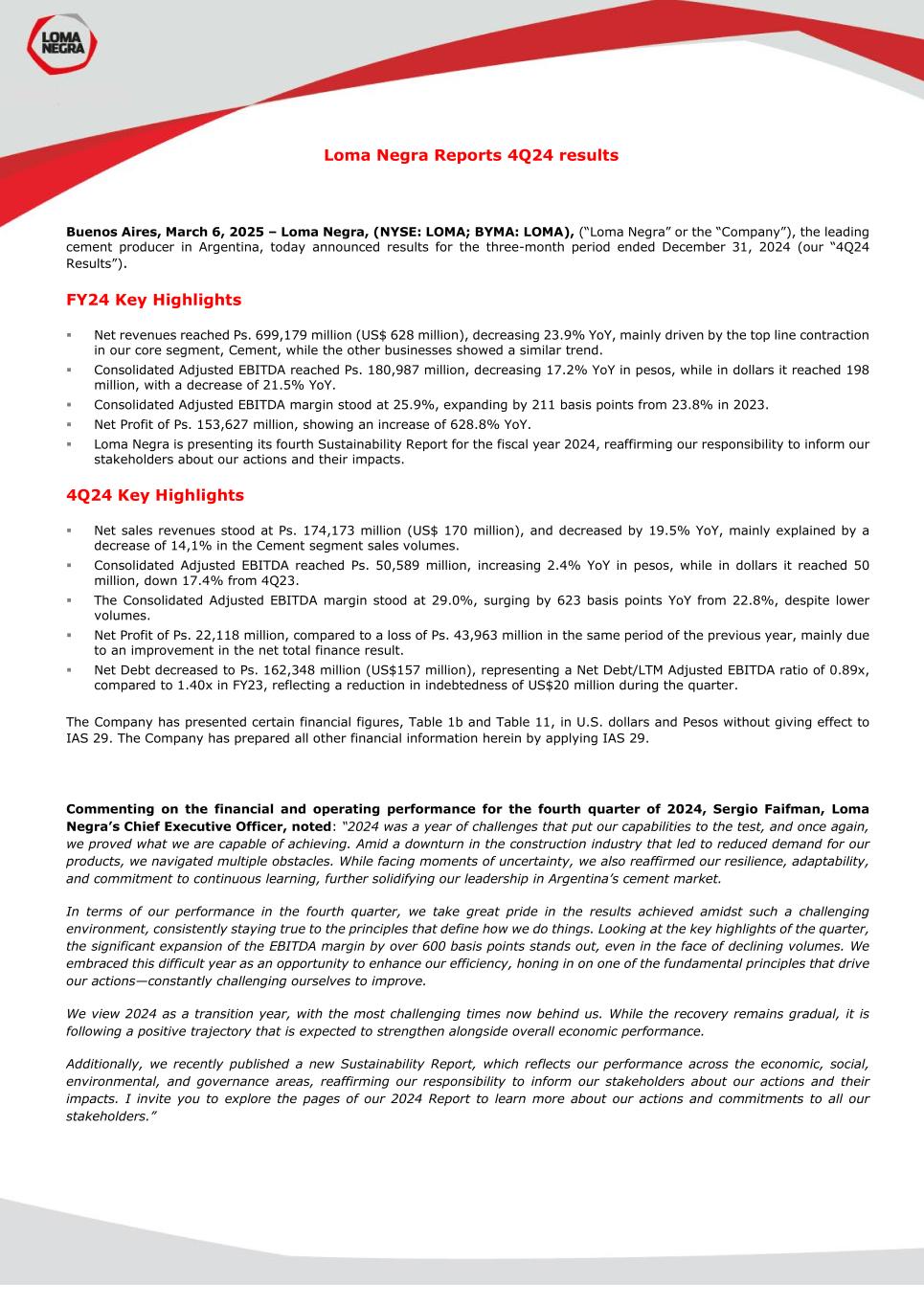 Loma Negra Reports 4Q24 results Buenos Aires, March 6, 2025 – Loma Negra, (NYSE: LOMA; BYMA: LOMA), (“Loma Negra” or the “Company”), the leading cement producer in Argentina, today announced results for the three-month period ended December 31, 2024 (our “4Q24 Results”). FY24 Key Highlights  Net revenues reached Ps. 699,179 million (US$ 628 million), decreasing 23.9% YoY, mainly driven by the top line contraction in our core segment, Cement, while the other businesses showed a similar trend.  Consolidated Adjusted EBITDA reached Ps. 180,987 million, decreasing 17.2% YoY in pesos, while in dollars it reached 198 million, with a decrease of 21.5% YoY.  Consolidated Adjusted EBITDA margin stood at 25.9%, expanding by 211 basis points from 23.8% in 2023.  Net Profit of Ps. 153,627 million, showing an increase of 628.8% YoY.  Loma Negra is presenting its fourth Sustainability Report for the fiscal year 2024, reaffirming our responsibility to inform our stakeholders about our actions and their impacts. 4Q24 Key Highlights  Net sales revenues stood at Ps. 174,173 million (US$ 170 million), and decreased by 19.5% YoY, mainly explained by a decrease of 14,1% in the Cement segment sales volumes.  Consolidated Adjusted EBITDA reached Ps. 50,589 million, increasing 2.4% YoY in pesos, while in dollars it reached 50 million, down 17.4% from 4Q23.  The Consolidated Adjusted EBITDA margin stood at 29.0%, surging by 623 basis points YoY from 22.8%, despite lower volumes.  Net Profit of Ps. 22,118 million, compared to a loss of Ps. 43,963 million in the same period of the previous year, mainly due to an improvement in the net total finance result.  Net Debt decreased to Ps. 162,348 million (US$157 million), representing a Net Debt/LTM Adjusted EBITDA ratio of 0.89x, compared to 1.40x in FY23, reflecting a reduction in indebtedness of US$20 million during the quarter. The Company has presented certain financial figures, Table 1b and Table 11, in U.S. dollars and Pesos without giving effect to IAS 29. The Company has prepared all other financial information herein by applying IAS 29. Commenting on the financial and operating performance for the fourth quarter of 2024, Sergio Faifman, Loma Negra’s Chief Executive Officer, noted: “2024 was a year of challenges that put our capabilities to the test, and once again, we proved what we are capable of achieving. Amid a downturn in the construction industry that led to reduced demand for our products, we navigated multiple obstacles. While facing moments of uncertainty, we also reaffirmed our resilience, adaptability, and commitment to continuous learning, further solidifying our leadership in Argentina’s cement market. In terms of our performance in the fourth quarter, we take great pride in the results achieved amidst such a challenging environment, consistently staying true to the principles that define how we do things. Looking at the key highlights of the quarter, the significant expansion of the EBITDA margin by over 600 basis points stands out, even in the face of declining volumes. We embraced this difficult year as an opportunity to enhance our efficiency, honing in on one of the fundamental principles that drive our actions—constantly challenging ourselves to improve. We view 2024 as a transition year, with the most challenging times now behind us. While the recovery remains gradual, it is following a positive trajectory that is expected to strengthen alongside overall economic performance. Additionally, we recently published a new Sustainability Report, which reflects our performance across the economic, social, environmental, and governance areas, reaffirming our responsibility to inform our stakeholders about our actions and their impacts. I invite you to explore the pages of our 2024 Report to learn more about our actions and commitments to all our stakeholders.”
