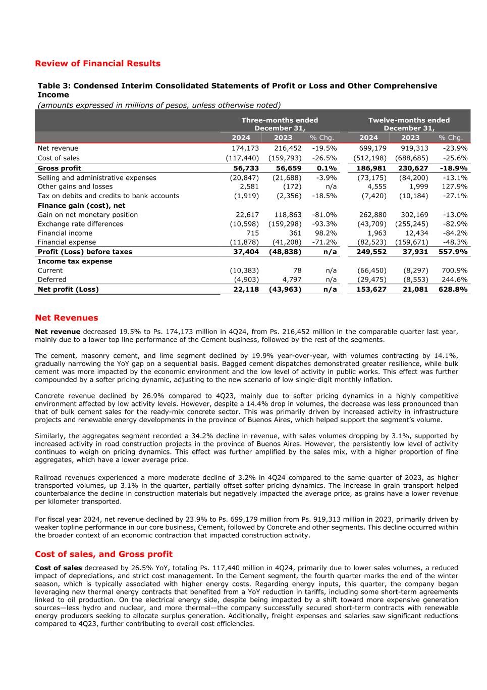 Review of Financial Results Table 3: Condensed Interim Consolidated Statements of Profit or Loss and Other Comprehensive Income (amounts expressed in millions of pesos, unless otherwise noted) Three-months ended December 31, Twelve-months ended December 31, 2024 2023 % Chg. 2024 2023 % Chg. Net revenue 174,173 216,452 -19.5% 699,179 919,313 -23.9% Cost of sales (117,440) (159,793) -26.5% (512,198) (688,685) -25.6% Gross profit 56,733 56,659 0.1% 186,981 230,627 -18.9% Selling and administrative expenses (20,847) (21,688) -3.9% (73,175) (84,200) -13.1% Other gains and losses 2,581 (172) n/a 4,555 1,999 127.9% Tax on debits and credits to bank accounts (1,919) (2,356) -18.5% (7,420) (10,184) -27.1% Finance gain (cost), net Gain on net monetary position 22,617 118,863 -81.0% 262,880 302,169 -13.0% Exchange rate differences (10,598) (159,298) -93.3% (43,709) (255,245) -82.9% Financial income 715 361 98.2% 1,963 12,434 -84.2% Financial expense (11,878) (41,208) -71.2% (82,523) (159,671) -48.3% Profit (Loss) before taxes 37,404 (48,838) n/a 249,552 37,931 557.9% Income tax expense Current (10,383) 78 n/a (66,450) (8,297) 700.9% Deferred (4,903) 4,797 n/a (29,475) (8,553) 244.6% Net profit (Loss) 22,118 (43,963) n/a 153,627 21,081 628.8% Net Revenues Net revenue decreased 19.5% to Ps. 174,173 million in 4Q24, from Ps. 216,452 million in the comparable quarter last year, mainly due to a lower top line performance of the Cement business, followed by the rest of the segments. The cement, masonry cement, and lime segment declined by 19.9% year-over-year, with volumes contracting by 14.1%, gradually narrowing the YoY gap on a sequential basis. Bagged cement dispatches demonstrated greater resilience, while bulk cement was more impacted by the economic environment and the low level of activity in public works. This effect was further compounded by a softer pricing dynamic, adjusting to the new scenario of low single-digit monthly inflation. Concrete revenue declined by 26.9% compared to 4Q23, mainly due to softer pricing dynamics in a highly competitive environment affected by low activity levels. However, despite a 14.4% drop in volumes, the decrease was less pronounced than that of bulk cement sales for the ready-mix concrete sector. This was primarily driven by increased activity in infrastructure projects and renewable energy developments in the province of Buenos Aires, which helped support the segment’s volume. Similarly, the aggregates segment recorded a 34.2% decline in revenue, with sales volumes dropping by 3.1%, supported by increased activity in road construction projects in the province of Buenos Aires. However, the persistently low level of activity continues to weigh on pricing dynamics. This effect was further amplified by the sales mix, with a higher proportion of fine aggregates, which have a lower average price. Railroad revenues experienced a more moderate decline of 3.2% in 4Q24 compared to the same quarter of 2023, as higher transported volumes, up 3.1% in the quarter, partially offset softer pricing dynamics. The increase in grain transport helped counterbalance the decline in construction materials but negatively impacted the average price, as grains have a lower revenue per kilometer transported. For fiscal year 2024, net revenue declined by 23.9% to Ps. 699,179 million from Ps. 919,313 million in 2023, primarily driven by weaker topline performance in our core business, Cement, followed by Concrete and other segments. This decline occurred within the broader context of an economic contraction that impacted construction activity. Cost of sales, and Gross profit Cost of sales decreased by 26.5% YoY, totaling Ps. 117,440 million in 4Q24, primarily due to lower sales volumes, a reduced impact of depreciations, and strict cost management. In the Cement segment, the fourth quarter marks the end of the winter season, which is typically associated with higher energy costs. Regarding energy inputs, this quarter, the company began leveraging new thermal energy contracts that benefited from a YoY reduction in tariffs, including some short-term agreements linked to oil production. On the electrical energy side, despite being impacted by a shift toward more expensive generation sources—less hydro and nuclear, and more thermal—the company successfully secured short-term contracts with renewable energy producers seeking to allocate surplus generation. Additionally, freight expenses and salaries saw significant reductions compared to 4Q23, further contributing to overall cost efficiencies.