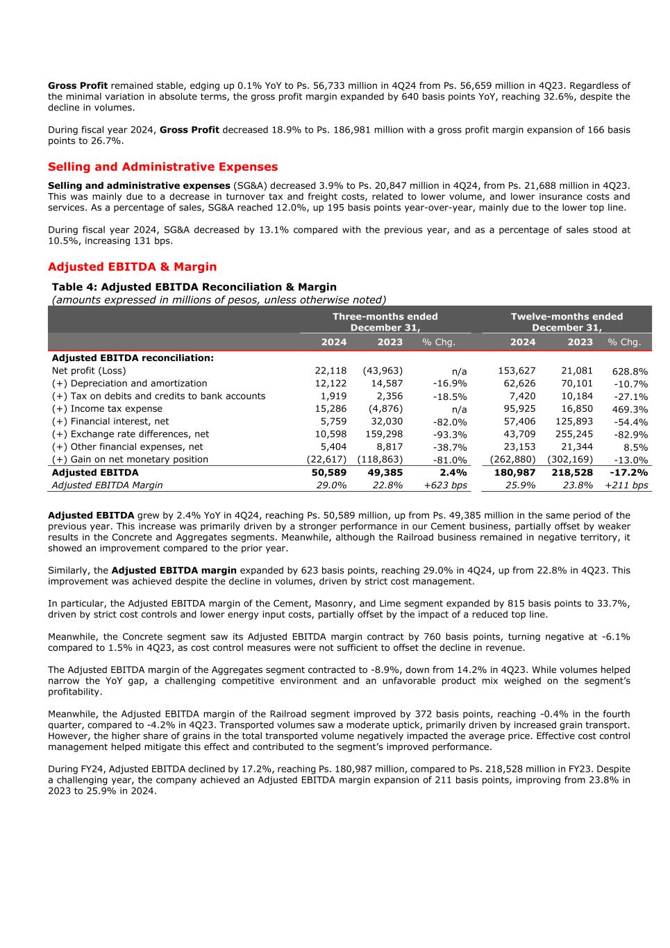 Gross Profit remained stable, edging up 0.1% YoY to Ps. 56,733 million in 4Q24 from Ps. 56,659 million in 4Q23. Regardless of the minimal variation in absolute terms, the gross profit margin expanded by 640 basis points YoY, reaching 32.6%, despite the decline in volumes. During fiscal year 2024, Gross Profit decreased 18.9% to Ps. 186,981 million with a gross profit margin expansion of 166 basis points to 26.7%. Selling and Administrative Expenses Selling and administrative expenses (SG&A) decreased 3.9% to Ps. 20,847 million in 4Q24, from Ps. 21,688 million in 4Q23. This was mainly due to a decrease in turnover tax and freight costs, related to lower volume, and lower insurance costs and services. As a percentage of sales, SG&A reached 12.0%, up 195 basis points year-over-year, mainly due to the lower top line. During fiscal year 2024, SG&A decreased by 13.1% compared with the previous year, and as a percentage of sales stood at 10.5%, increasing 131 bps. Adjusted EBITDA & Margin Table 4: Adjusted EBITDA Reconciliation & Margin (amounts expressed in millions of pesos, unless otherwise noted) Three-months ended December 31, Twelve-months ended December 31, 2024 2023 % Chg. 2024 2023 % Chg. Adjusted EBITDA reconciliation: Net profit (Loss) 22,118 (43,963) n/a 153,627 21,081 628.8% (+) Depreciation and amortization 12,122 14,587 -16.9% 62,626 70,101 -10.7% (+) Tax on debits and credits to bank accounts 1,919 2,356 -18.5% 7,420 10,184 -27.1% (+) Income tax expense 15,286 (4,876) n/a 95,925 16,850 469.3% (+) Financial interest, net 5,759 32,030 -82.0% 57,406 125,893 -54.4% (+) Exchange rate differences, net 10,598 159,298 -93.3% 43,709 255,245 -82.9% (+) Other financial expenses, net 5,404 8,817 -38.7% 23,153 21,344 8.5% (+) Gain on net monetary position (22,617) (118,863) -81.0% (262,880) (302,169) -13.0% Adjusted EBITDA 50,589 49,385 2.4% 180,987 218,528 -17.2% Adjusted EBITDA Margin 29.0% 22.8% +623 bps 25.9% 23.8% +211 bps Adjusted EBITDA grew by 2.4% YoY in 4Q24, reaching Ps. 50,589 million, up from Ps. 49,385 million in the same period of the previous year. This increase was primarily driven by a stronger performance in our Cement business, partially offset by weaker results in the Concrete and Aggregates segments. Meanwhile, although the Railroad business remained in negative territory, it showed an improvement compared to the prior year. Similarly, the Adjusted EBITDA margin expanded by 623 basis points, reaching 29.0% in 4Q24, up from 22.8% in 4Q23. This improvement was achieved despite the decline in volumes, driven by strict cost management. In particular, the Adjusted EBITDA margin of the Cement, Masonry, and Lime segment expanded by 815 basis points to 33.7%, driven by strict cost controls and lower energy input costs, partially offset by the impact of a reduced top line. Meanwhile, the Concrete segment saw its Adjusted EBITDA margin contract by 760 basis points, turning negative at -6.1% compared to 1.5% in 4Q23, as cost control measures were not sufficient to offset the decline in revenue. The Adjusted EBITDA margin of the Aggregates segment contracted to -8.9%, down from 14.2% in 4Q23. While volumes helped narrow the YoY gap, a challenging competitive environment and an unfavorable product mix weighed on the segment’s profitability. Meanwhile, the Adjusted EBITDA margin of the Railroad segment improved by 372 basis points, reaching -0.4% in the fourth quarter, compared to -4.2% in 4Q23. Transported volumes saw a moderate uptick, primarily driven by increased grain transport. However, the higher share of grains in the total transported volume negatively impacted the average price. Effective cost control management helped mitigate this effect and contributed to the segment’s improved performance. During FY24, Adjusted EBITDA declined by 17.2%, reaching Ps. 180,987 million, compared to Ps. 218,528 million in FY23. Despite a challenging year, the company achieved an Adjusted EBITDA margin expansion of 211 basis points, improving from 23.8% in 2023 to 25.9% in 2024.