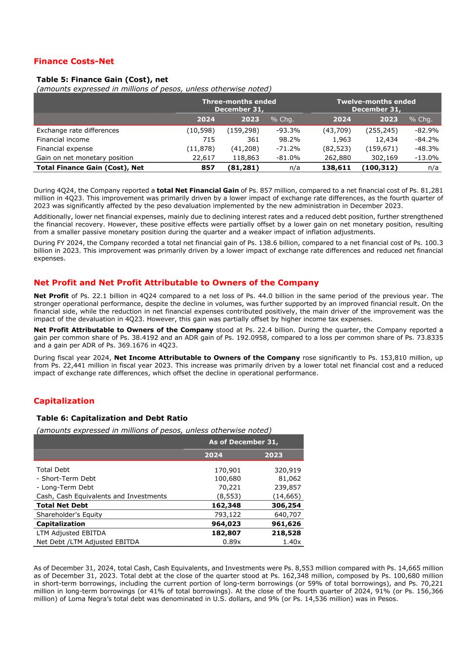 Finance Costs-Net Table 5: Finance Gain (Cost), net (amounts expressed in millions of pesos, unless otherwise noted) Three-months ended December 31, Twelve-months ended December 31, 2024 2023 % Chg. 2024 2023 % Chg. Exchange rate differences (10,598) (159,298) -93.3% (43,709) (255,245) -82.9% Financial income 715 361 98.2% 1,963 12,434 -84.2% Financial expense (11,878) (41,208) -71.2% (82,523) (159,671) -48.3% Gain on net monetary position 22,617 118,863 -81.0% 262,880 302,169 -13.0% Total Finance Gain (Cost), Net 857 (81,281) n/a 138,611 (100,312) n/a During 4Q24, the Company reported a total Net Financial Gain of Ps. 857 million, compared to a net financial cost of Ps. 81,281 million in 4Q23. This improvement was primarily driven by a lower impact of exchange rate differences, as the fourth quarter of 2023 was significantly affected by the peso devaluation implemented by the new administration in December 2023. Additionally, lower net financial expenses, mainly due to declining interest rates and a reduced debt position, further strengthened the financial recovery. However, these positive effects were partially offset by a lower gain on net monetary position, resulting from a smaller passive monetary position during the quarter and a weaker impact of inflation adjustments. During FY 2024, the Company recorded a total net financial gain of Ps. 138.6 billion, compared to a net financial cost of Ps. 100.3 billion in 2023. This improvement was primarily driven by a lower impact of exchange rate differences and reduced net financial expenses. Net Profit and Net Profit Attributable to Owners of the Company Net Profit of Ps. 22.1 billion in 4Q24 compared to a net loss of Ps. 44.0 billion in the same period of the previous year. The stronger operational performance, despite the decline in volumes, was further supported by an improved financial result. On the financial side, while the reduction in net financial expenses contributed positively, the main driver of the improvement was the impact of the devaluation in 4Q23. However, this gain was partially offset by higher income tax expenses. Net Profit Attributable to Owners of the Company stood at Ps. 22.4 billion. During the quarter, the Company reported a gain per common share of Ps. 38.4192 and an ADR gain of Ps. 192.0958, compared to a loss per common share of Ps. 73.8335 and a gain per ADR of Ps. 369.1676 in 4Q23. During fiscal year 2024, Net Income Attributable to Owners of the Company rose significantly to Ps. 153,810 million, up from Ps. 22,441 million in fiscal year 2023. This increase was primarily driven by a lower total net financial cost and a reduced impact of exchange rate differences, which offset the decline in operational performance. Capitalization Table 6: Capitalization and Debt Ratio (amounts expressed in millions of pesos, unless otherwise noted) As of December 31, 2024 2023 Total Debt 170,901 320,919 - Short-Term Debt 100,680 81,062 - Long-Term Debt 70,221 239,857 Cash, Cash Equivalents and Investments (8,553) (14,665) Total Net Debt 162,348 306,254 Shareholder's Equity 793,122 640,707 Capitalization 964,023 961,626 LTM Adjusted EBITDA 182,807 218,528 Net Debt /LTM Adjusted EBITDA 0.89x 1.40x As of December 31, 2024, total Cash, Cash Equivalents, and Investments were Ps. 8,553 million compared with Ps. 14,665 million as of December 31, 2023. Total debt at the close of the quarter stood at Ps. 162,348 million, composed by Ps. 100,680 million in short-term borrowings, including the current portion of long-term borrowings (or 59% of total borrowings), and Ps. 70,221 million in long-term borrowings (or 41% of total borrowings). At the close of the fourth quarter of 2024, 91% (or Ps. 156,366 million) of Loma Negra’s total debt was denominated in U.S. dollars, and 9% (or Ps. 14,536 million) was in Pesos.