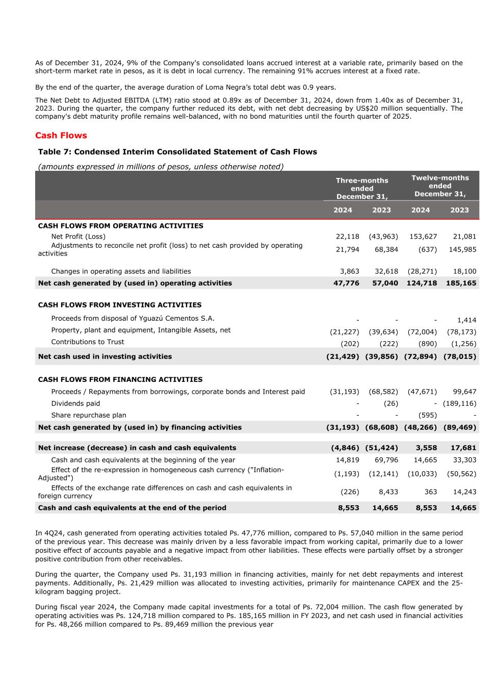As of December 31, 2024, 9% of the Company's consolidated loans accrued interest at a variable rate, primarily based on the short-term market rate in pesos, as it is debt in local currency. The remaining 91% accrues interest at a fixed rate. By the end of the quarter, the average duration of Loma Negra’s total debt was 0.9 years. The Net Debt to Adjusted EBITDA (LTM) ratio stood at 0.89x as of December 31, 2024, down from 1.40x as of December 31, 2023. During the quarter, the company further reduced its debt, with net debt decreasing by US$20 million sequentially. The company's debt maturity profile remains well-balanced, with no bond maturities until the fourth quarter of 2025. Cash Flows Table 7: Condensed Interim Consolidated Statement of Cash Flows (amounts expressed in millions of pesos, unless otherwise noted) Three-months ended December 31, Twelve-months ended December 31, 2024 2023 2024 2023 CASH FLOWS FROM OPERATING ACTIVITIES Net Profit (Loss) 22,118 (43,963) 153,627 21,081 Adjustments to reconcile net profit (loss) to net cash provided by operating activities 21,794 68,384 (637) 145,985 Changes in operating assets and liabilities 3,863 32,618 (28,271) 18,100 Net cash generated by (used in) operating activities 47,776 57,040 124,718 185,165 CASH FLOWS FROM INVESTING ACTIVITIES Proceeds from disposal of Yguazú Cementos S.A. - - - 1,414 Property, plant and equipment, Intangible Assets, net (21,227) (39,634) (72,004) (78,173) Contributions to Trust (202) (222) (890) (1,256) Net cash used in investing activities (21,429) (39,856) (72,894) (78,015) CASH FLOWS FROM FINANCING ACTIVITIES Proceeds / Repayments from borrowings, corporate bonds and Interest paid (31,193) (68,582) (47,671) 99,647 Dividends paid - (26) - (189,116) Share repurchase plan - - (595) - Net cash generated by (used in) by financing activities (31,193) (68,608) (48,266) (89,469) Net increase (decrease) in cash and cash equivalents (4,846) (51,424) 3,558 17,681 Cash and cash equivalents at the beginning of the year 14,819 69,796 14,665 33,303 Effect of the re-expression in homogeneous cash currency ("Inflation- Adjusted") (1,193) (12,141) (10,033) (50,562) Effects of the exchange rate differences on cash and cash equivalents in foreign currency (226) 8,433 363 14,243 Cash and cash equivalents at the end of the period 8,553 14,665 8,553 14,665 In 4Q24, cash generated from operating activities totaled Ps. 47,776 million, compared to Ps. 57,040 million in the same period of the previous year. This decrease was mainly driven by a less favorable impact from working capital, primarily due to a lower positive effect of accounts payable and a negative impact from other liabilities. These effects were partially offset by a stronger positive contribution from other receivables. During the quarter, the Company used Ps. 31,193 million in financing activities, mainly for net debt repayments and interest payments. Additionally, Ps. 21,429 million was allocated to investing activities, primarily for maintenance CAPEX and the 25- kilogram bagging project. During fiscal year 2024, the Company made capital investments for a total of Ps. 72,004 million. The cash flow generated by operating activities was Ps. 124,718 million compared to Ps. 185,165 million in FY 2023, and net cash used in financial activities for Ps. 48,266 million compared to Ps. 89,469 million the previous year