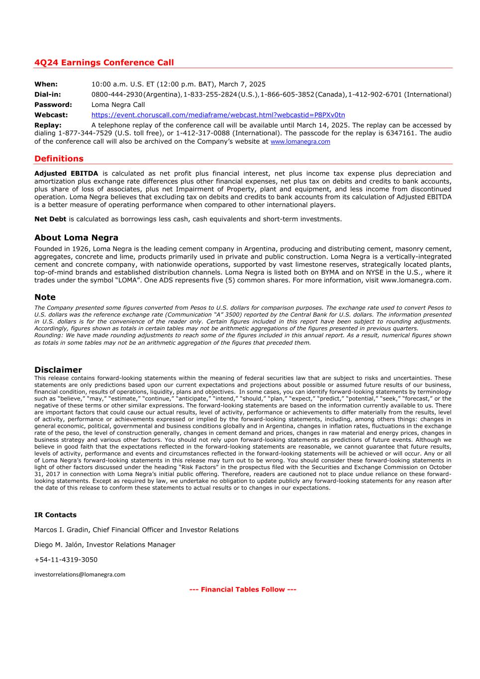 4Q24 Earnings Conference Call When: 10:00 a.m. U.S. ET (12:00 p.m. BAT), March 7, 2025 Dial-in: 0800-444-2930 (Argentina), 1-833-255-2824 (U.S.), 1-866-605-3852 (Canada), 1-412-902-6701 (International) Password: Loma Negra Call Webcast: https://event.choruscall.com/mediaframe/webcast.html?webcastid=P8PXv0tn Replay: A telephone replay of the conference call will be available until March 14, 2025. The replay can be accessed by dialing 1-877-344-7529 (U.S. toll free), or 1-412-317-0088 (International). The passcode for the replay is 6347161. The audio of the conference call will also be archived on the Company’s website at www.lomanegra.com Definitions Adjusted EBITDA is calculated as net profit plus financial interest, net plus income tax expense plus depreciation and amortization plus exchange rate differences plus other financial expenses, net plus tax on debits and credits to bank accounts, plus share of loss of associates, plus net Impairment of Property, plant and equipment, and less income from discontinued operation. Loma Negra believes that excluding tax on debits and credits to bank accounts from its calculation of Adjusted EBITDA is a better measure of operating performance when compared to other international players. Net Debt is calculated as borrowings less cash, cash equivalents and short-term investments. About Loma Negra Founded in 1926, Loma Negra is the leading cement company in Argentina, producing and distributing cement, masonry cement, aggregates, concrete and lime, products primarily used in private and public construction. Loma Negra is a vertically-integrated cement and concrete company, with nationwide operations, supported by vast limestone reserves, strategically located plants, top-of-mind brands and established distribution channels. Loma Negra is listed both on BYMA and on NYSE in the U.S., where it trades under the symbol “LOMA”. One ADS represents five (5) common shares. For more information, visit www.lomanegra.com. Note The Company presented some figures converted from Pesos to U.S. dollars for comparison purposes. The exchange rate used to convert Pesos to U.S. dollars was the reference exchange rate (Communication “A” 3500) reported by the Central Bank for U.S. dollars. The information presented in U.S. dollars is for the convenience of the reader only. Certain figures included in this report have been subject to rounding adjustments. Accordingly, figures shown as totals in certain tables may not be arithmetic aggregations of the figures presented in previous quarters. Rounding: We have made rounding adjustments to reach some of the figures included in this annual report. As a result, numerical figures shown as totals in some tables may not be an arithmetic aggregation of the figures that preceded them. Disclaimer This release contains forward-looking statements within the meaning of federal securities law that are subject to risks and uncertainties. These statements are only predictions based upon our current expectations and projections about possible or assumed future results of our business, financial condition, results of operations, liquidity, plans and objectives. In some cases, you can identify forward-looking statements by terminology such as “believe,” “may,” “estimate,” “continue,” “anticipate,” “intend,” “should,” “plan,” “expect,” “predict,” “potential,” “seek,” “forecast,” or the negative of these terms or other similar expressions. The forward-looking statements are based on the information currently available to us. There are important factors that could cause our actual results, level of activity, performance or achievements to differ materially from the results, level of activity, performance or achievements expressed or implied by the forward-looking statements, including, among others things: changes in general economic, political, governmental and business conditions globally and in Argentina, changes in inflation rates, fluctuations in the exchange rate of the peso, the level of construction generally, changes in cement demand and prices, changes in raw material and energy prices, changes in business strategy and various other factors. You should not rely upon forward-looking statements as predictions of future events. Although we believe in good faith that the expectations reflected in the forward-looking statements are reasonable, we cannot guarantee that future results, levels of activity, performance and events and circumstances reflected in the forward-looking statements will be achieved or will occur. Any or all of Loma Negra’s forward-looking statements in this release may turn out to be wrong. You should consider these forward-looking statements in light of other factors discussed under the heading “Risk Factors” in the prospectus filed with the Securities and Exchange Commission on October 31, 2017 in connection with Loma Negra’s initial public offering. Therefore, readers are cautioned not to place undue reliance on these forward- looking statements. Except as required by law, we undertake no obligation to update publicly any forward-looking statements for any reason after the date of this release to conform these statements to actual results or to changes in our expectations. IR Contacts Marcos I. Gradin, Chief Financial Officer and Investor Relations Diego M. Jalón, Investor Relations Manager +54-11-4319-3050 investorrelations@lomanegra.com --- Financial Tables Follow ---