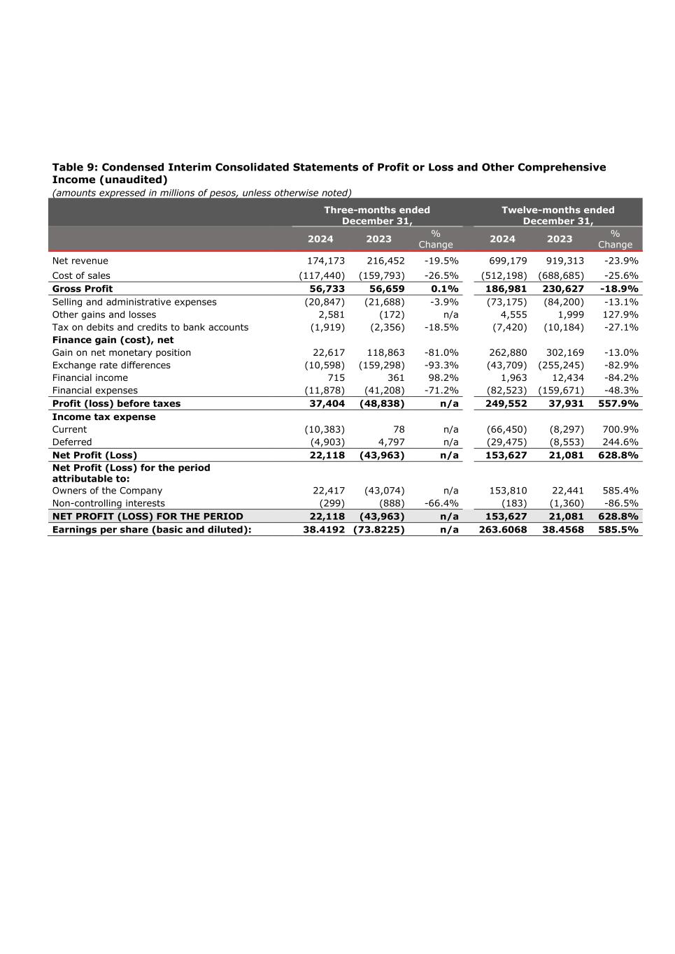 Table 9: Condensed Interim Consolidated Statements of Profit or Loss and Other Comprehensive Income (unaudited) (amounts expressed in millions of pesos, unless otherwise noted) Three-months ended December 31, Twelve-months ended December 31, 2024 2023 % Change 2024 2023 % Change Net revenue 174,173 216,452 -19.5% 699,179 919,313 -23.9% Cost of sales (117,440) (159,793) -26.5% (512,198) (688,685) -25.6% Gross Profit 56,733 56,659 0.1% 186,981 230,627 -18.9% Selling and administrative expenses (20,847) (21,688) -3.9% (73,175) (84,200) -13.1% Other gains and losses 2,581 (172) n/a 4,555 1,999 127.9% Tax on debits and credits to bank accounts (1,919) (2,356) -18.5% (7,420) (10,184) -27.1% Finance gain (cost), net Gain on net monetary position 22,617 118,863 -81.0% 262,880 302,169 -13.0% Exchange rate differences (10,598) (159,298) -93.3% (43,709) (255,245) -82.9% Financial income 715 361 98.2% 1,963 12,434 -84.2% Financial expenses (11,878) (41,208) -71.2% (82,523) (159,671) -48.3% Profit (loss) before taxes 37,404 (48,838) n/a 249,552 37,931 557.9% Income tax expense Current (10,383) 78 n/a (66,450) (8,297) 700.9% Deferred (4,903) 4,797 n/a (29,475) (8,553) 244.6% Net Profit (Loss) 22,118 (43,963) n/a 153,627 21,081 628.8% Net Profit (Loss) for the period attributable to: Owners of the Company 22,417 (43,074) n/a 153,810 22,441 585.4% Non-controlling interests (299) (888) -66.4% (183) (1,360) -86.5% NET PROFIT (LOSS) FOR THE PERIOD 22,118 (43,963) n/a 153,627 21,081 628.8% Earnings per share (basic and diluted): 38.4192 (73.8225) n/a 263.6068 38.4568 585.5%