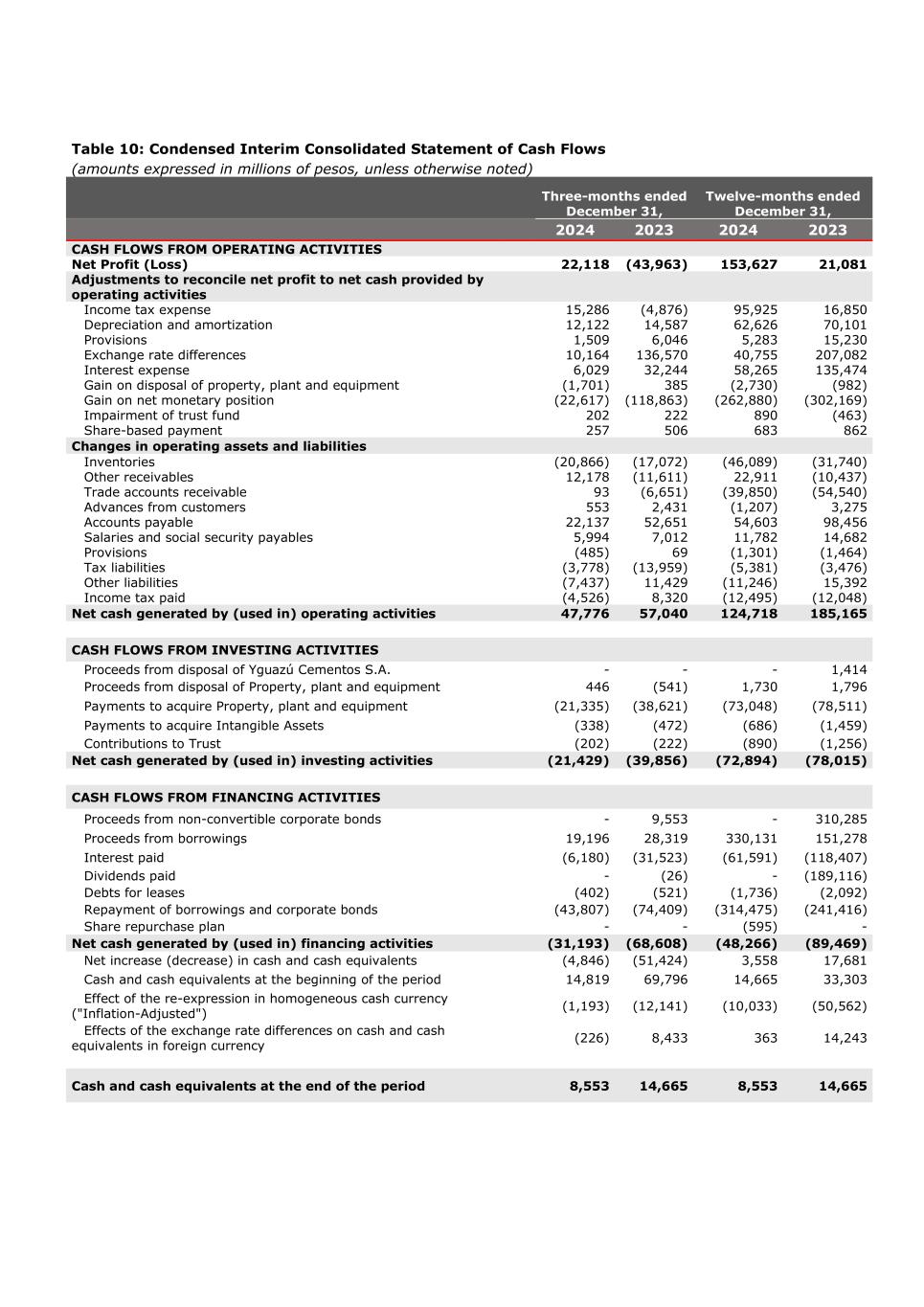 Table 10: Condensed Interim Consolidated Statement of Cash Flows (amounts expressed in millions of pesos, unless otherwise noted) Three-months ended December 31, Twelve-months ended December 31, 2024 2023 2024 2023 CASH FLOWS FROM OPERATING ACTIVITIES Net Profit (Loss) 22,118 (43,963) 153,627 21,081 Adjustments to reconcile net profit to net cash provided by operating activities Income tax expense 15,286 (4,876) 95,925 16,850 Depreciation and amortization 12,122 14,587 62,626 70,101 Provisions 1,509 6,046 5,283 15,230 Exchange rate differences 10,164 136,570 40,755 207,082 Interest expense 6,029 32,244 58,265 135,474 Gain on disposal of property, plant and equipment (1,701) 385 (2,730) (982) Gain on net monetary position (22,617) (118,863) (262,880) (302,169) Impairment of trust fund 202 222 890 (463) Share-based payment 257 506 683 862 Changes in operating assets and liabilities Inventories (20,866) (17,072) (46,089) (31,740) Other receivables 12,178 (11,611) 22,911 (10,437) Trade accounts receivable 93 (6,651) (39,850) (54,540) Advances from customers 553 2,431 (1,207) 3,275 Accounts payable 22,137 52,651 54,603 98,456 Salaries and social security payables 5,994 7,012 11,782 14,682 Provisions (485) 69 (1,301) (1,464) Tax liabilities (3,778) (13,959) (5,381) (3,476) Other liabilities (7,437) 11,429 (11,246) 15,392 Income tax paid (4,526) 8,320 (12,495) (12,048) Net cash generated by (used in) operating activities 47,776 57,040 124,718 185,165 CASH FLOWS FROM INVESTING ACTIVITIES Proceeds from disposal of Yguazú Cementos S.A. - - - 1,414 Proceeds from disposal of Property, plant and equipment 446 (541) 1,730 1,796 Payments to acquire Property, plant and equipment (21,335) (38,621) (73,048) (78,511) Payments to acquire Intangible Assets (338) (472) (686) (1,459) Contributions to Trust (202) (222) (890) (1,256) Net cash generated by (used in) investing activities (21,429) (39,856) (72,894) (78,015) CASH FLOWS FROM FINANCING ACTIVITIES Proceeds from non-convertible corporate bonds - 9,553 - 310,285 Proceeds from borrowings 19,196 28,319 330,131 151,278 Interest paid (6,180) (31,523) (61,591) (118,407) Dividends paid - (26) - (189,116) Debts for leases (402) (521) (1,736) (2,092) Repayment of borrowings and corporate bonds (43,807) (74,409) (314,475) (241,416) Share repurchase plan - - (595) - Net cash generated by (used in) financing activities (31,193) (68,608) (48,266) (89,469) Net increase (decrease) in cash and cash equivalents (4,846) (51,424) 3,558 17,681 Cash and cash equivalents at the beginning of the period 14,819 69,796 14,665 33,303 Effect of the re-expression in homogeneous cash currency ("Inflation-Adjusted") (1,193) (12,141) (10,033) (50,562) Effects of the exchange rate differences on cash and cash equivalents in foreign currency (226) 8,433 363 14,243 Cash and cash equivalents at the end of the period 8,553 14,665 8,553 14,665