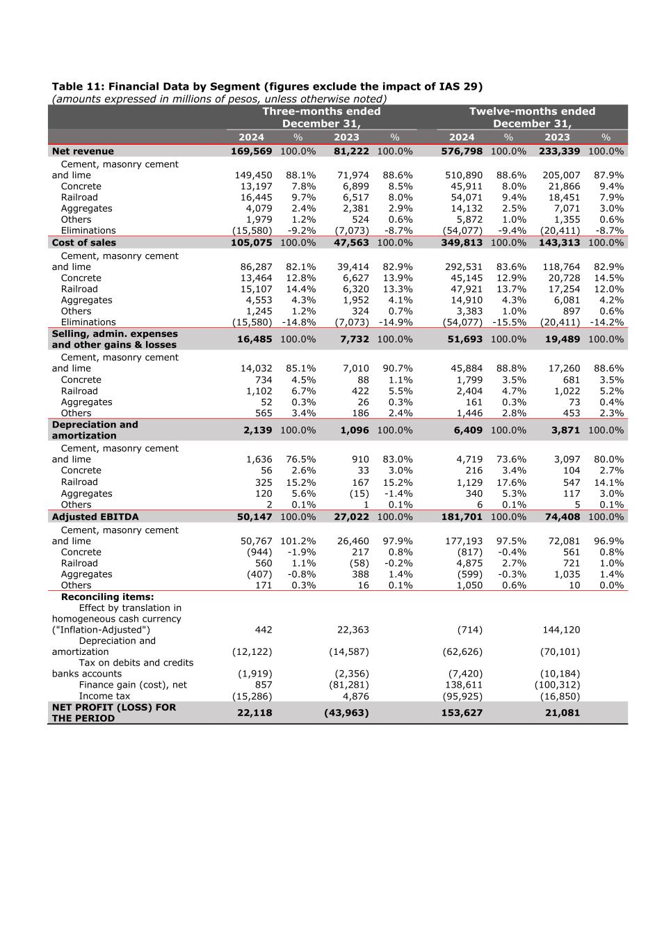 Table 11: Financial Data by Segment (figures exclude the impact of IAS 29) (amounts expressed in millions of pesos, unless otherwise noted) Three-months ended December 31, Twelve-months ended December 31, 2024 % 2023 % 2024 % 2023 % Net revenue 169,569 100.0% 81,222 100.0% 576,798 100.0% 233,339 100.0% Cement, masonry cement and lime 149,450 88.1% 71,974 88.6% 510,890 88.6% 205,007 87.9% Concrete 13,197 7.8% 6,899 8.5% 45,911 8.0% 21,866 9.4% Railroad 16,445 9.7% 6,517 8.0% 54,071 9.4% 18,451 7.9% Aggregates 4,079 2.4% 2,381 2.9% 14,132 2.5% 7,071 3.0% Others 1,979 1.2% 524 0.6% 5,872 1.0% 1,355 0.6% Eliminations (15,580) -9.2% (7,073) -8.7% (54,077) -9.4% (20,411) -8.7% Cost of sales 105,075 100.0% 47,563 100.0% 349,813 100.0% 143,313 100.0% Cement, masonry cement and lime 86,287 82.1% 39,414 82.9% 292,531 83.6% 118,764 82.9% Concrete 13,464 12.8% 6,627 13.9% 45,145 12.9% 20,728 14.5% Railroad 15,107 14.4% 6,320 13.3% 47,921 13.7% 17,254 12.0% Aggregates 4,553 4.3% 1,952 4.1% 14,910 4.3% 6,081 4.2% Others 1,245 1.2% 324 0.7% 3,383 1.0% 897 0.6% Eliminations (15,580) -14.8% (7,073) -14.9% (54,077) -15.5% (20,411) -14.2% Selling, admin. expenses and other gains & losses 16,485 100.0% 7,732 100.0% 51,693 100.0% 19,489 100.0% Cement, masonry cement and lime 14,032 85.1% 7,010 90.7% 45,884 88.8% 17,260 88.6% Concrete 734 4.5% 88 1.1% 1,799 3.5% 681 3.5% Railroad 1,102 6.7% 422 5.5% 2,404 4.7% 1,022 5.2% Aggregates 52 0.3% 26 0.3% 161 0.3% 73 0.4% Others 565 3.4% 186 2.4% 1,446 2.8% 453 2.3% Depreciation and amortization 2,139 100.0% 1,096 100.0% 6,409 100.0% 3,871 100.0% Cement, masonry cement and lime 1,636 76.5% 910 83.0% 4,719 73.6% 3,097 80.0% Concrete 56 2.6% 33 3.0% 216 3.4% 104 2.7% Railroad 325 15.2% 167 15.2% 1,129 17.6% 547 14.1% Aggregates 120 5.6% (15) -1.4% 340 5.3% 117 3.0% Others 2 0.1% 1 0.1% 6 0.1% 5 0.1% Adjusted EBITDA 50,147 100.0% 27,022 100.0% 181,701 100.0% 74,408 100.0% Cement, masonry cement and lime 50,767 101.2% 26,460 97.9% 177,193 97.5% 72,081 96.9% Concrete (944) -1.9% 217 0.8% (817) -0.4% 561 0.8% Railroad 560 1.1% (58) -0.2% 4,875 2.7% 721 1.0% Aggregates (407) -0.8% 388 1.4% (599) -0.3% 1,035 1.4% Others 171 0.3% 16 0.1% 1,050 0.6% 10 0.0% Reconciling items: Effect by translation in homogeneous cash currency ("Inflation-Adjusted") 442 22,363 (714) 144,120 Depreciation and amortization (12,122) (14,587) (62,626) (70,101) Tax on debits and credits banks accounts (1,919) (2,356) (7,420) (10,184) Finance gain (cost), net 857 (81,281) 138,611 (100,312) Income tax (15,286) 4,876 (95,925) (16,850) NET PROFIT (LOSS) FOR THE PERIOD 22,118 (43,963) 153,627 21,081