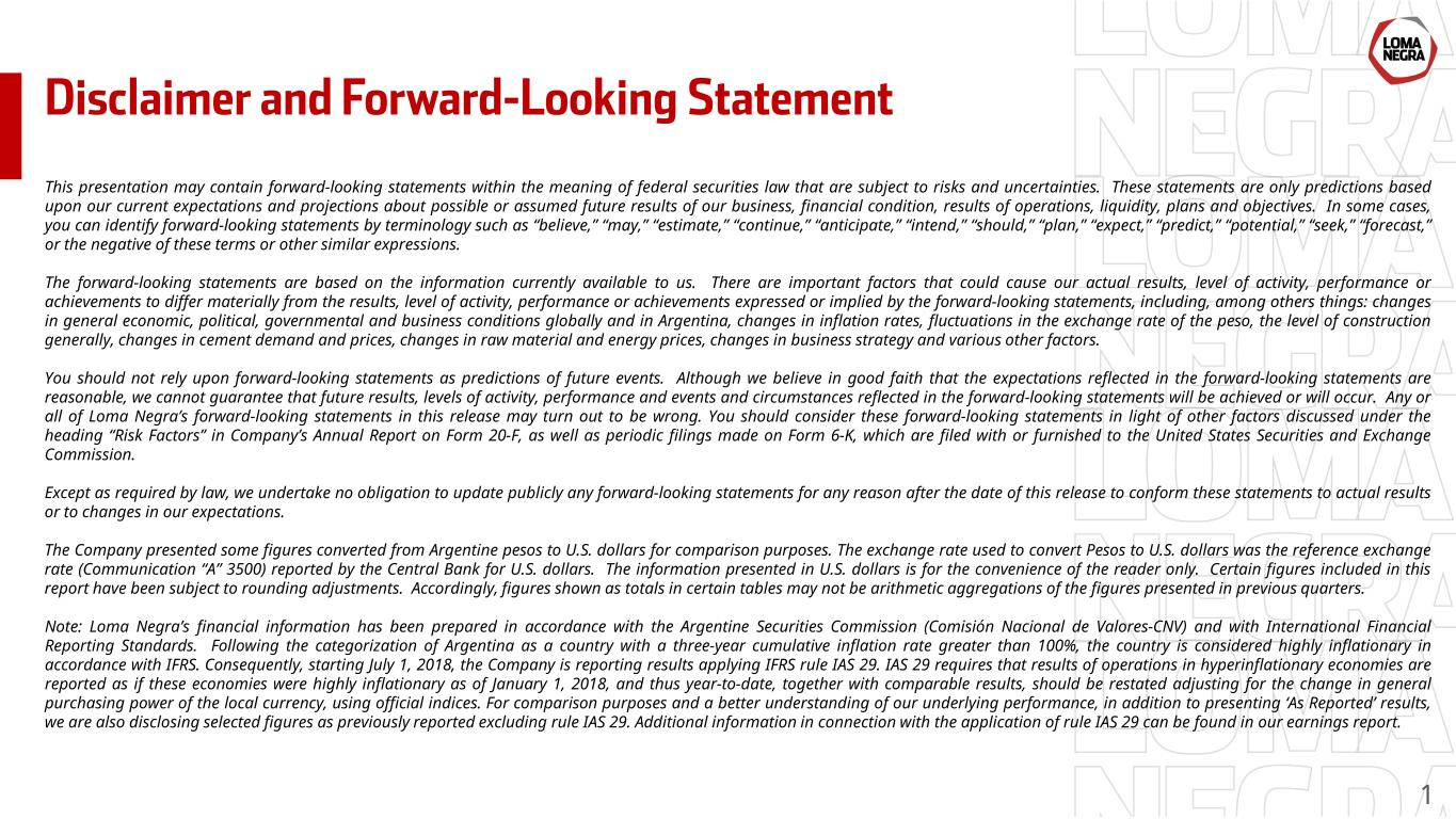 Disclaimer and Forward-Looking Statement This presentation may contain forward-looking statements within the meaning of federal securities law that are subject to risks and uncertainties. These statements are only predictions based upon our current expectations and projections about possible or assumed future results of our business, financial condition, results of operations, liquidity, plans and objectives. In some cases, you can identify forward-looking statements by terminology such as “believe,” “may,” “estimate,” “continue,” “anticipate,” “intend,” “should,” “plan,” “expect,” “predict,” “potential,” “seek,” “forecast,” or the negative of these terms or other similar expressions. The forward-looking statements are based on the information currently available to us. There are important factors that could cause our actual results, level of activity, performance or achievements to differ materially from the results, level of activity, performance or achievements expressed or implied by the forward-looking statements, including, among others things: changes in general economic, political, governmental and business conditions globally and in Argentina, changes in inflation rates, fluctuations in the exchange rate of the peso, the level of construction generally, changes in cement demand and prices, changes in raw material and energy prices, changes in business strategy and various other factors. You should not rely upon forward-looking statements as predictions of future events. Although we believe in good faith that the expectations reflected in the forward-looking statements are reasonable, we cannot guarantee that future results, levels of activity, performance and events and circumstances reflected in the forward-looking statements will be achieved or will occur. Any or all of Loma Negra’s forward-looking statements in this release may turn out to be wrong. You should consider these forward-looking statements in light of other factors discussed under the heading “Risk Factors” in Company’s Annual Report on Form 20-F, as well as periodic filings made on Form 6-K, which are filed with or furnished to the United States Securities and Exchange Commission. Except as required by law, we undertake no obligation to update publicly any forward-looking statements for any reason after the date of this release to conform these statements to actual results or to changes in our expectations. The Company presented some figures converted from Argentine pesos to U.S. dollars for comparison purposes. The exchange rate used to convert Pesos to U.S. dollars was the reference exchange rate (Communication “A” 3500) reported by the Central Bank for U.S. dollars. The information presented in U.S. dollars is for the convenience of the reader only. Certain figures included in this report have been subject to rounding adjustments. Accordingly, figures shown as totals in certain tables may not be arithmetic aggregations of the figures presented in previous quarters. Note: Loma Negra’s financial information has been prepared in accordance with the Argentine Securities Commission (Comisión Nacional de Valores-CNV) and with International Financial Reporting Standards. Following the categorization of Argentina as a country with a three-year cumulative inflation rate greater than 100%, the country is considered highly inflationary in accordance with IFRS. Consequently, starting July 1, 2018, the Company is reporting results applying IFRS rule IAS 29. IAS 29 requires that results of operations in hyperinflationary economies are reported as if these economies were highly inflationary as of January 1, 2018, and thus year-to-date, together with comparable results, should be restated adjusting for the change in general purchasing power of the local currency, using official indices. For comparison purposes and a better understanding of our underlying performance, in addition to presenting ‘As Reported’ results, we are also disclosing selected figures as previously reported excluding rule IAS 29. Additional information in connection with the application of rule IAS 29 can be found in our earnings report. 1