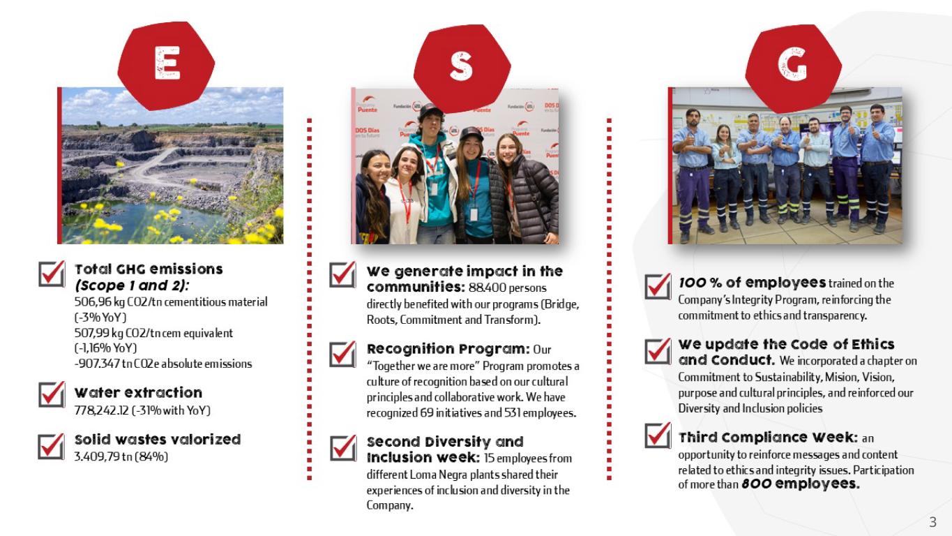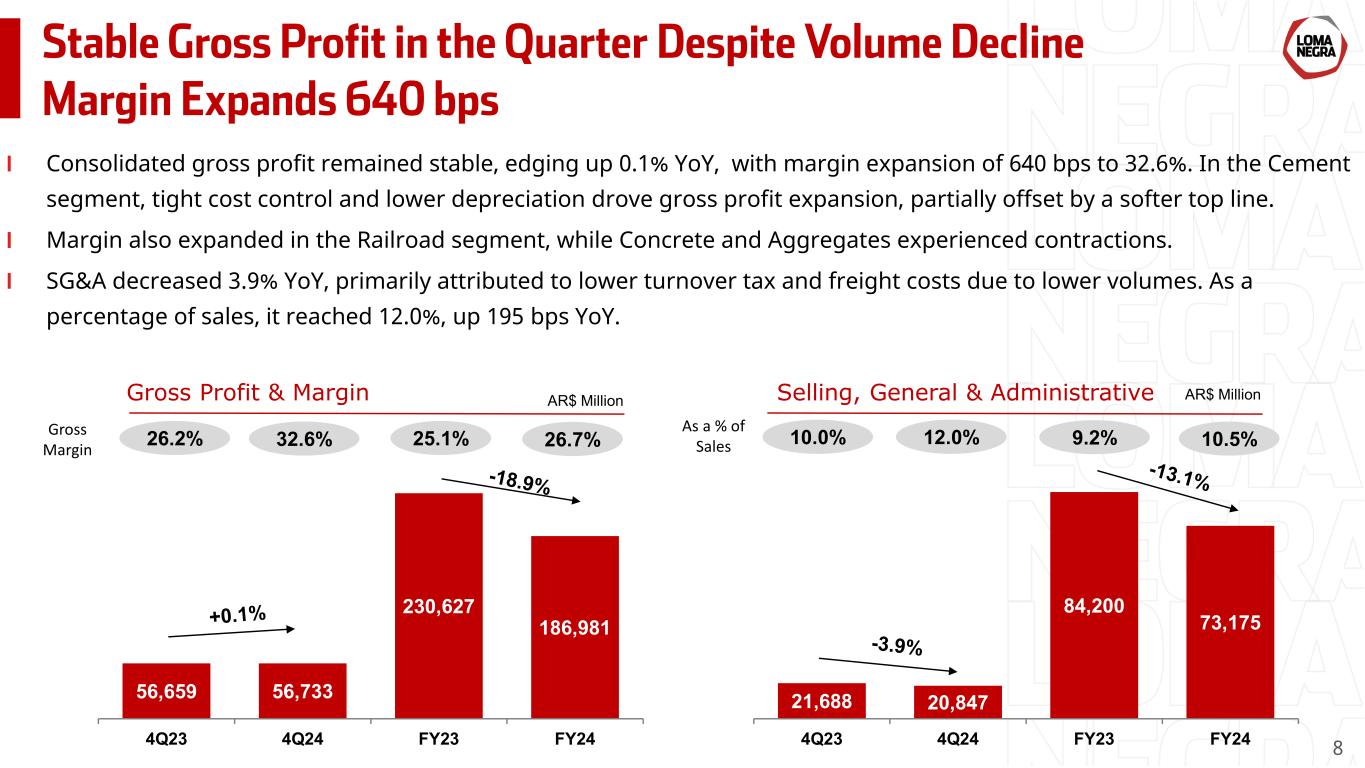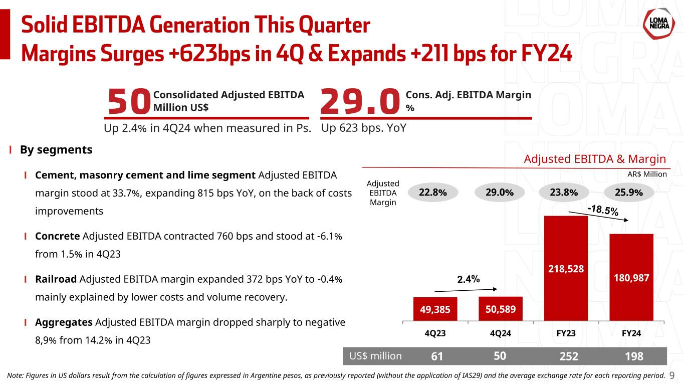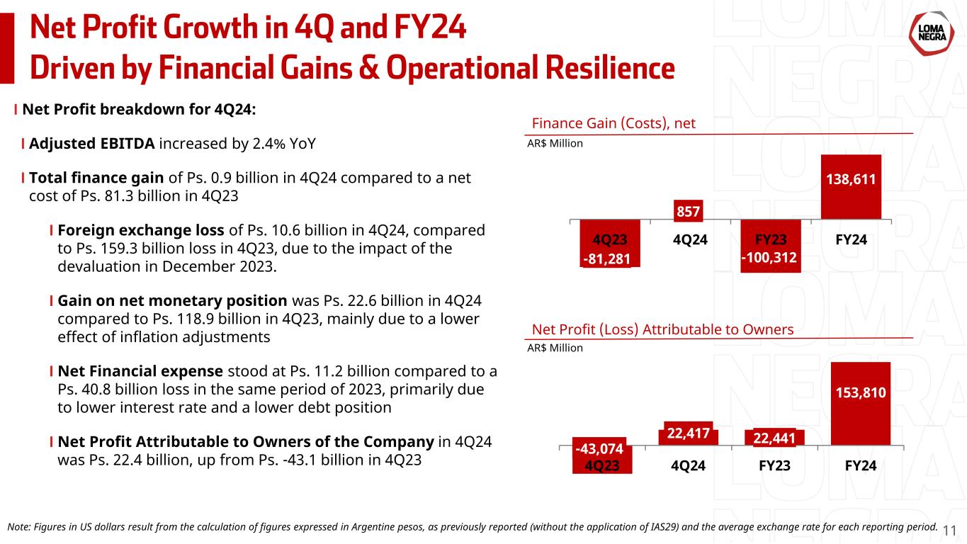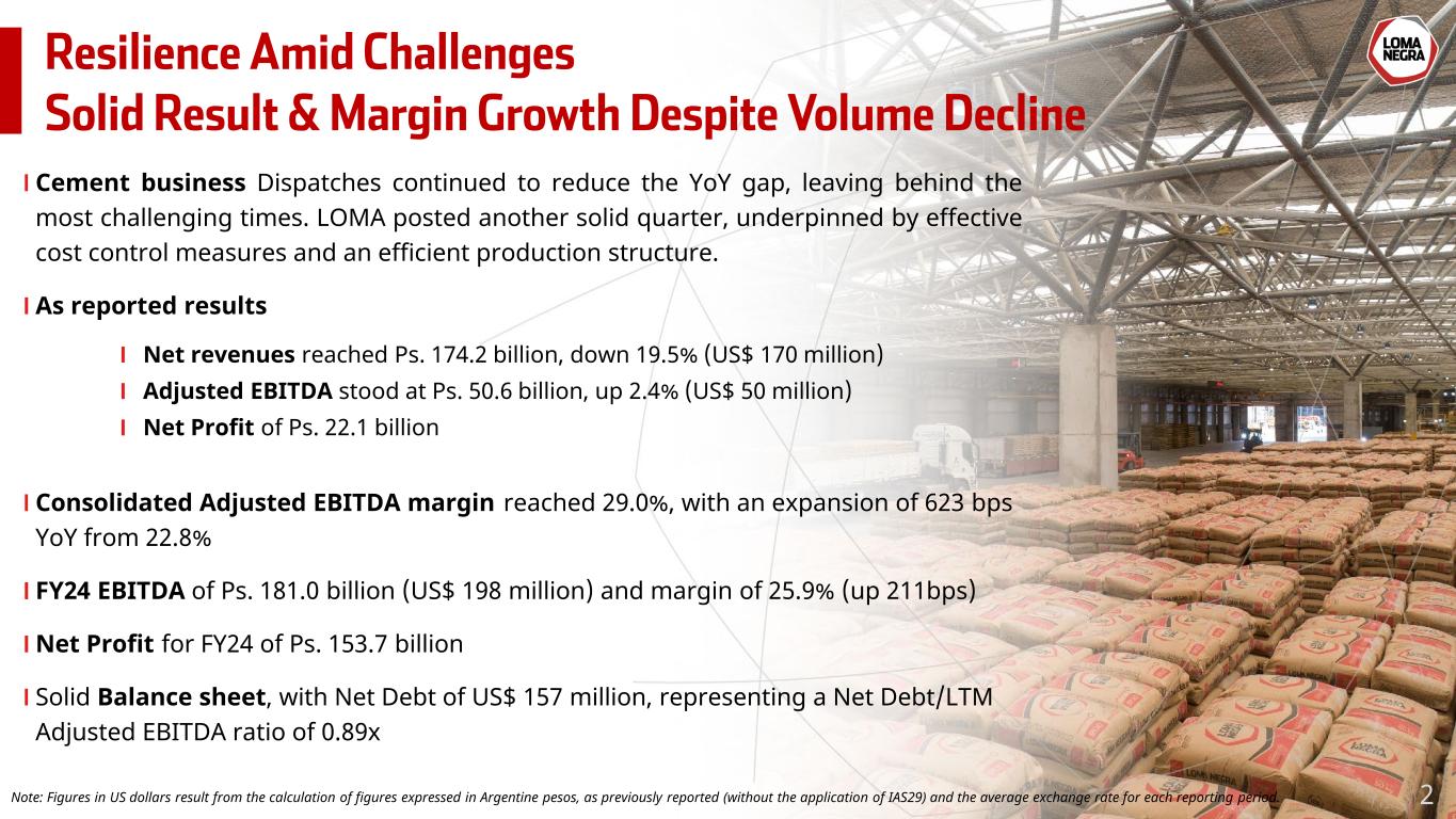 Resilience Amid Challenges Solid Result & Margin Growth Despite Volume Decline Cement business Dispatches continued to reduce the YoY gap, leaving behind the most challenging times. LOMA posted another solid quarter, underpinned by effective cost control measures and an efficient production structure. As reported results Net revenues reached Ps. 174.2 billion, down 19.5% (US$ 170 million) Adjusted EBITDA stood at Ps. 50.6 billion, up 2.4% (US$ 50 million) Net Profit of Ps. 22.1 billion Consolidated Adjusted EBITDA margin reached 29.0%, with an expansion of 623 bps YoY from 22.8% FY24 EBITDA of Ps. 181.0 billion (US$ 198 million) and margin of 25.9% (up 211bps) Net Profit for FY24 of Ps. 153.7 billion Solid Balance sheet, with Net Debt of US$ 157 million, representing a Net Debt/LTM Adjusted EBITDA ratio of 0.89x Note: Figures in US dollars result from the calculation of figures expressed in Argentine pesos, as previously reported (without the application of IAS29) and the average exchange rate for each reporting period. 2
