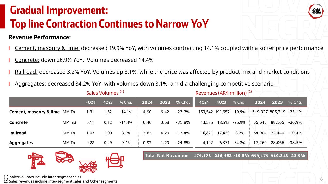 Industry Challenges in 2024 & Signs of Recovery January sets first YoY growth since march 2023 -9.9 10.4 5.0 -1.6 -2.8 4.6 3.7 -5.2 -1.7 -2.1 1.6 20 20 20 21 20 22 20 23 20 24 e 20 25 e 20 26 e 1Q 24 2Q 24 3Q 24 4Q 24 e GDP Growth1 (YoY Growth, %) Ap r Fe b Ja n M ar M ay N ovJu n Au g D ec Se p O ct 202520222021 2024 Monthly Industry Cement Sales3 (‘000 tons) 2023 -22 -25 -42 -37 -33 -35 -20 -27 -25 -25 -24 -10 -20 -23 -43 -36 -27 -33 -14 -26 -18 -20 -15 -6 Ja n’ 24 Fe b’ 24 M ar ’2 4 Ap r’ 24 M ay ’2 4 Ju n’ 24 Ju l’2 4 Ag o’ 24 Se p’ 24 O ct ’2 4 N ov ’2 4 D ic ’2 4 Ja n’ 25 9ISAC Cement Industry Ju l Industry Cement Sales by Type3 (%) Construction Activity2 & Monthly Industry Cement Sales3 (YoY Growth, %) (1) Source INDEC and BCRA (Argentina Central Bank) Market Expectations (REM) (2) Source INDEC: Construction activity indicator, ISAC (Indicador Sintético de la Actividad) . (3) Based on AFCP which reports standalone cement sales, while Loma Negra reports Cement, Masonry and lime sales (4) Jan’ 25 : As of the date of this presentation, ISAC figures were not released 60% 40% Bag Bulk 5 4 -31% 1H YoY -17% 2H YoY -14% 4Q YoY -5% Dic YoY January ‘05 +8.7% YoY 2024 vs 2023