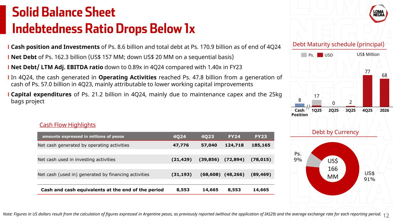 Net Profit breakdown for 4Q24: Adjusted EBITDA increased by 2.4% YoY Total finance gain of Ps. 0.9 billion in 4Q24 compared to a net cost of Ps. 81.3 billion in 4Q23 Foreign exchange loss of Ps. 10.6 billion in 4Q24, compared to Ps. 159.3 billion loss in 4Q23, due to the impact of the devaluation in December 2023. Gain on net monetary position was Ps. 22.6 billion in 4Q24 compared to Ps. 118.9 billion in 4Q23, mainly due to a lower effect of inflation adjustments Net Financial expense stood at Ps. 11.2 billion compared to a Ps. 40.8 billion loss in the same period of 2023, primarily due to lower interest rate and a lower debt position Net Profit Attributable to Owners of the Company in 4Q24 was Ps. 22.4 billion, up from Ps. -43.1 billion in 4Q23 -43,074 22,417 22,441 153,810 4Q23 4Q24 FY23 FY24 Net Profit (Loss) Attributable to Owners AR$ Million -81,281 857 -100,312 138,611 4Q23 4Q24 FY23 FY24 Finance Gain (Costs), net AR$ Million Note: Figures in US dollars result from the calculation of figures expressed in Argentine pesos, as previously reported (without the application of IAS29) and the average exchange rate for each reporting period. 11 Net Profit Growth in 4Q and FY24 Driven by Financial Gains & Operational Resilience