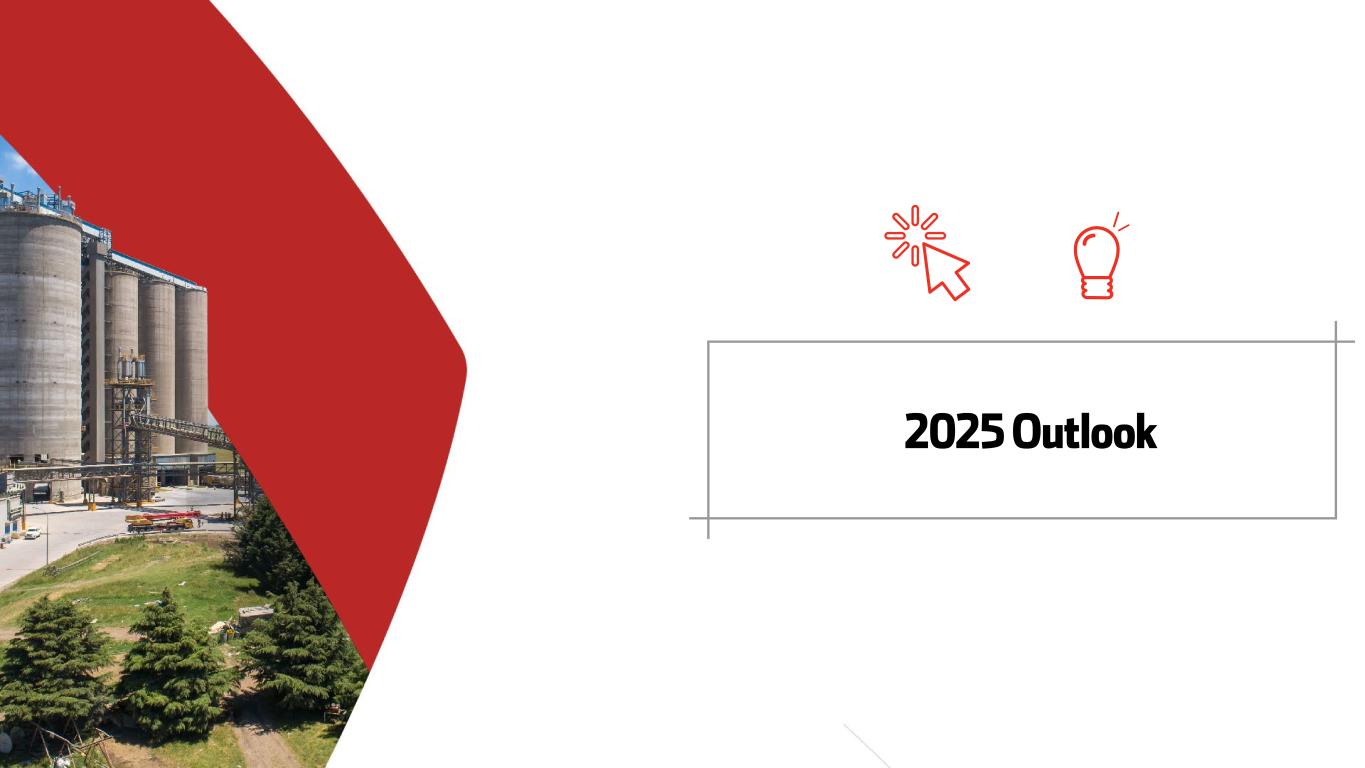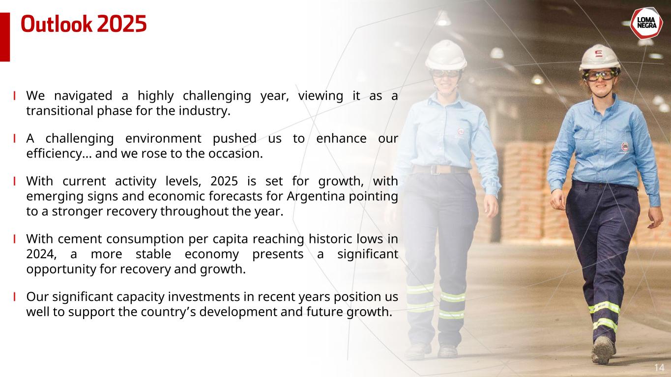 Outlook 2025 We navigated a highly challenging year, viewing it as a transitional phase for the industry. A challenging environment pushed us to enhance our efficiency… and we rose to the occasion. With current activity levels, 2025 is set for growth, with emerging signs and economic forecasts for Argentina pointing to a stronger recovery throughout the year. With cement consumption per capita reaching historic lows in 2024, a more stable economy presents a significant opportunity for recovery and growth. Our significant capacity investments in recent years position us well to support the country’s development and future growth. 14