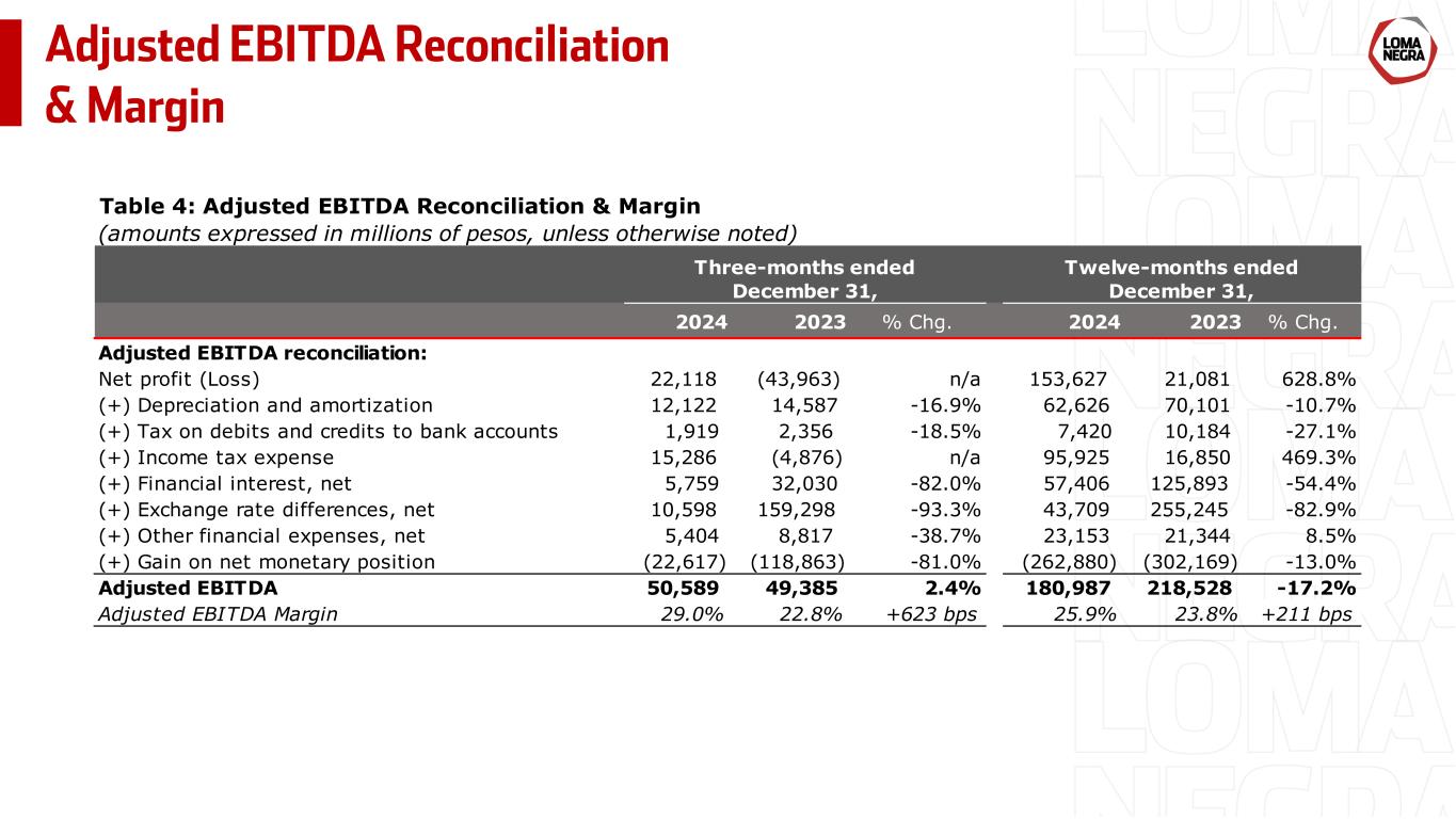 Adjusted EBITDA Reconciliation & Margin Table 4: Adjusted EBITDA Reconciliation & Margin (amounts expressed in millions of pesos, unless otherwise noted) 2024 2023 % Chg. 2024 2023 % Chg. Adjusted EBITDA reconciliation: Net profit (Loss) 22,118 (43,963) n/a 153,627 21,081 628.8% (+) Depreciation and amortization 12,122 14,587 -16.9% 62,626 70,101 -10.7% (+) Tax on debits and credits to bank accounts 1,919 2,356 -18.5% 7,420 10,184 -27.1% (+) Income tax expense 15,286 (4,876) n/a 95,925 16,850 469.3% (+) Financial interest, net 5,759 32,030 -82.0% 57,406 125,893 -54.4% (+) Exchange rate differences, net 10,598 159,298 -93.3% 43,709 255,245 -82.9% (+) Other financial expenses, net 5,404 8,817 -38.7% 23,153 21,344 8.5% (+) Gain on net monetary position (22,617) (118,863) -81.0% (262,880) (302,169) -13.0% Adjusted EBITDA 50,589 49,385 2.4% 180,987 218,528 -17.2% Adjusted EBITDA Margin 29.0% 22.8% +623 bps 25.9% 23.8% +211 bps Three-months ended December 31, Twelve-months ended December 31,