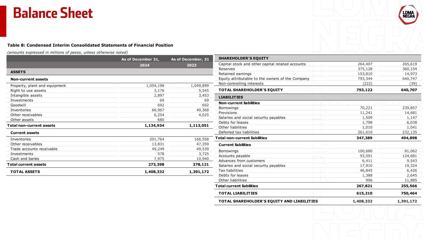 Balance Sheet As of December 31, As of December, 31 2024 2023 ASSETS Non-current assets Property, plant and equipment 1,054,198 1,049,899 Right to use assets 3,176 5,545 Intangible assets 2,897 3,453 Investments 69 69 Goodwill 692 692 Inventories 66,967 49,368 Other receivables 6,254 4,025 Other assets 680 - Total non-current assets 1,134,934 1,113,051 Current assets Inventories 201,764 166,558 Other receivables 13,831 47,359 Trade accounts receivable 49,249 49,539 Investments 578 3,725 Cash and banks 7,975 10,940 Total current assets 273,398 278,121 TOTAL ASSETS 1,408,332 1,391,172 Table 8: Condensed Interim Consolidated Statements of Financial Position (amounts expressed in millions of pesos, unless otherwise noted) SHAREHOLDER'S EQUITY Capital stock and other capital related accounts 264,407 265,619 Reserves 375,128 360,154 Retained earnings 153,810 14,973 Equity attributable to the owners of the Company 793,344 640,747 Non-controlling interests (222) (39) TOTAL SHAREHOLDER'S EQUITY 793,122 640,707 LIABILITIES Non-current liabilities Borrowings 70,221 239,857 Provisions 11,241 14,681 Salaries and social security payables 1,509 1,147 Debts for leases 1,798 6,038 Other liabilities 1,010 1,041 Deferred tax liabilities 261,610 232,135 Total non-current liabilities 347,389 494,898 Current liabilities Borrowings 100,680 81,062 Accounts payable 93,591 124,681 Advances from customers 6,411 9,543 Salaries and social security payables 17,910 19,324 Tax liabilities 46,845 6,426 Debts for leases 1,388 2,645 Other liabilities 996 11,885 Total current liabilities 267,821 255,566 TOTAL LIABILITIES 615,210 750,464 TOTAL SHAREHOLDER'S EQUITY AND LIABILITIES 1,408,332 1,391,172