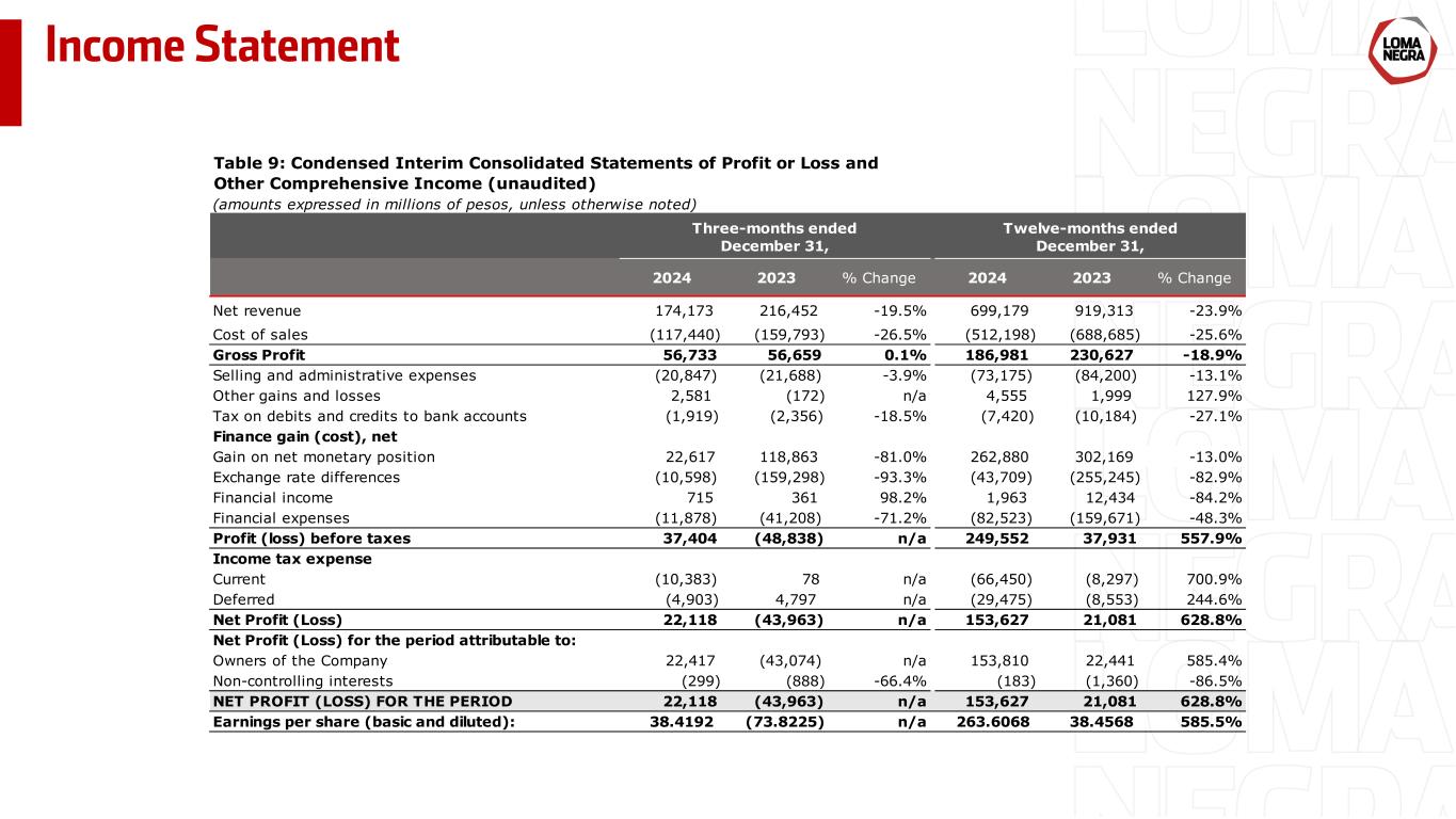 Income Statement (amounts expressed in millions of pesos, unless otherwise noted) 2024 2023 % Change 2024 2023 % Change Net revenue 174,173 216,452 -19.5% 699,179 919,313 -23.9% Cost of sales (117,440) (159,793) -26.5% (512,198) (688,685) -25.6% Gross Profit 56,733 56,659 0.1% 186,981 230,627 -18.9% Selling and administrative expenses (20,847) (21,688) -3.9% (73,175) (84,200) -13.1% Other gains and losses 2,581 (172) n/a 4,555 1,999 127.9% Tax on debits and credits to bank accounts (1,919) (2,356) -18.5% (7,420) (10,184) -27.1% Finance gain (cost), net Gain on net monetary position 22,617 118,863 -81.0% 262,880 302,169 -13.0% Exchange rate differences (10,598) (159,298) -93.3% (43,709) (255,245) -82.9% Financial income 715 361 98.2% 1,963 12,434 -84.2% Financial expenses (11,878) (41,208) -71.2% (82,523) (159,671) -48.3% Profit (loss) before taxes 37,404 (48,838) n/a 249,552 37,931 557.9% Income tax expense Current (10,383) 78 n/a (66,450) (8,297) 700.9% Deferred (4,903) 4,797 n/a (29,475) (8,553) 244.6% Net Profit (Loss) 22,118 (43,963) n/a 153,627 21,081 628.8% Net Profit (Loss) for the period attributable to: Owners of the Company 22,417 (43,074) n/a 153,810 22,441 585.4% Non-controlling interests (299) (888) -66.4% (183) (1,360) -86.5% NET PROFIT (LOSS) FOR THE PERIOD 22,118 (43,963) n/a 153,627 21,081 628.8% Earnings per share (basic and diluted): 38.4192 (73.8225) n/a 263.6068 38.4568 585.5% Table 9: Condensed Interim Consolidated Statements of Profit or Loss and Other Comprehensive Income (unaudited) Three-months ended December 31, Twelve-months ended December 31,