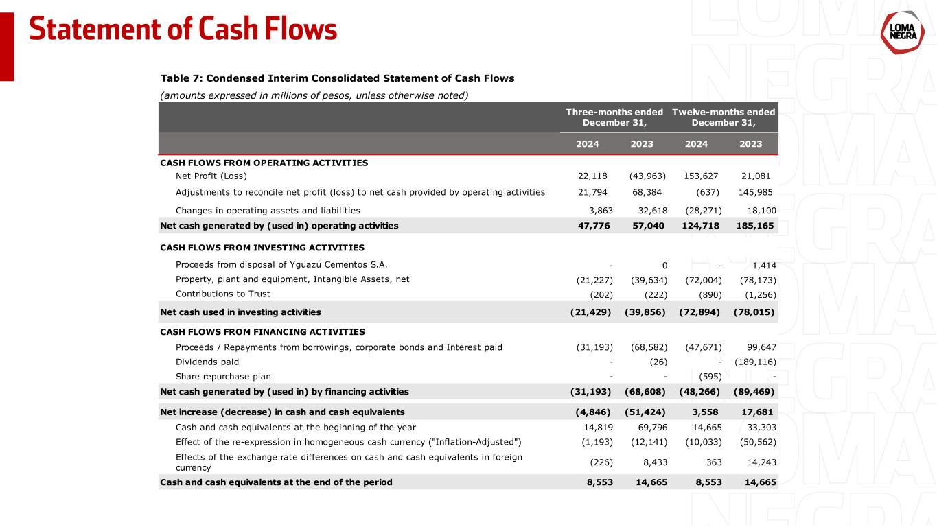 Statement of Cash Flows Table 7: Condensed Interim Consolidated Statement of Cash Flows (amounts expressed in millions of pesos, unless otherwise noted) 2024 2023 2024 2023 CASH FLOWS FROM OPERATING ACTIVITIES Net Profit (Loss) 22,118 (43,963) 153,627 21,081 Adjustments to reconcile net profit (loss) to net cash provided by operating activities 21,794 68,384 (637) 145,985 Changes in operating assets and liabilities 3,863 32,618 (28,271) 18,100 Net cash generated by (used in) operating activities 47,776 57,040 124,718 185,165 CASH FLOWS FROM INVESTING ACTIVITIES Proceeds from disposal of Yguazú Cementos S.A. - 0 - 1,414 Property, plant and equipment, Intangible Assets, net (21,227) (39,634) (72,004) (78,173) Contributions to Trust (202) (222) (890) (1,256) Net cash used in investing activities (21,429) (39,856) (72,894) (78,015) CASH FLOWS FROM FINANCING ACTIVITIES Proceeds / Repayments from borrowings, corporate bonds and Interest paid (31,193) (68,582) (47,671) 99,647 Dividends paid - (26) - (189,116) Share repurchase plan - - (595) - Net cash generated by (used in) by financing activities (31,193) (68,608) (48,266) (89,469) Net increase (decrease) in cash and cash equivalents (4,846) (51,424) 3,558 17,681 Cash and cash equivalents at the beginning of the year 14,819 69,796 14,665 33,303 Effect of the re-expression in homogeneous cash currency ("Inflation-Adjusted") (1,193) (12,141) (10,033) (50,562) Effects of the exchange rate differences on cash and cash equivalents in foreign currency (226) 8,433 363 14,243 Cash and cash equivalents at the end of the period 8,553 14,665 8,553 14,665 Twelve-months ended December 31, Three-months ended December 31,