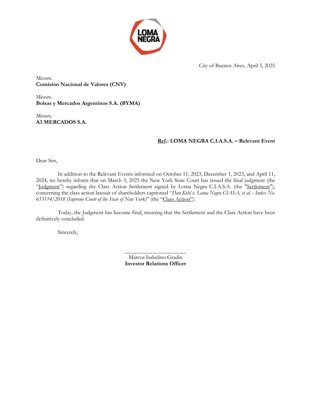 City of Buenos Aires, April 3, 2025 Messrs. Comisión Nacional de Valores (CNV) Messrs. Bolsas y Mercados Argentinos S.A. (BYMA) Messrs. A3 MERCADOS S.A. Ref.: LOMA NEGRA C.I.A.S.A. – Relevant Event Dear Sirs, In addition to the Relevant Events informed on October 11, 2023, December 1, 2023, and April 11, 2024, we hereby inform that on March 3, 2025 the New York State Court has issued the final judgment (the “Judgment”) regarding the Class Action Settlement signed by Loma Negra C.I.A.S.A. (the "Settlement"), concerning the class action lawsuit of shareholders captioned “Dan Kohl v. Loma Negra CIASA, et al. - Index No. 653114/2018 (Supreme Court of the State of New York)” (the “Class Action”). Today, the Judgment has become final, meaning that the Settlement and the Class Action have been definitively concluded. Sincerely, ______________________ Marcos Isabelino Gradin Investor Relations Officer